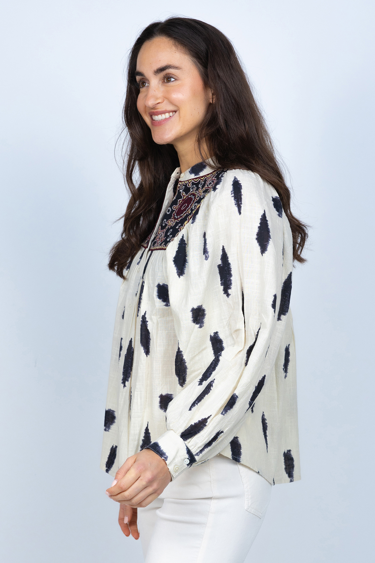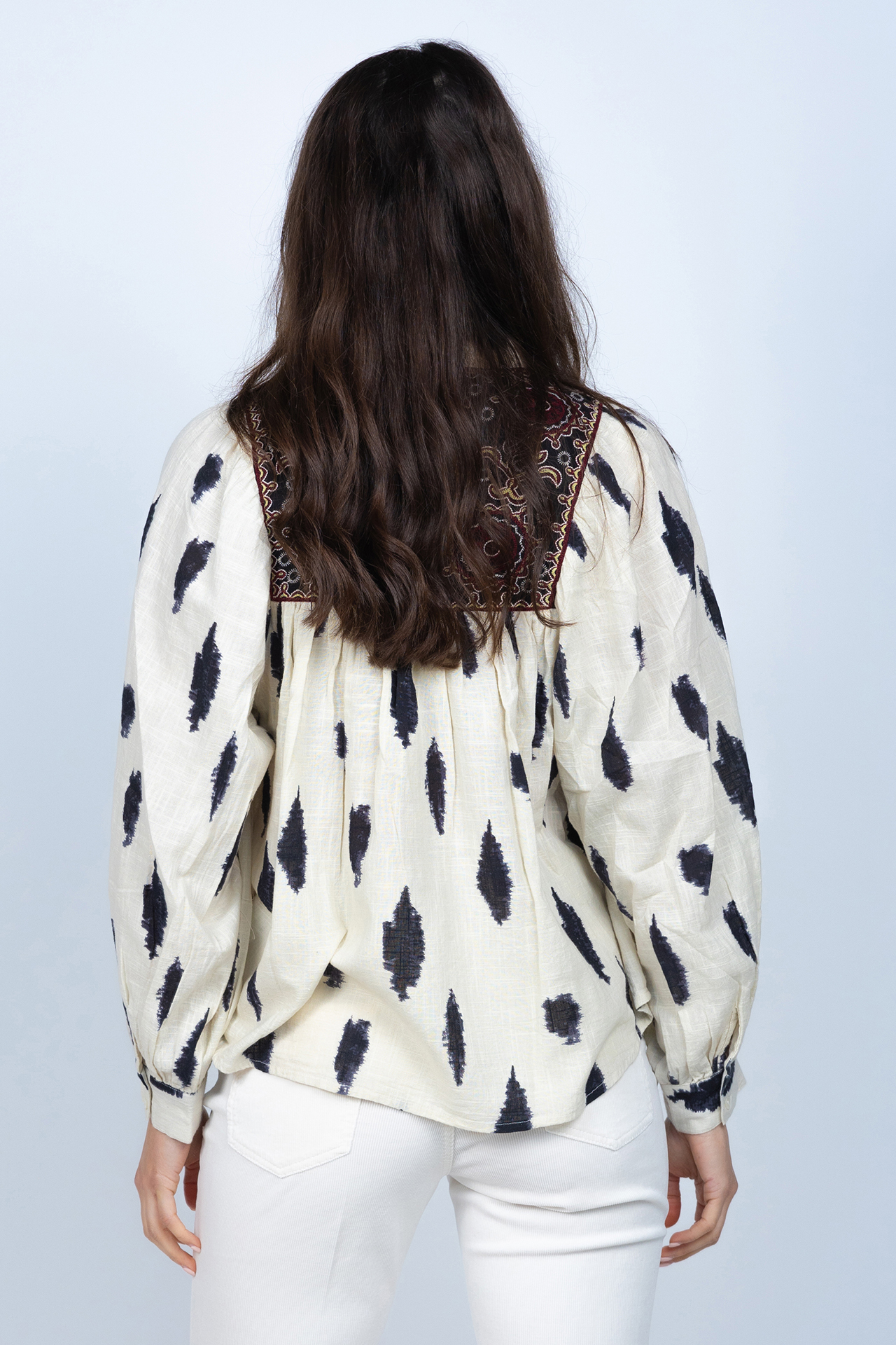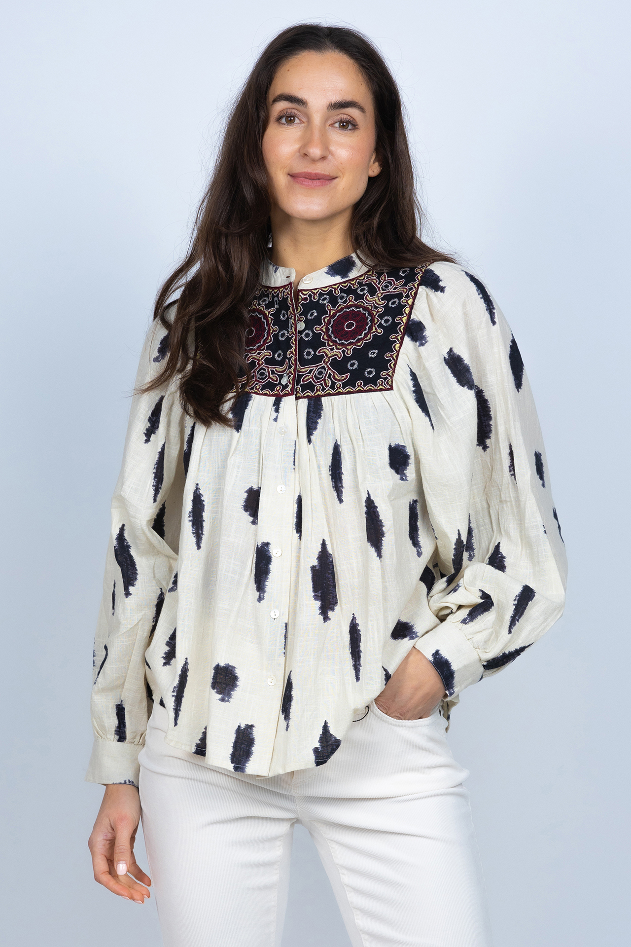 Katoenen blouse met vlekken, pofmouwen en een geborduurde bovenkant