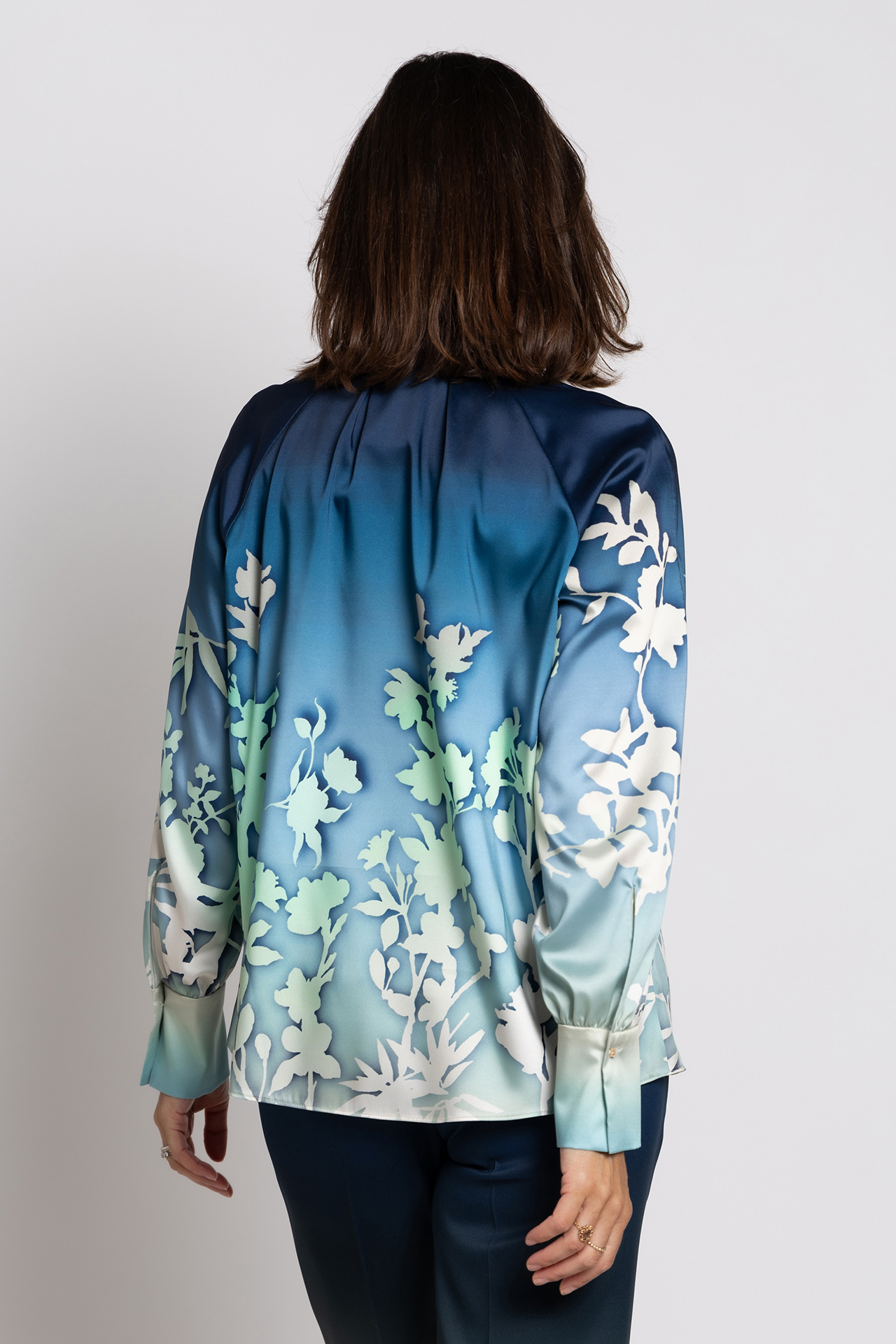 Blouse met een bladerenprint met kleurverloop van blauw naar mintgroen. Hij heeft wijde mouwen en een strik aan de hals