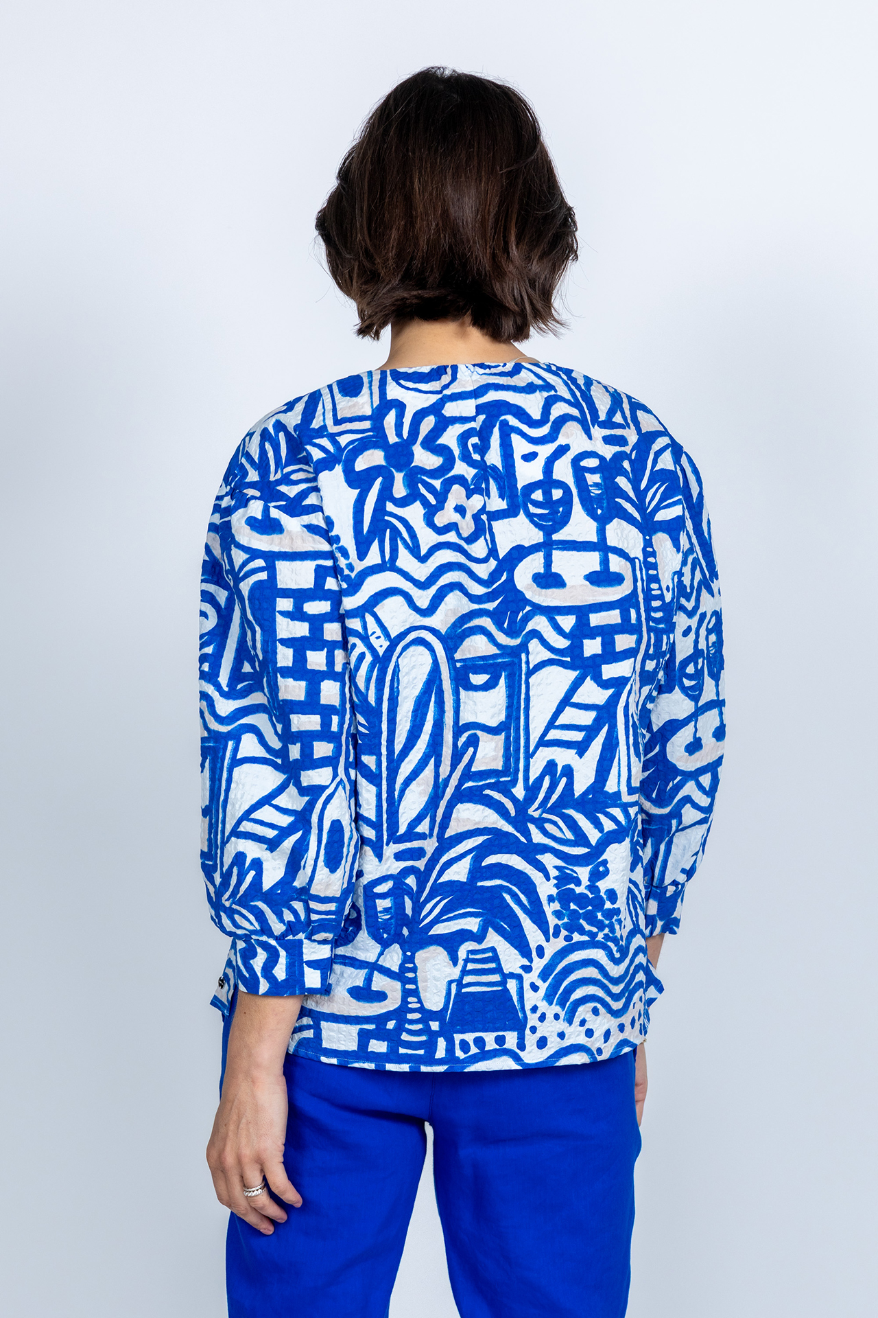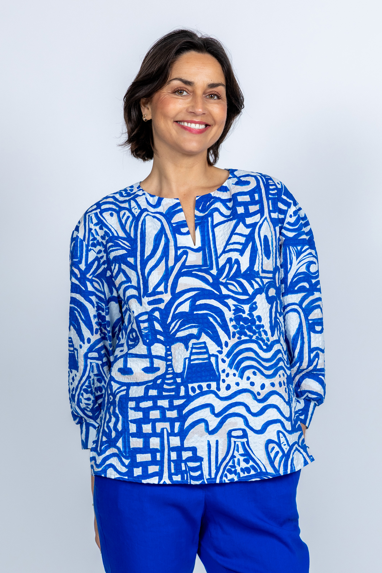 Katoenen blouse met een ronde hals met V-uitsparing. Hij heeft driekwart mouwen, een drukke kobaltblauwe print en splitten aan de zijkant