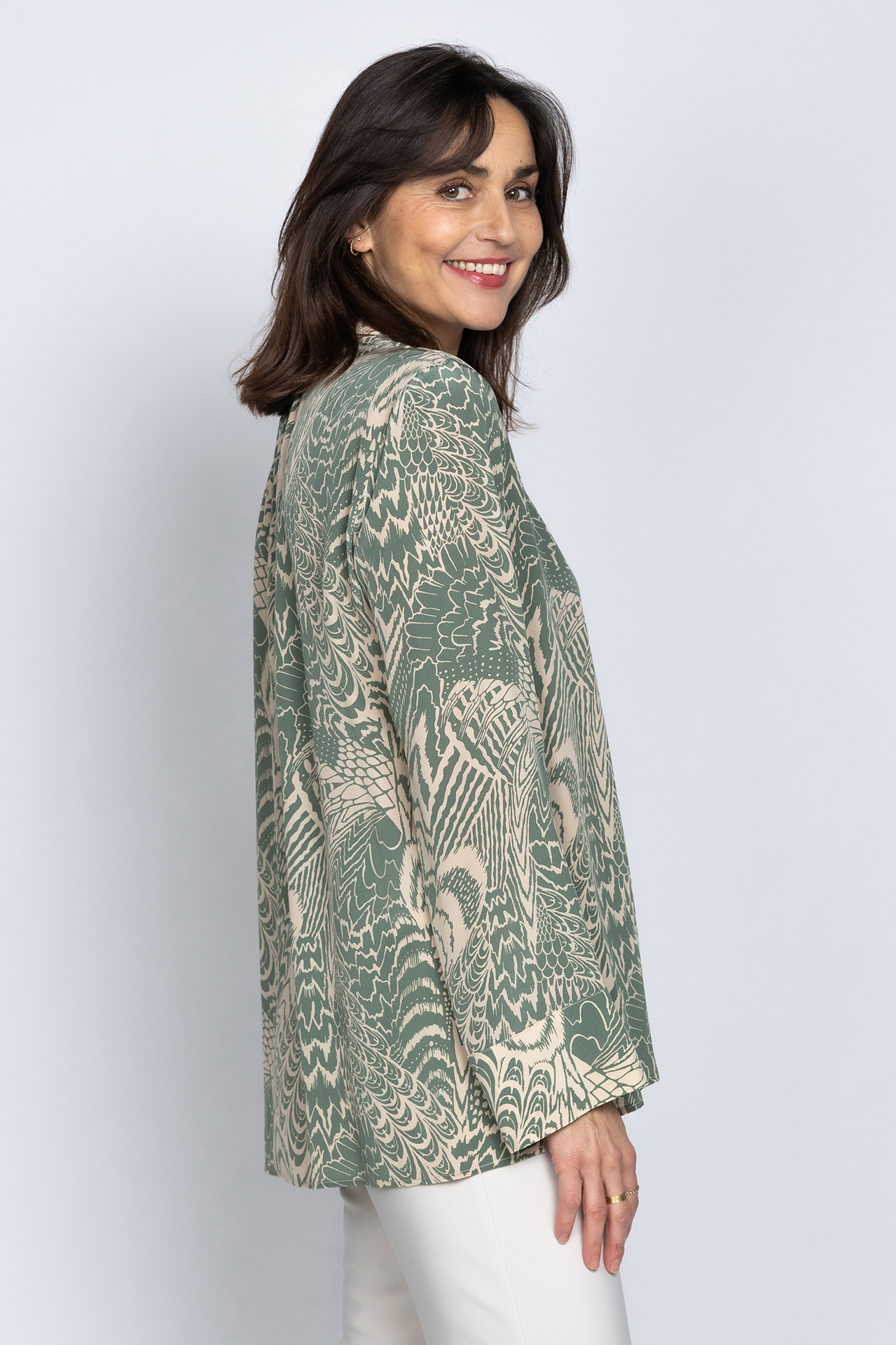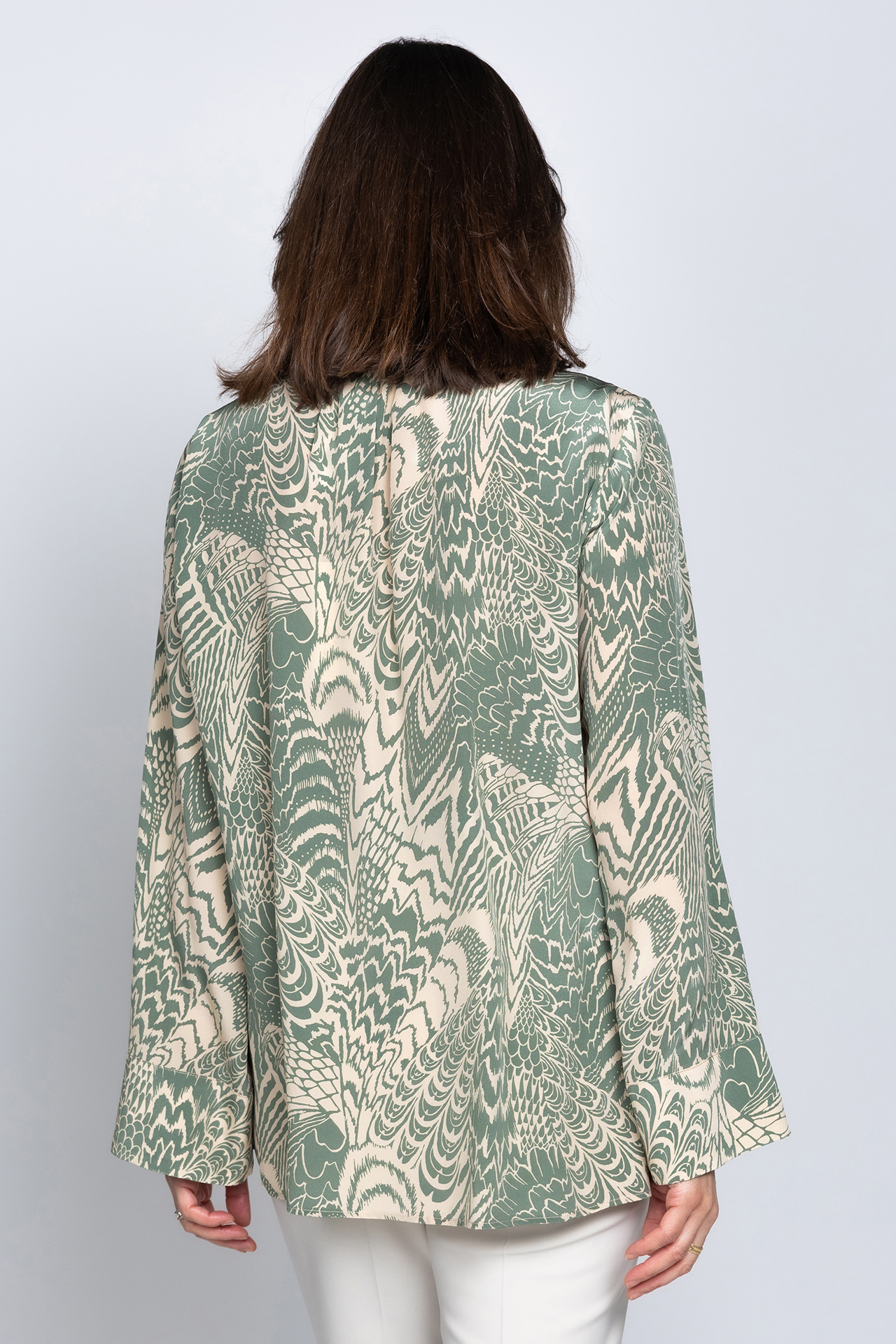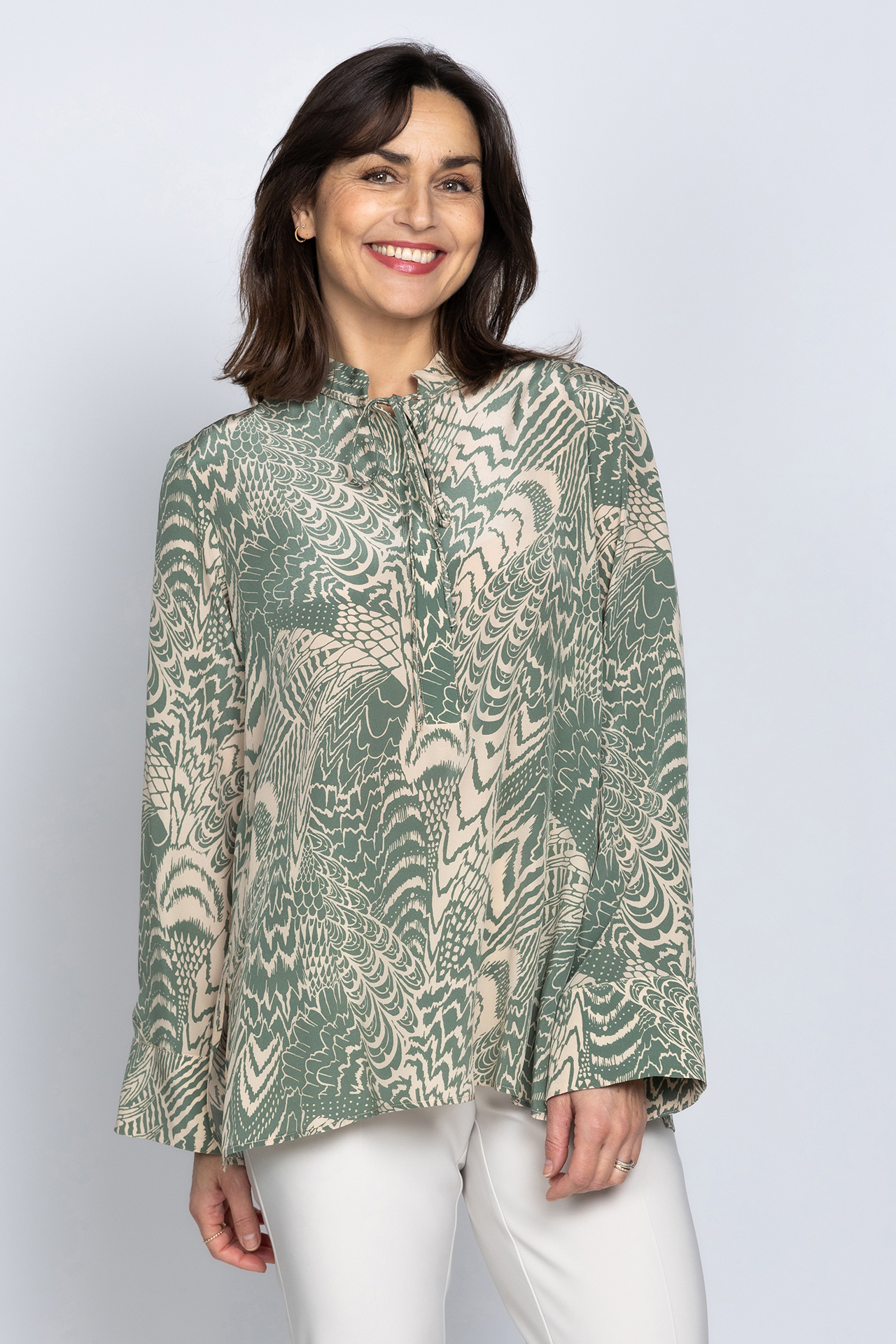 Zijde blouse met lange mouwen, een ronde hals met strikkoordje en een sjieke all-over print in groen/beige