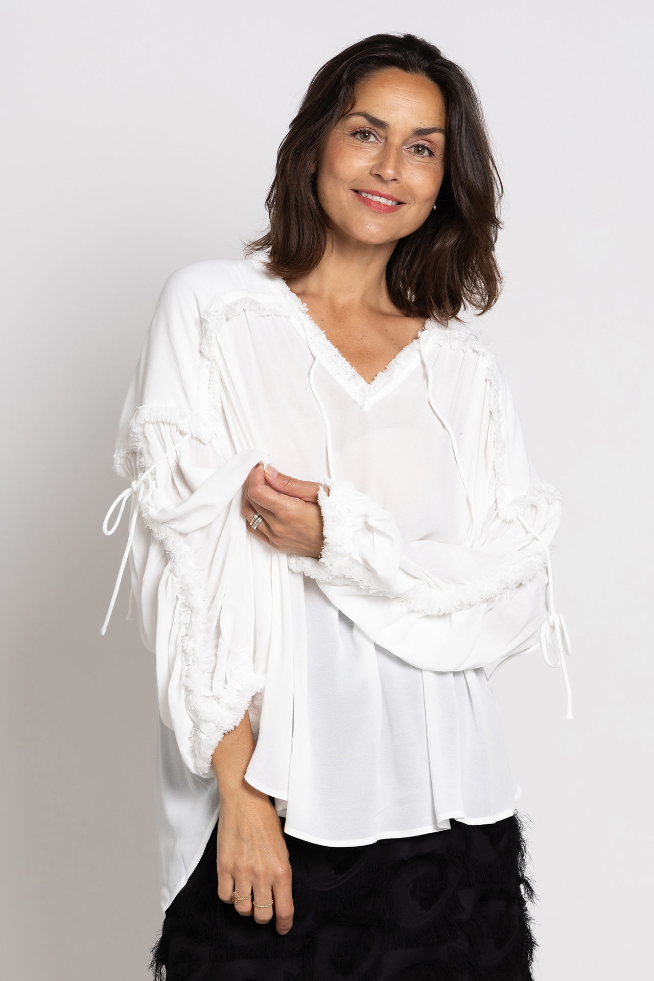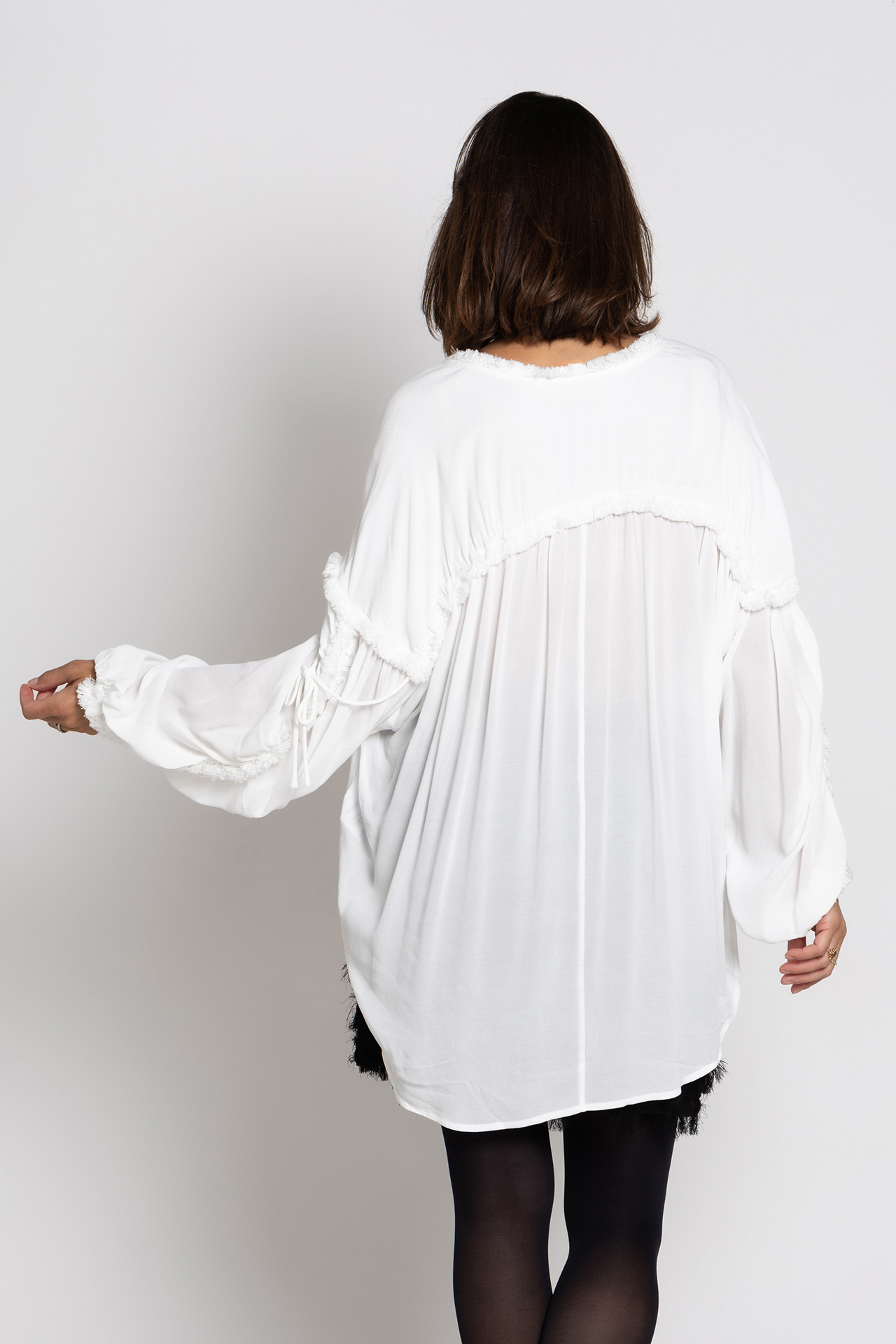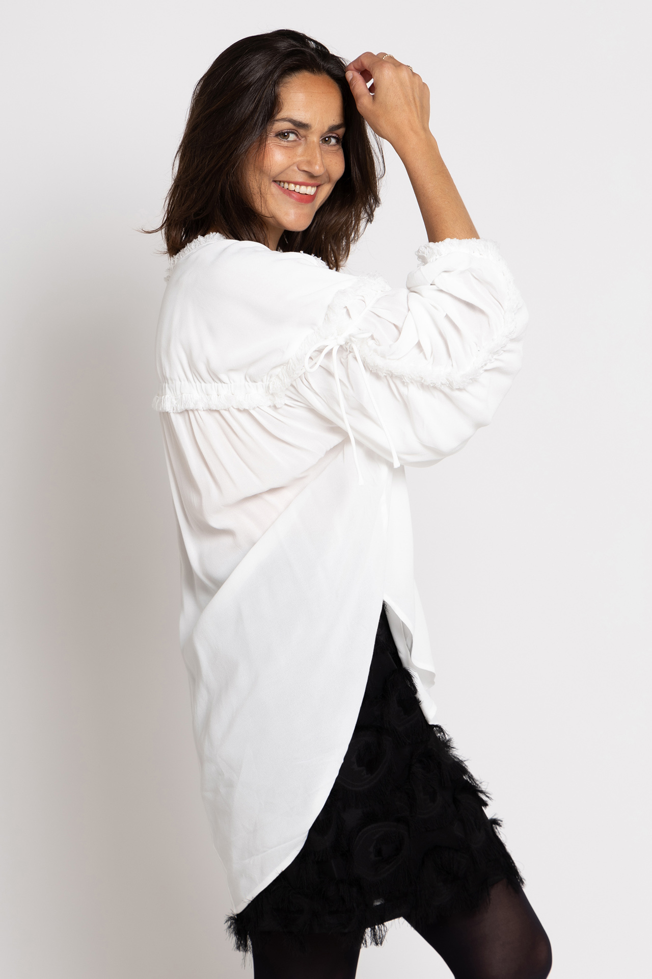 Viscose blouse met een V-hals, lange mouwen met ophaalkoordje en de achterkant is langer dan de voorkant