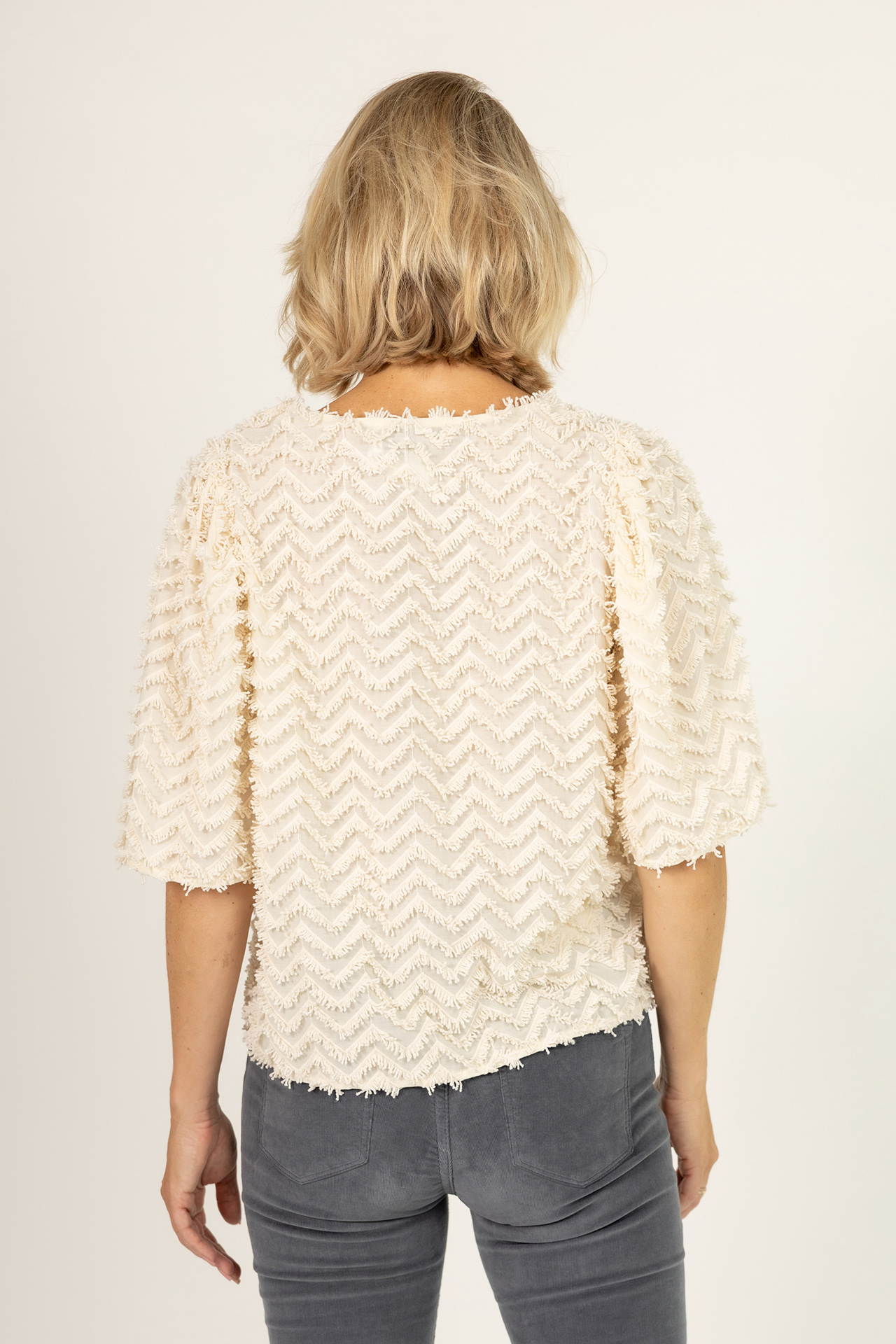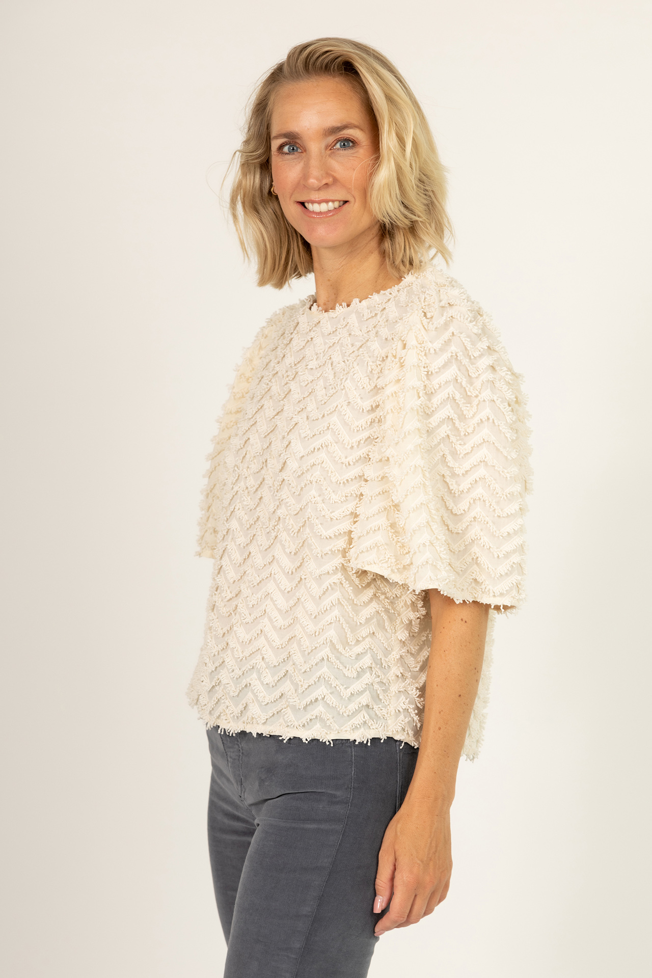 Blouse met een ronde hals, wijde halflange mouwen en hij heeft all-over subtiele franjes