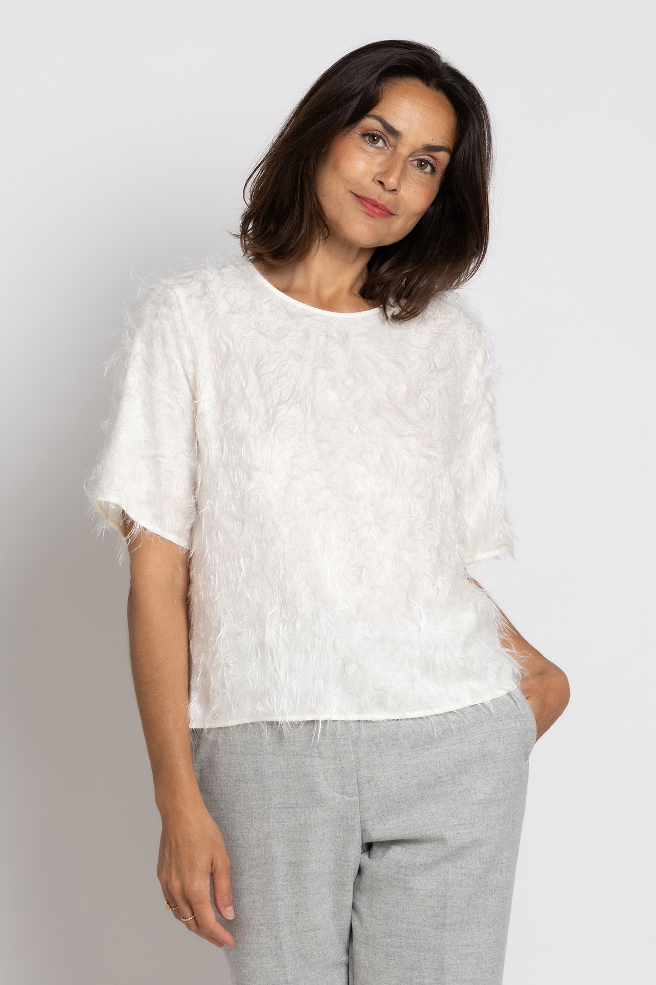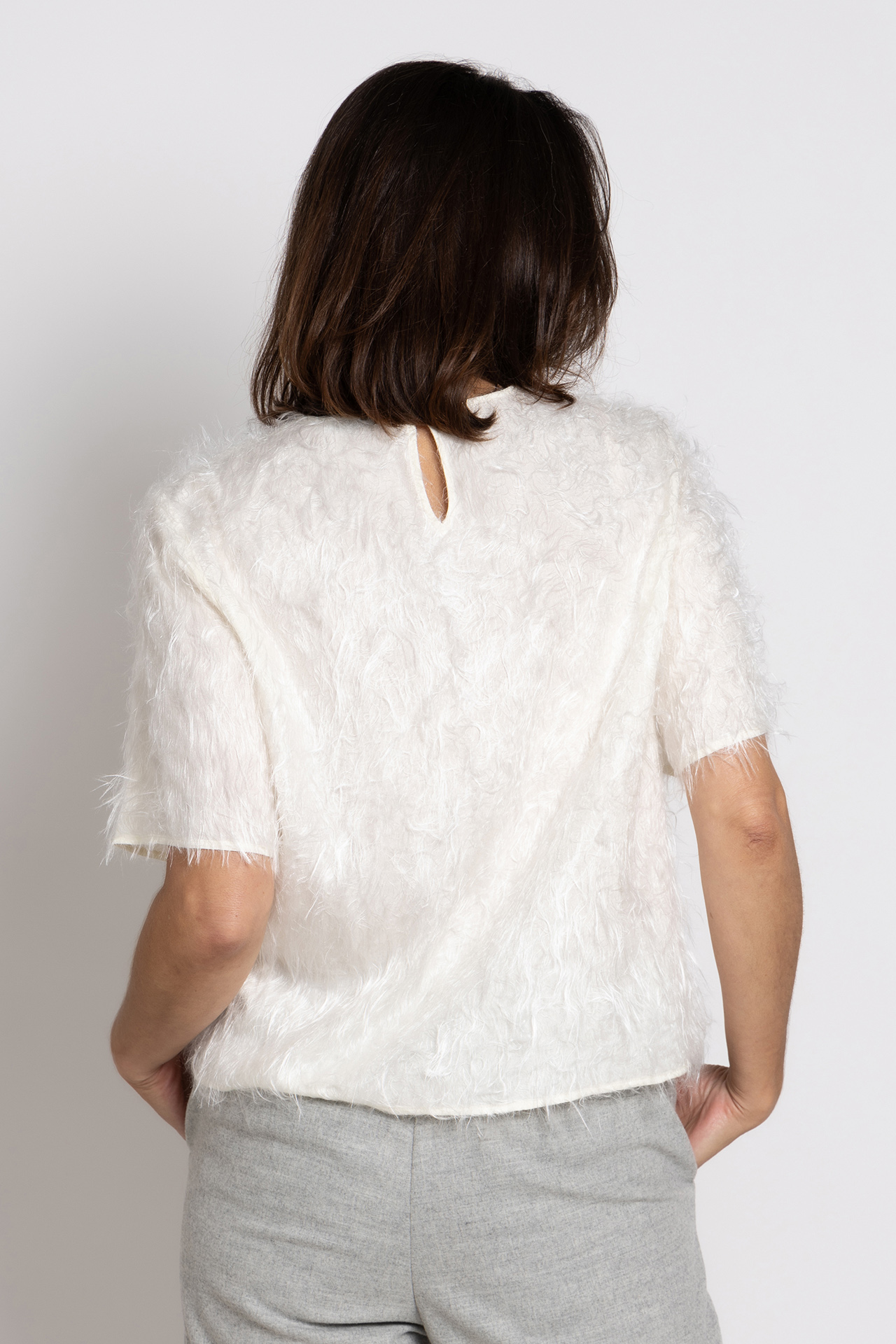 Harige blouse met korte mouwen, een ronde hals en een opening met knoopje aan de achterkant