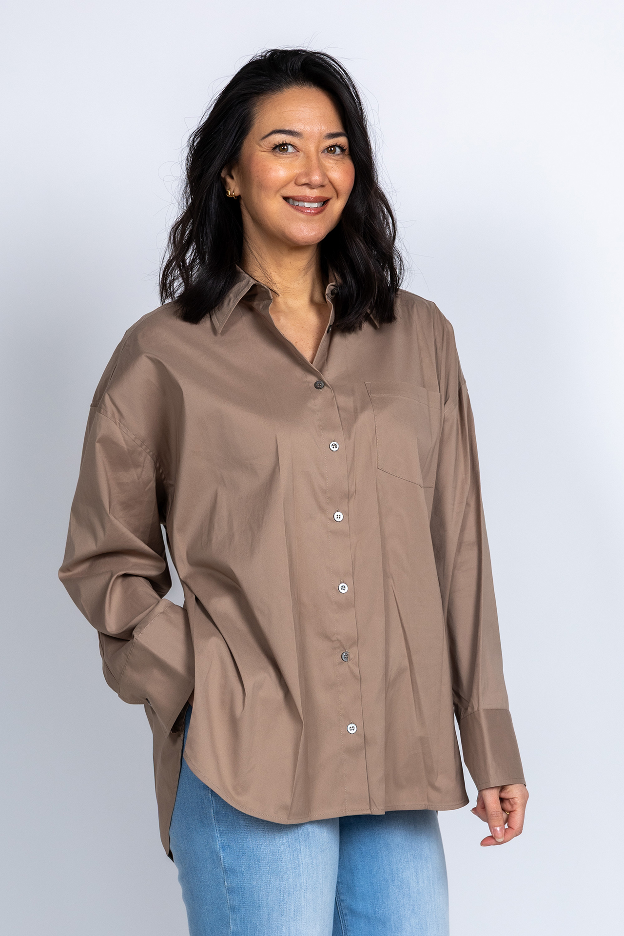Loose fit blouse met lange mouwen en manchetten. Hij heeft hoge splitten aan de zijkant, een borstzak en stretch in de stof waardoor hij heerlijk zit