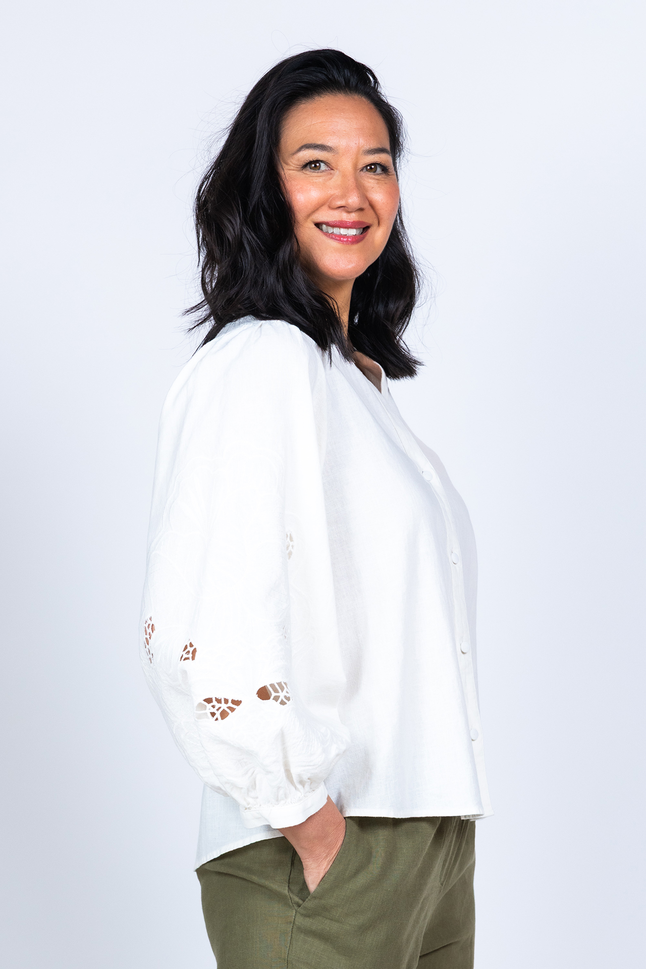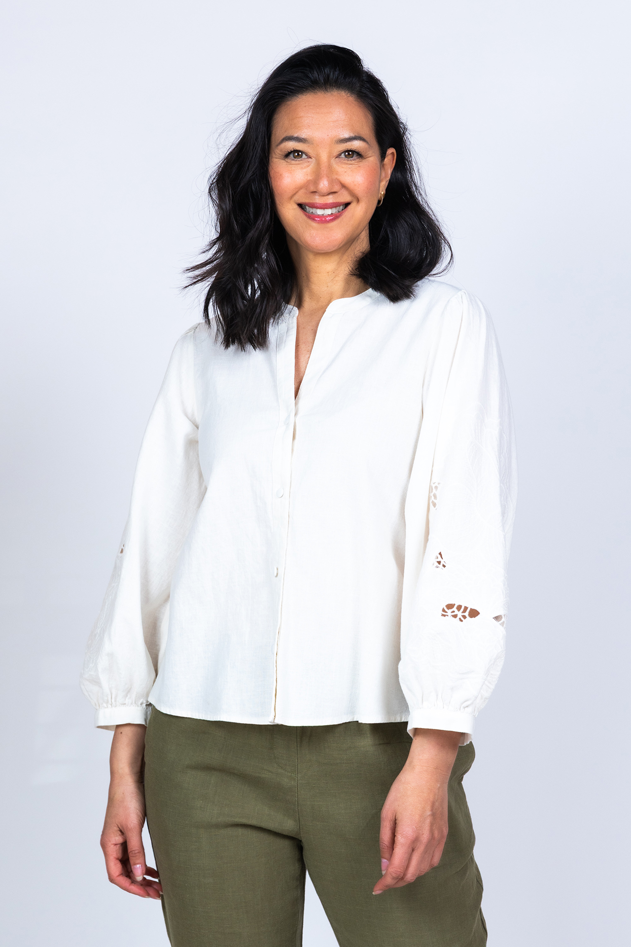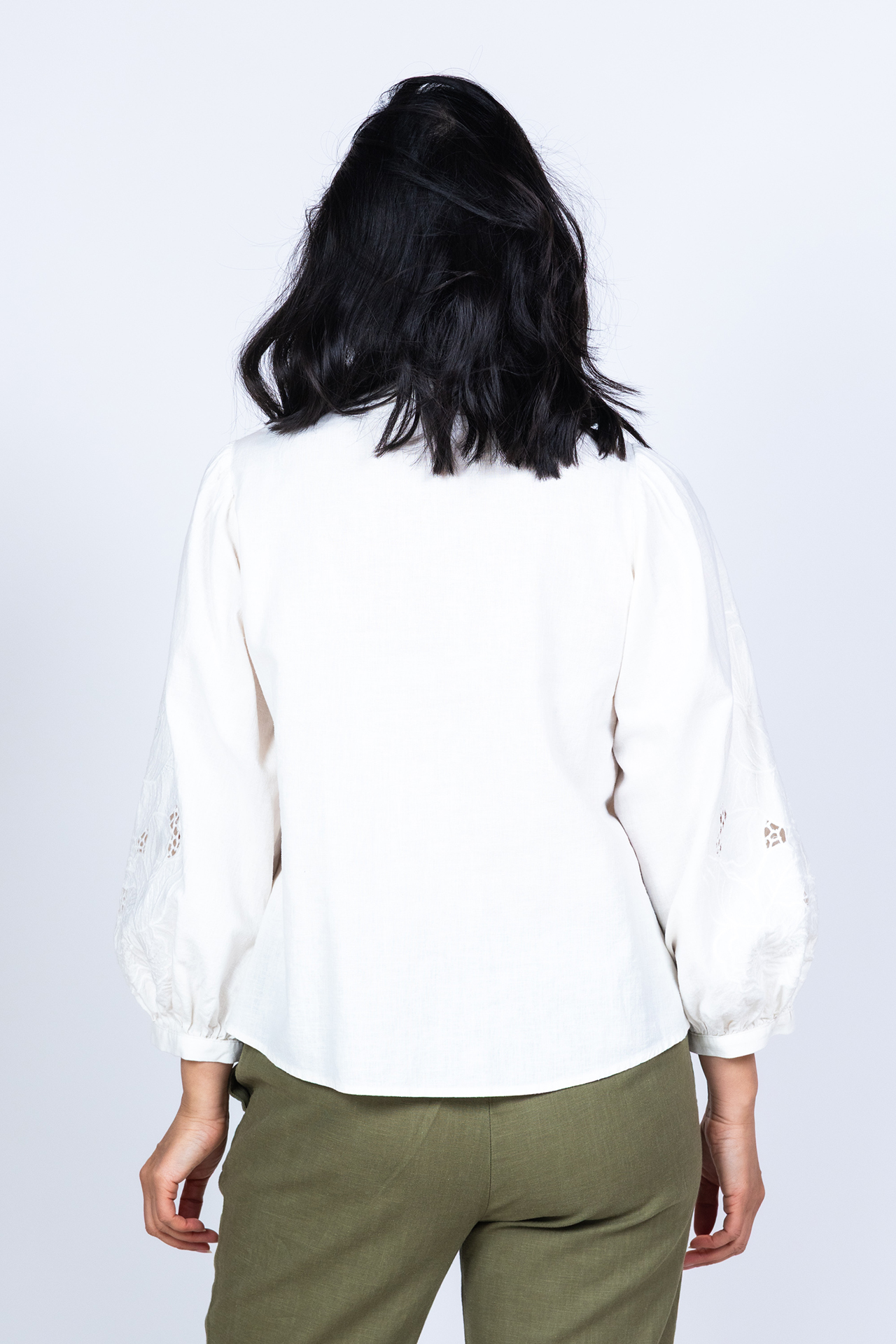 Katoen- en linnenmix blouse met een ronde hals, pofmouwen en opengewerkte details in de mouwen