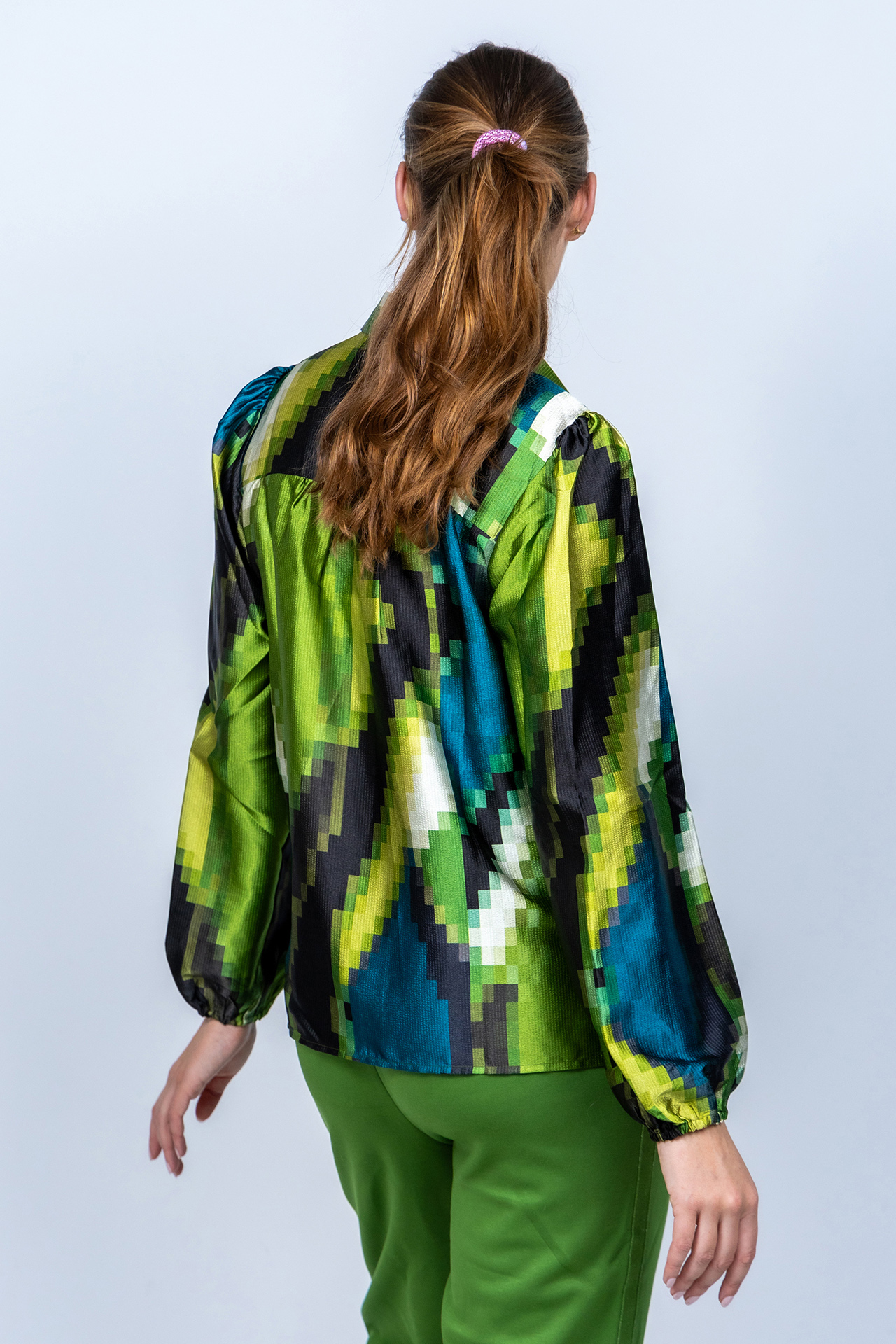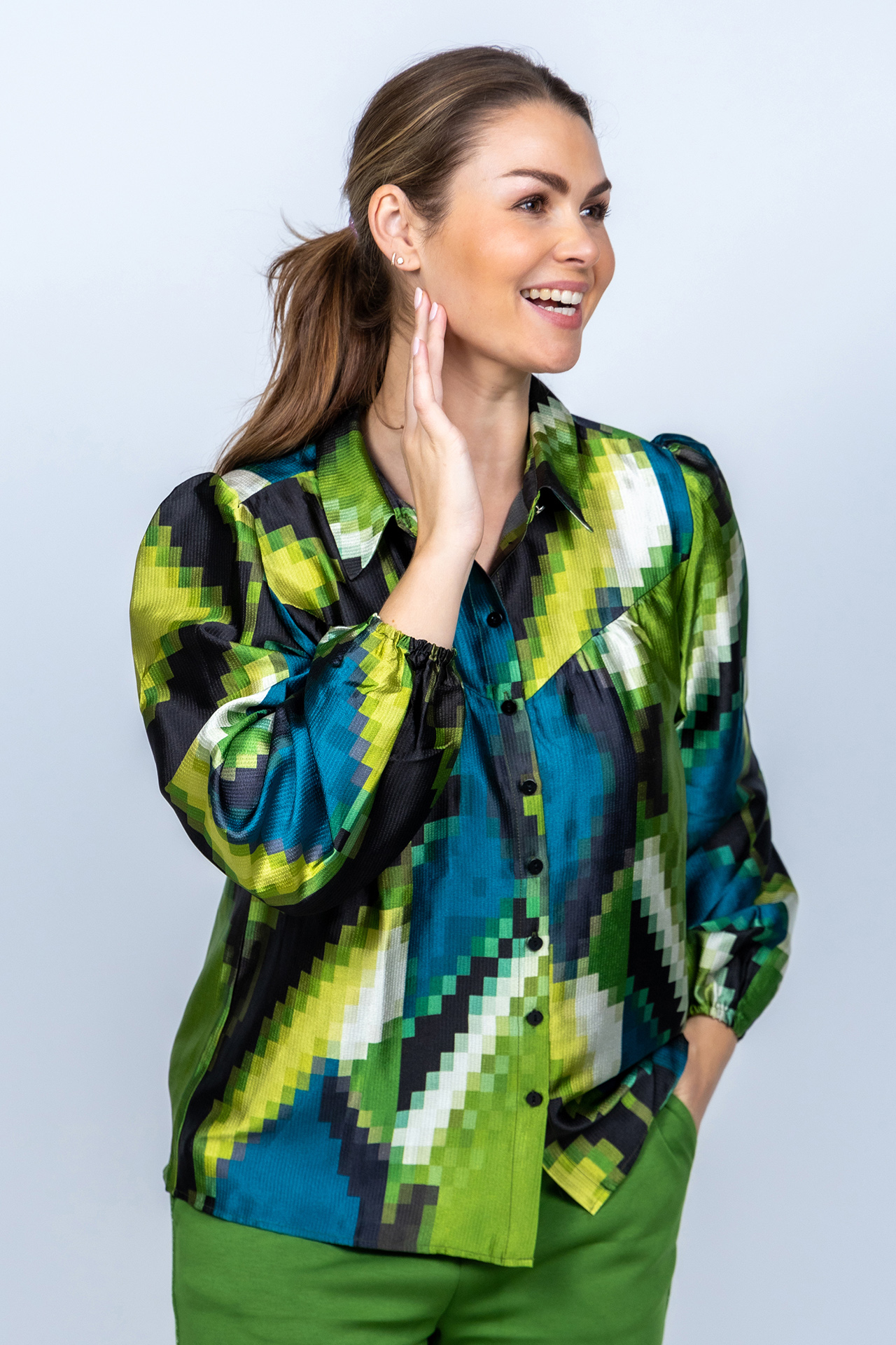 Blouse met pofmouwen en een drukke print in groen/blauw tinten