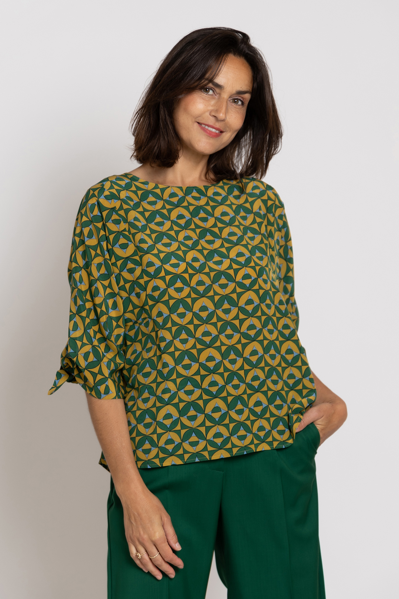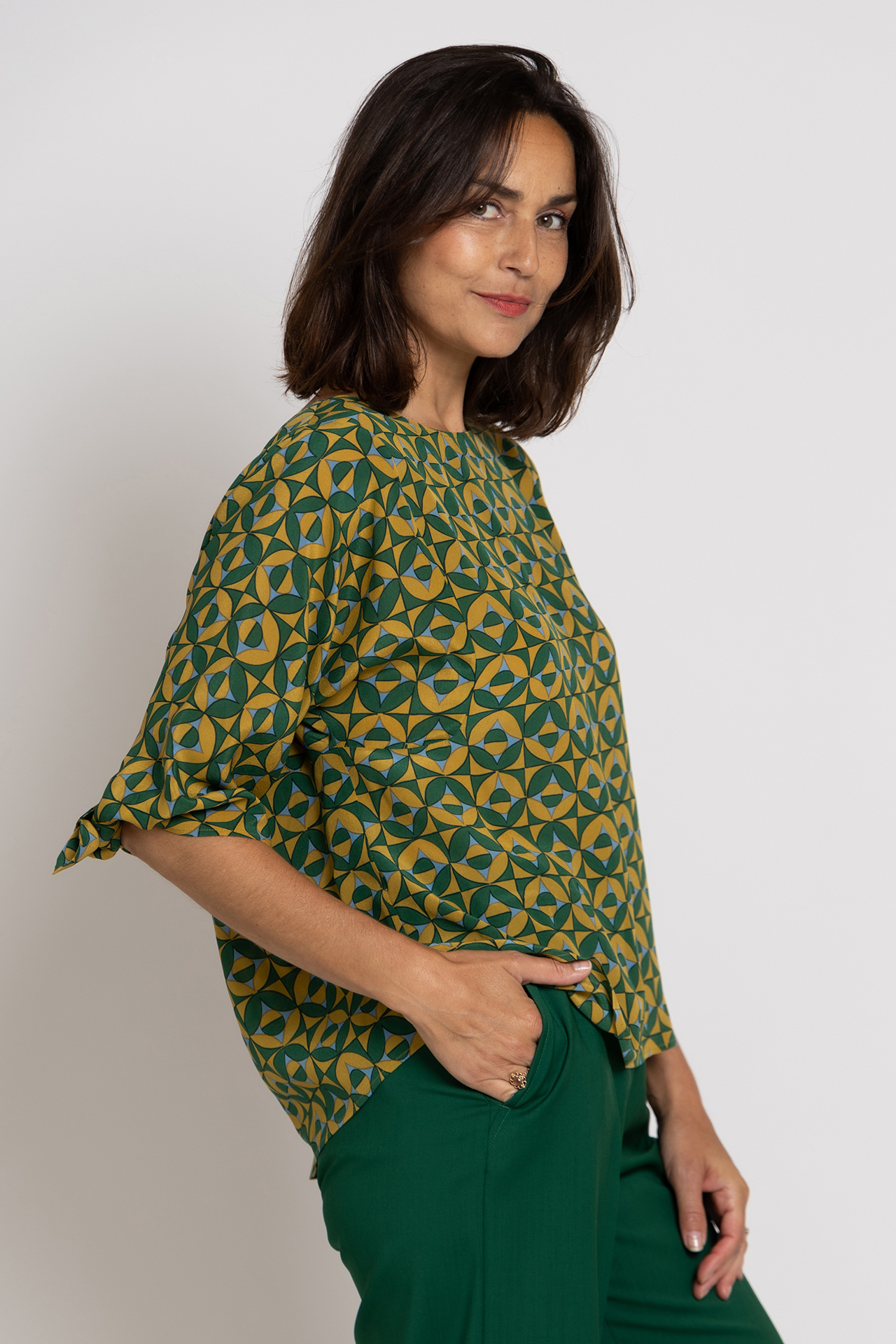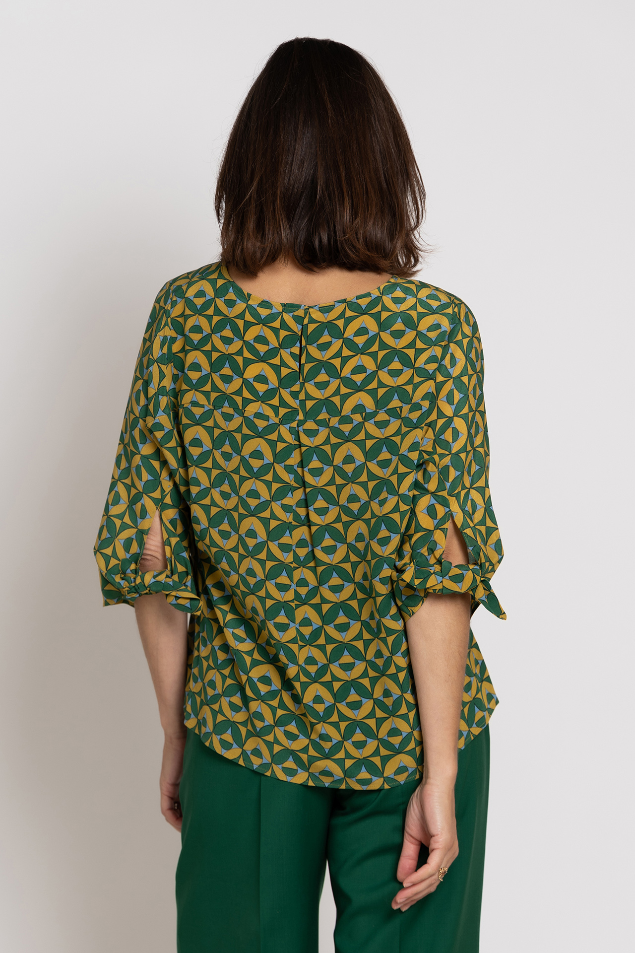 Zijde blouse met een ronde hals, strikjes aan de achterkant van de mouwen en hij heeft een grafisch dessin in geel en groen
