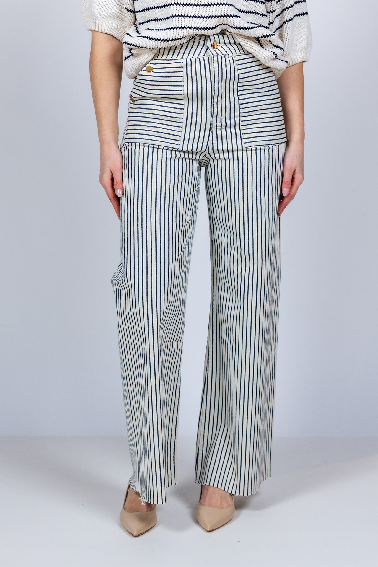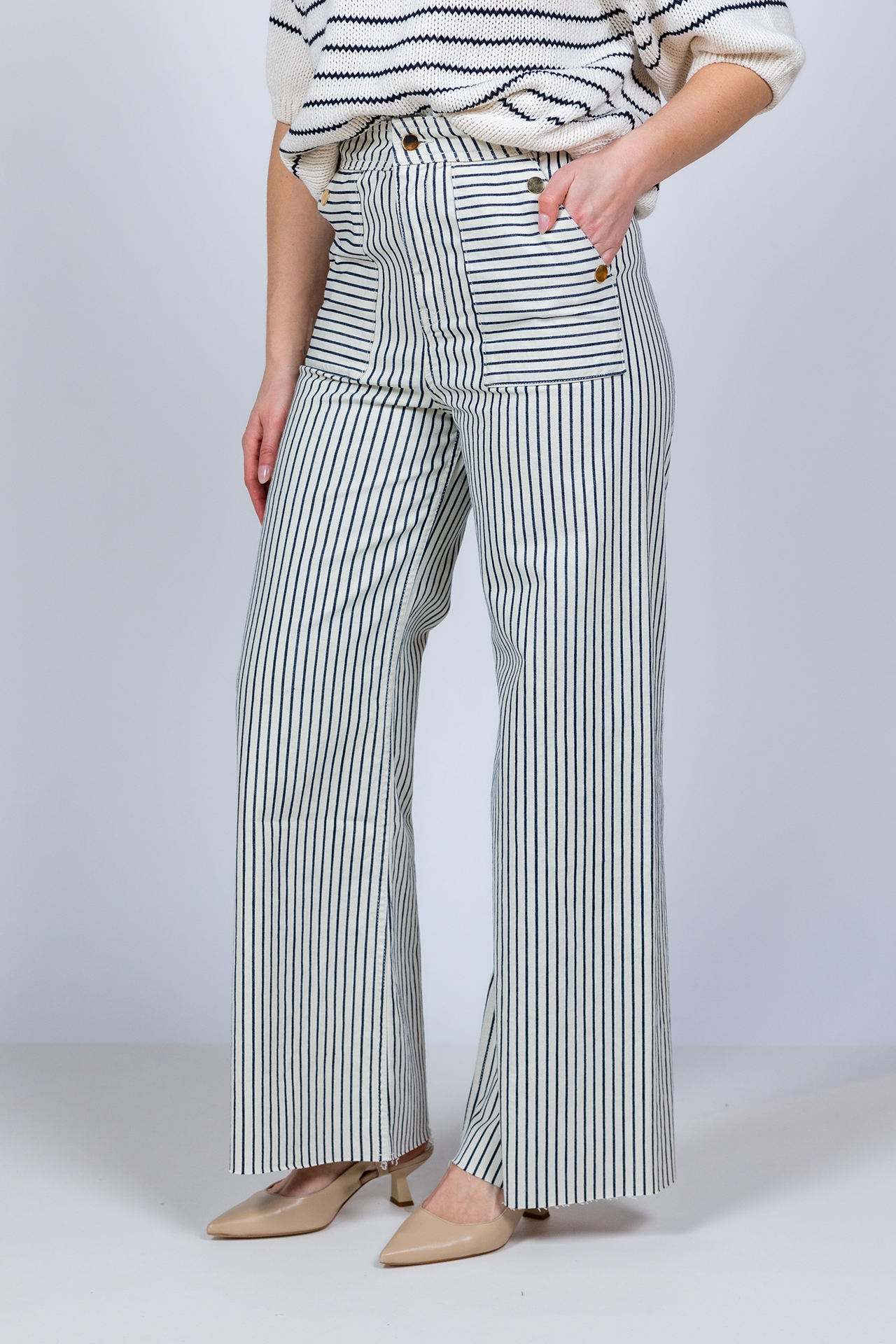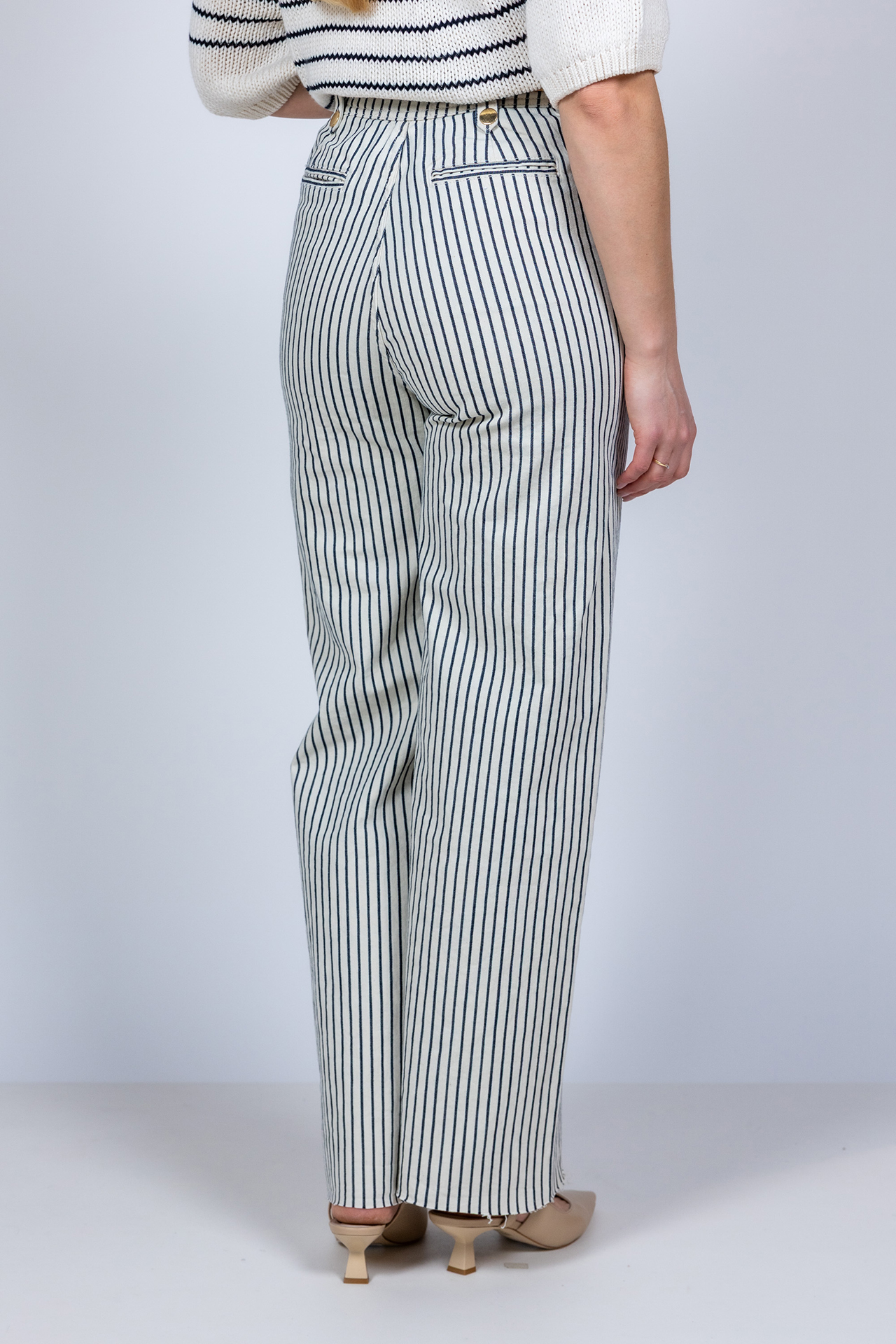 Katoenen broek met wijde pijpen en een knoop- en ritssluiting. Hij heeft steekzakken aan de voorkant, fake zakken aan de achterkant, een streepdessin en een klein beetje stretch in de stof waardoor hij comfortabel draagt