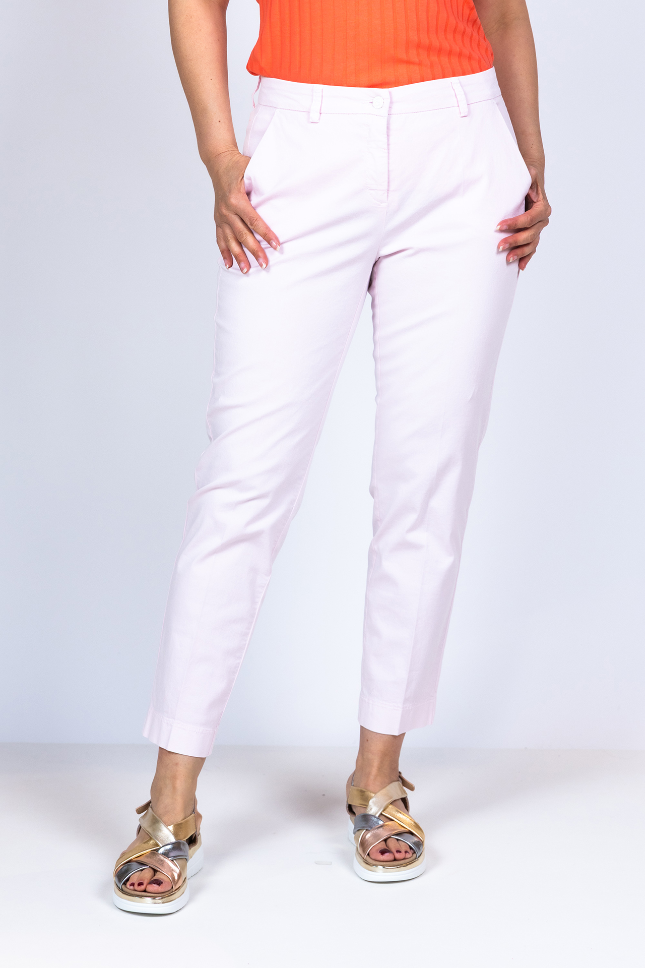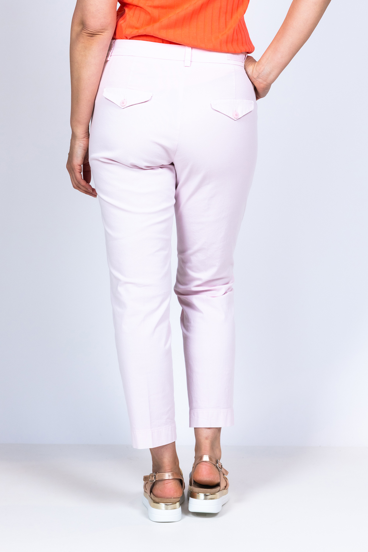 7/8 broek met een knoop- en ritssluiting en lusjes in de band. Hij heeft steekzakken aan de voorkant, klepzakken aan de achterkant en een klein beetje stretch in de stof waardoor hij mooi valt en lekker zit