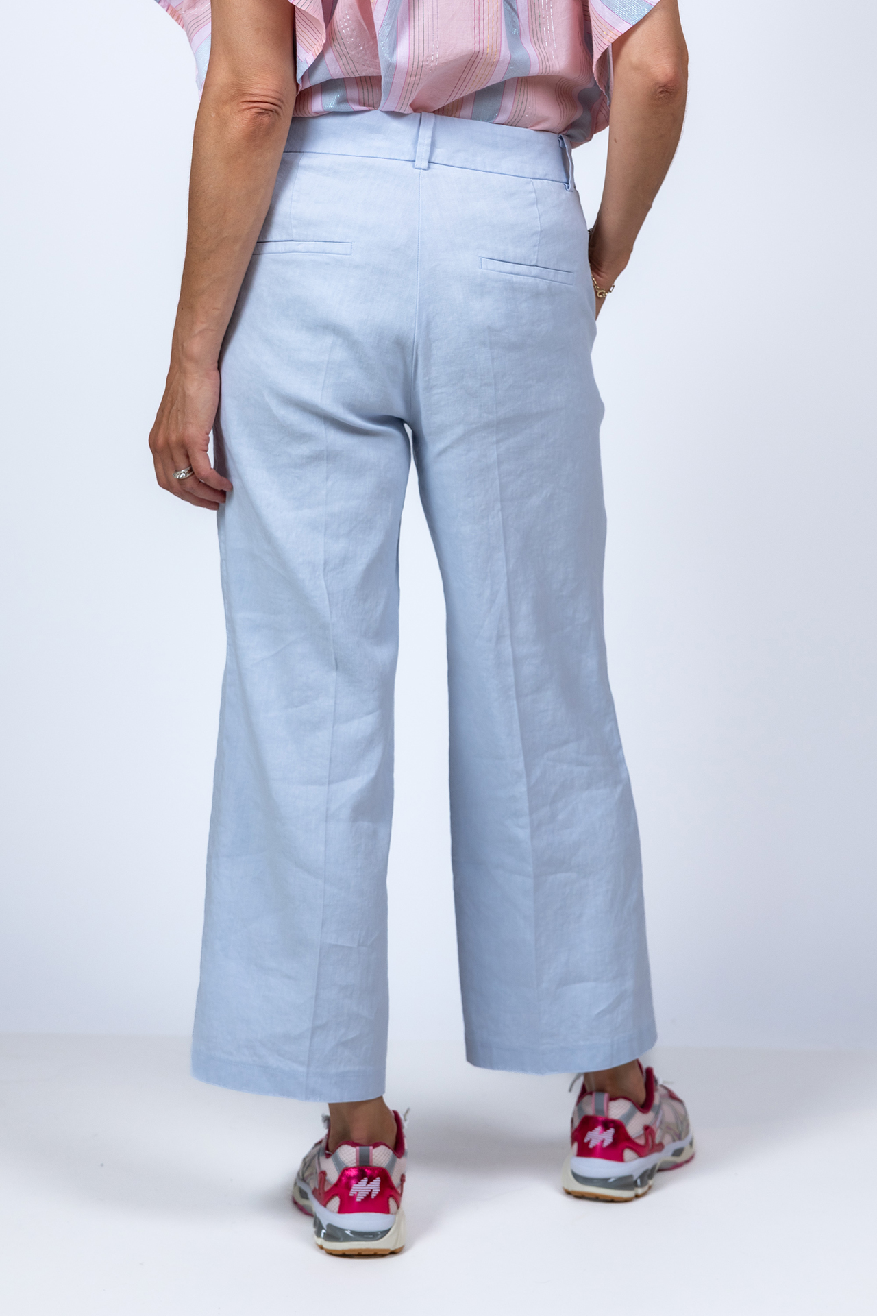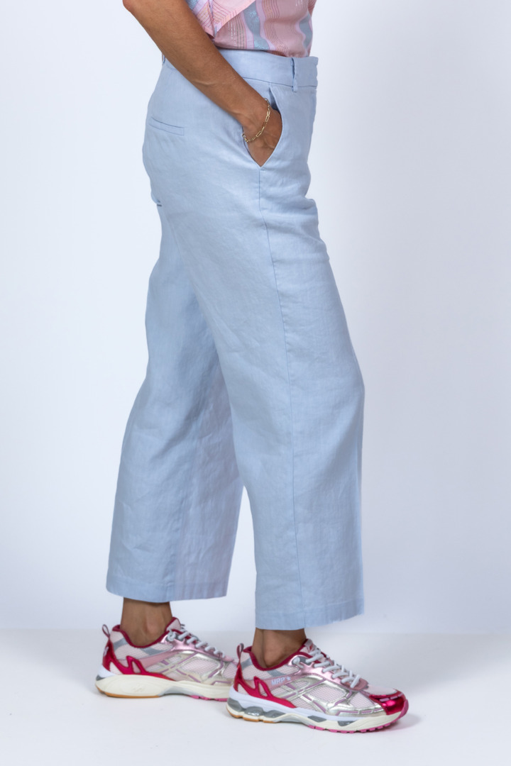 Linnenmix broek met een haak- en ritssluiting en lusjes in de band voor een ceintuur. Hij heeft steekzakken aan de voorkant en fake zakken aan de achterkant