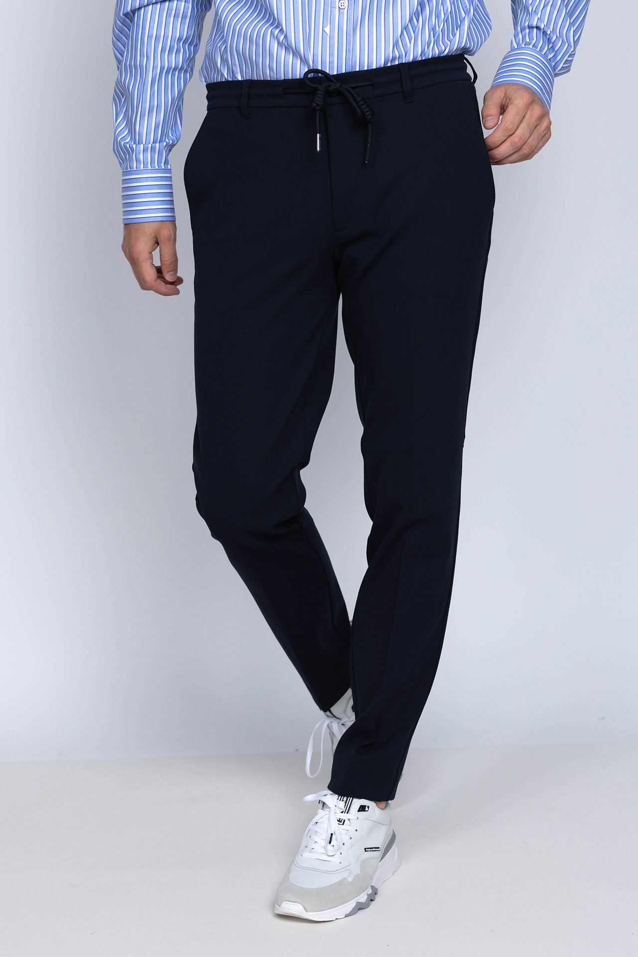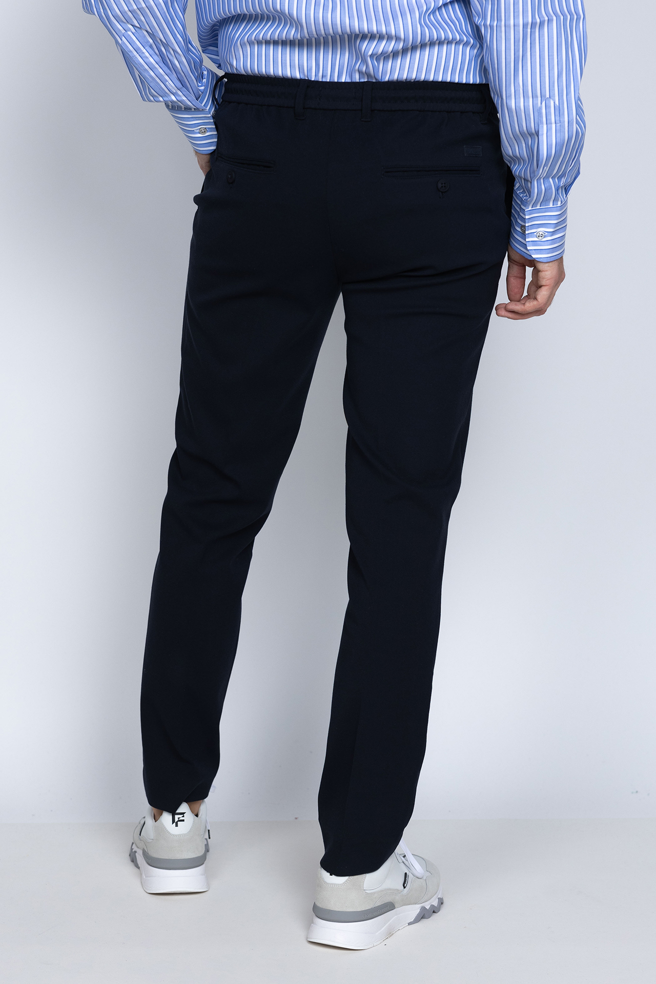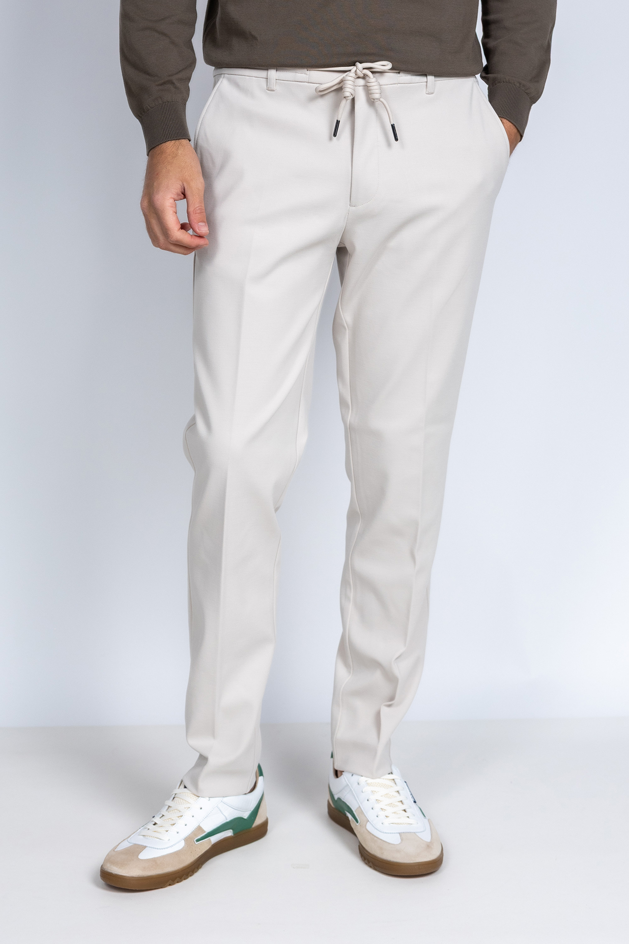 Broek met een elastische band met strikkoordje in de taille, steekzakken aan de voorkant en paspelzakken aan de achterkant
