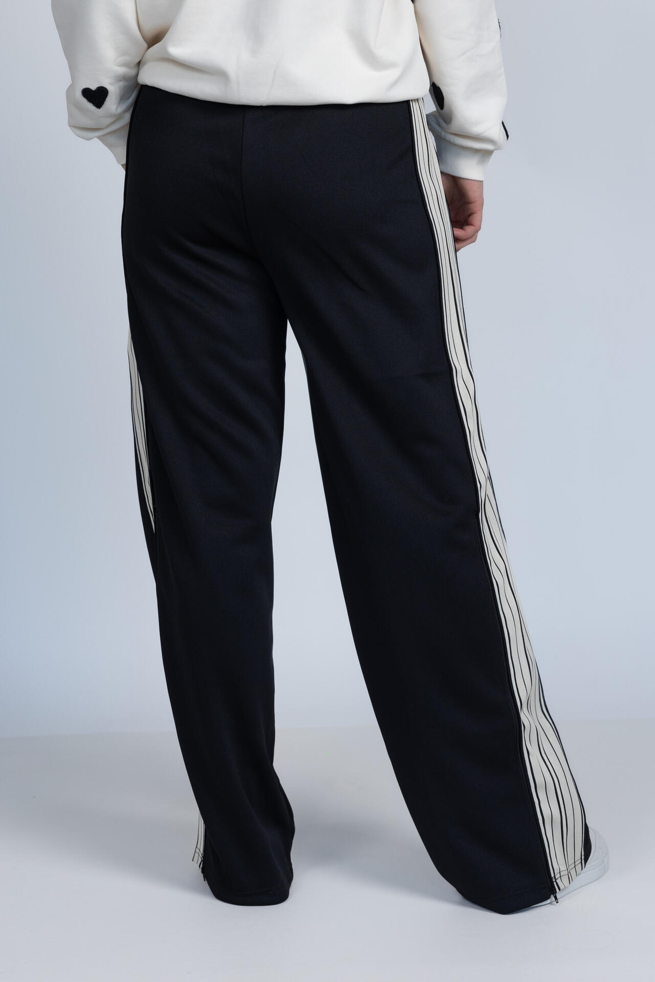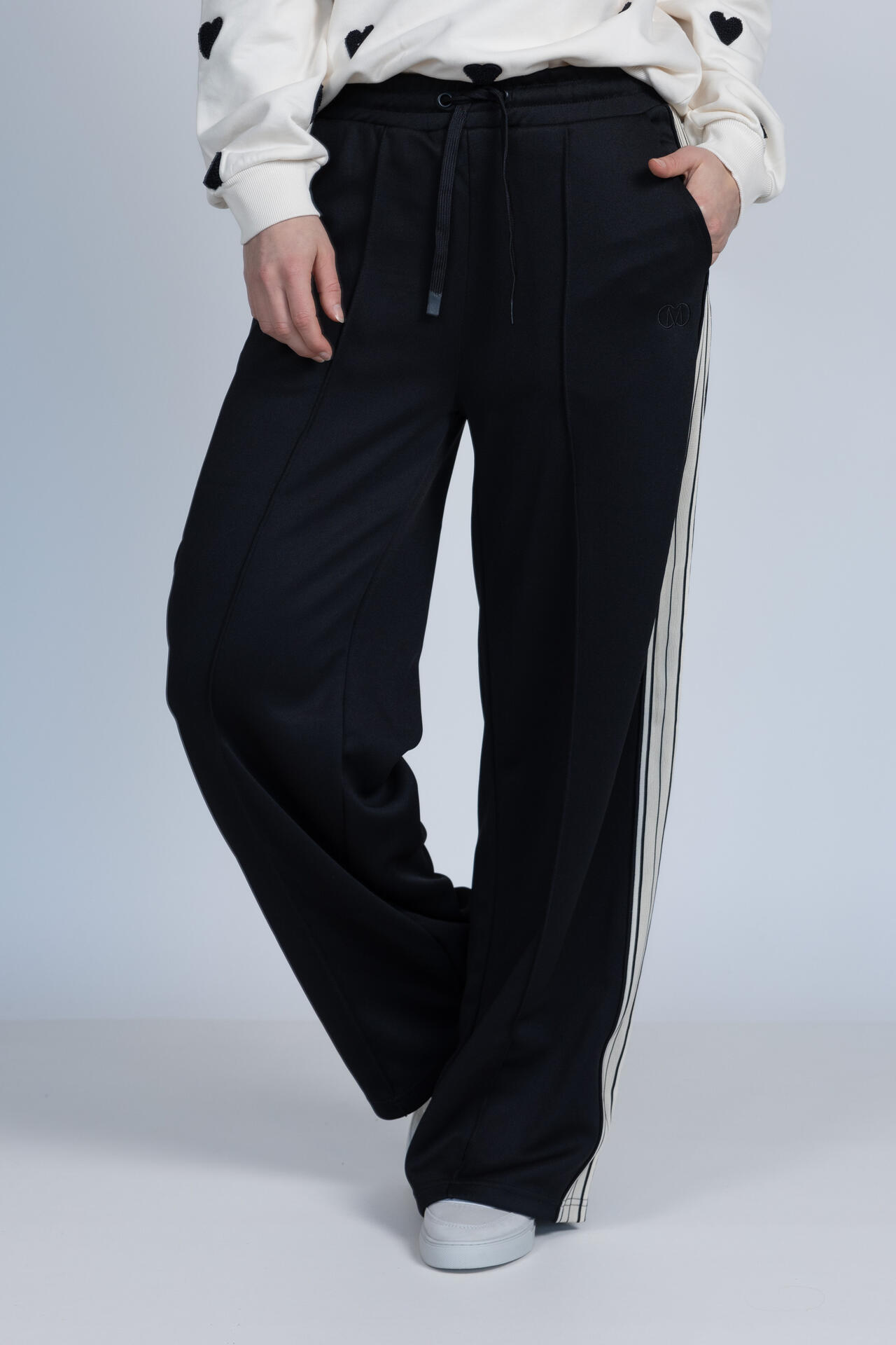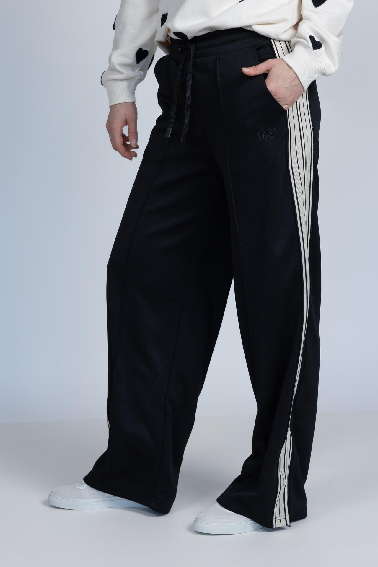 Soepel vallende broek met wijde pijpen en een elastische band met koordje in de taille. Hij heeft een bies aan de zijkant, doorgestikte naad aan de voorkant en steekzakken