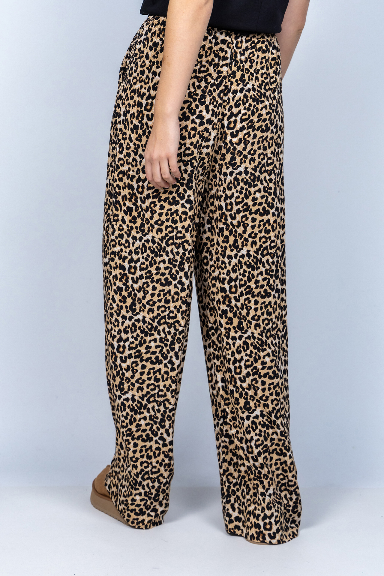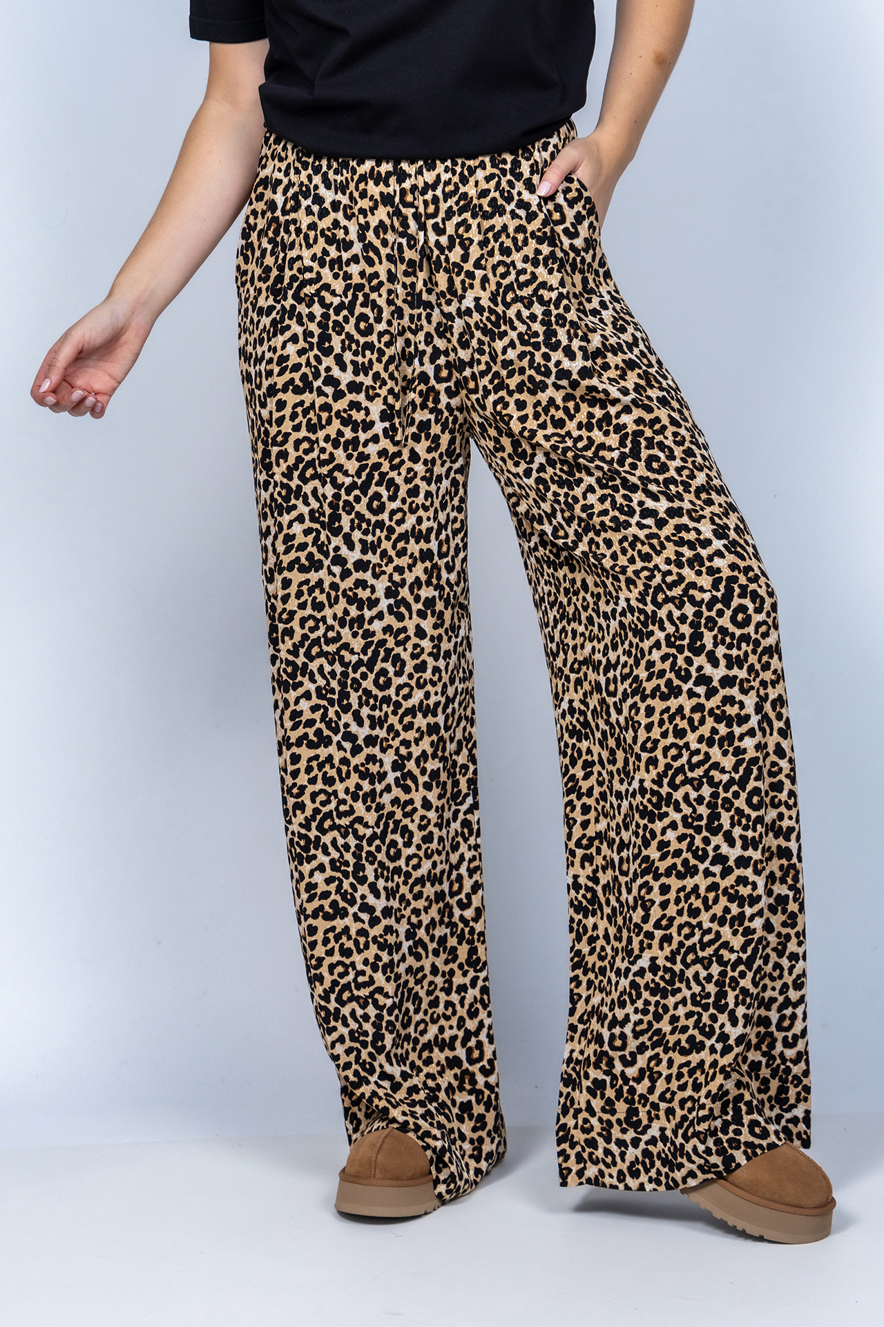 Panterprint broek met een elastische band in de taille, wijde pijpen en steekzakken aan de voorkant