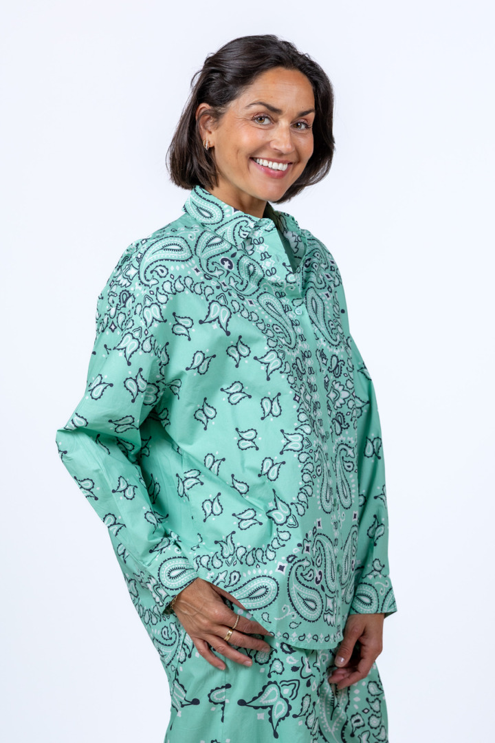 Katoenen broek met een elastische band met koordje in de taille, steekzakken aan de voorkant en hij heeft een paisleymotief