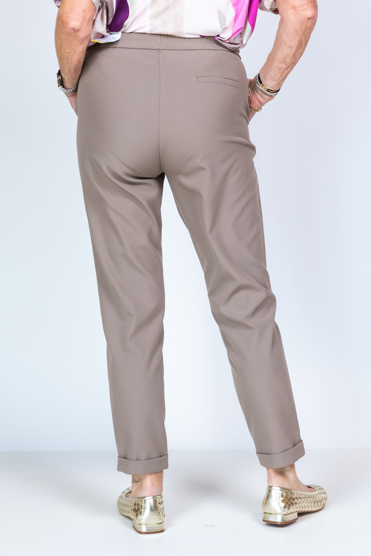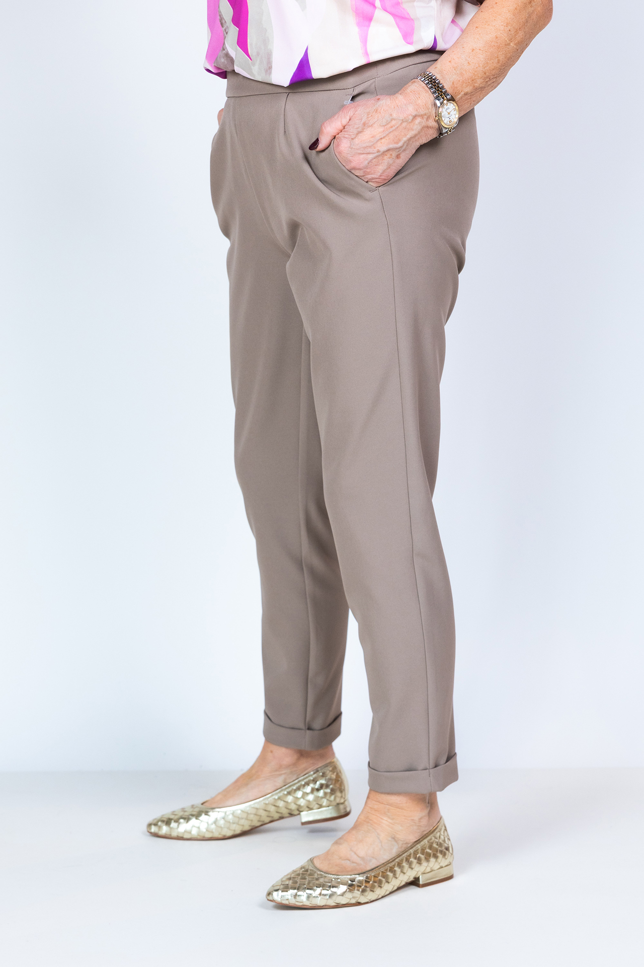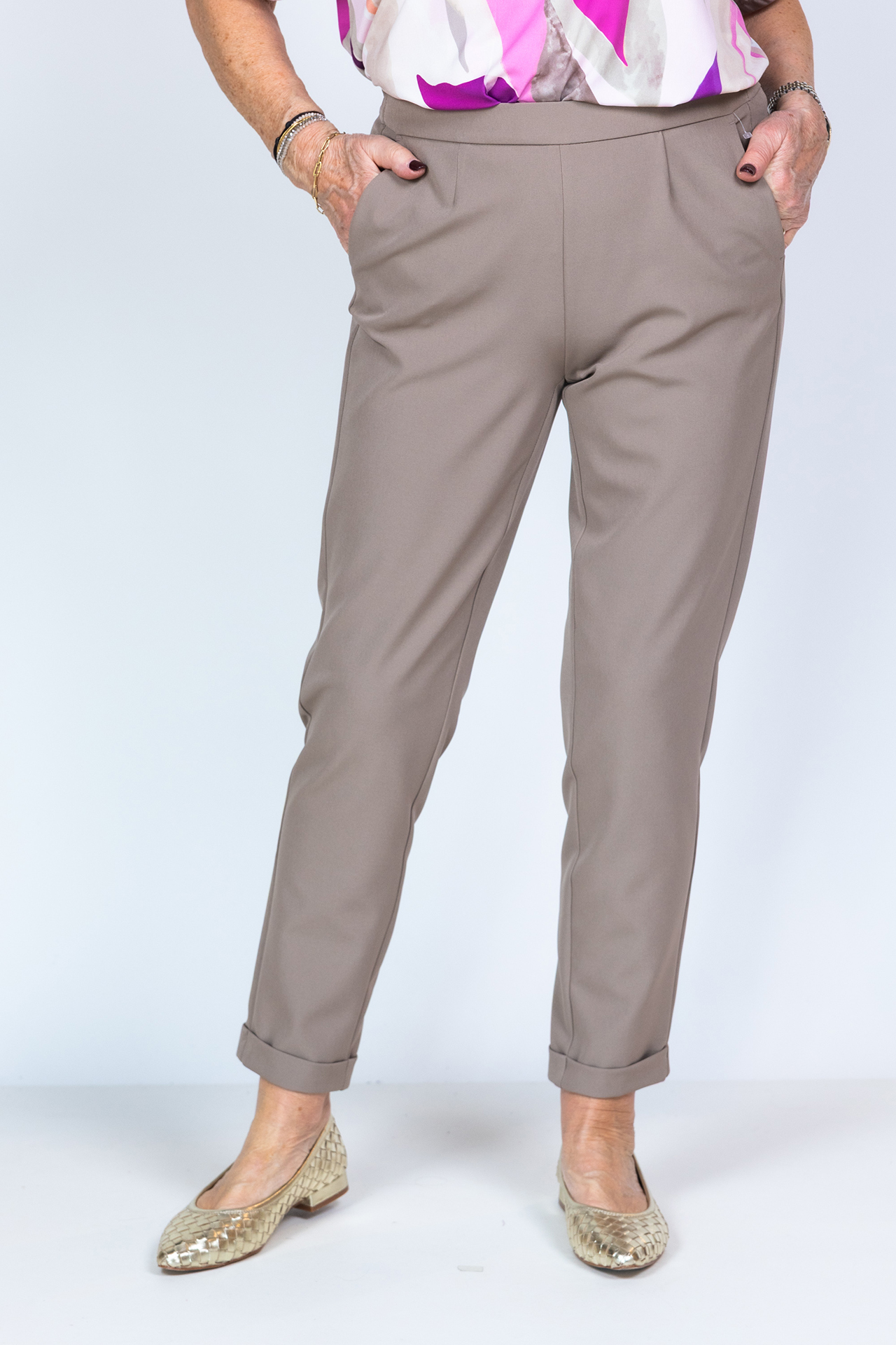 Broek met een elastische band in de taille, steekzakken aan de voorkant en een fake zak aan de achterkant. Hij heeft een omslag aan de onderkant en stretch in de stof waardoor hij heerlijk zit