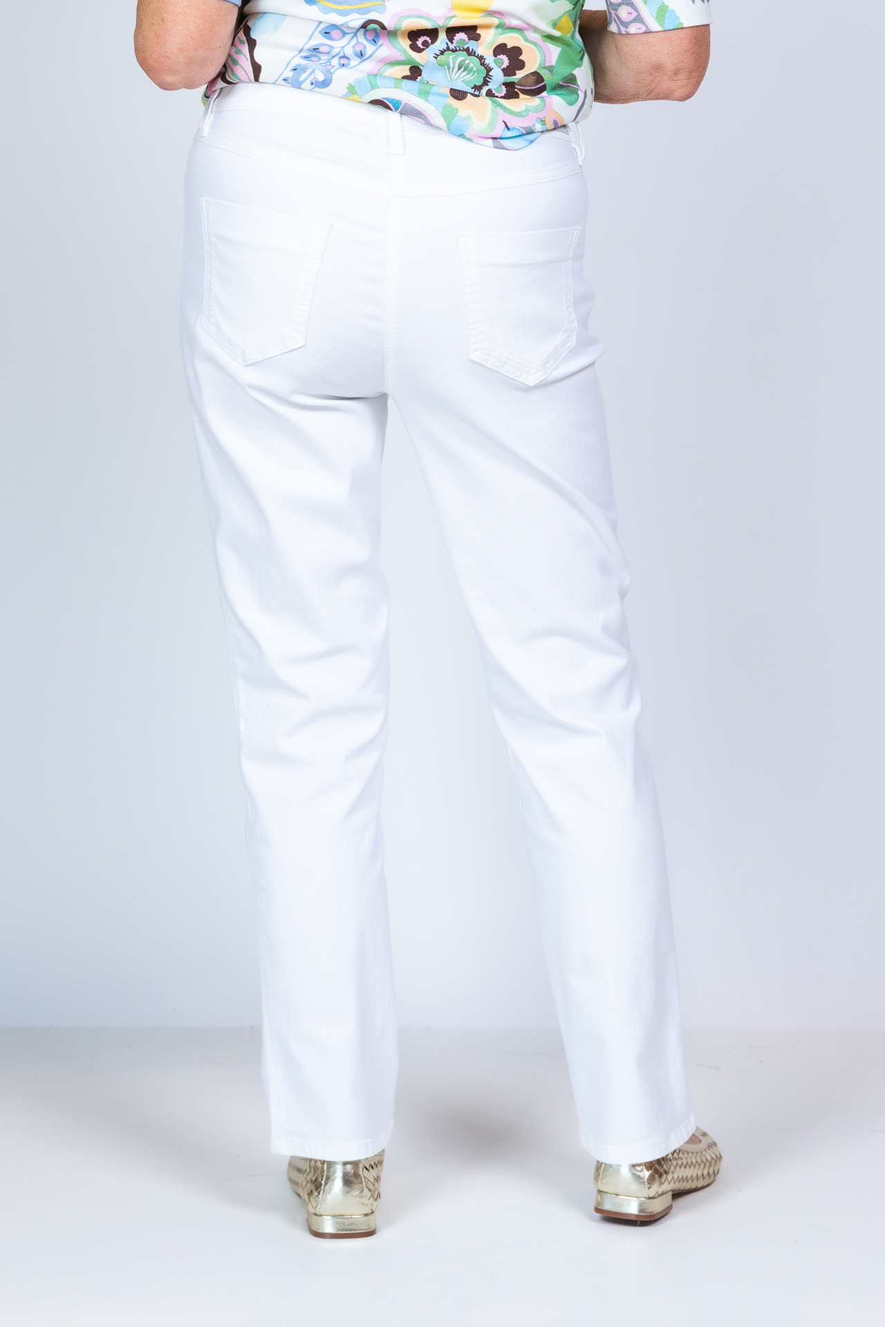 Broek met een knoop- en ritssluiting en lusjes in de band. Hij heeft steekzakken aan de voorkant, opgestikte zakken aan de achterkant en stretch in de stof waardoor hij heerlijk draagt