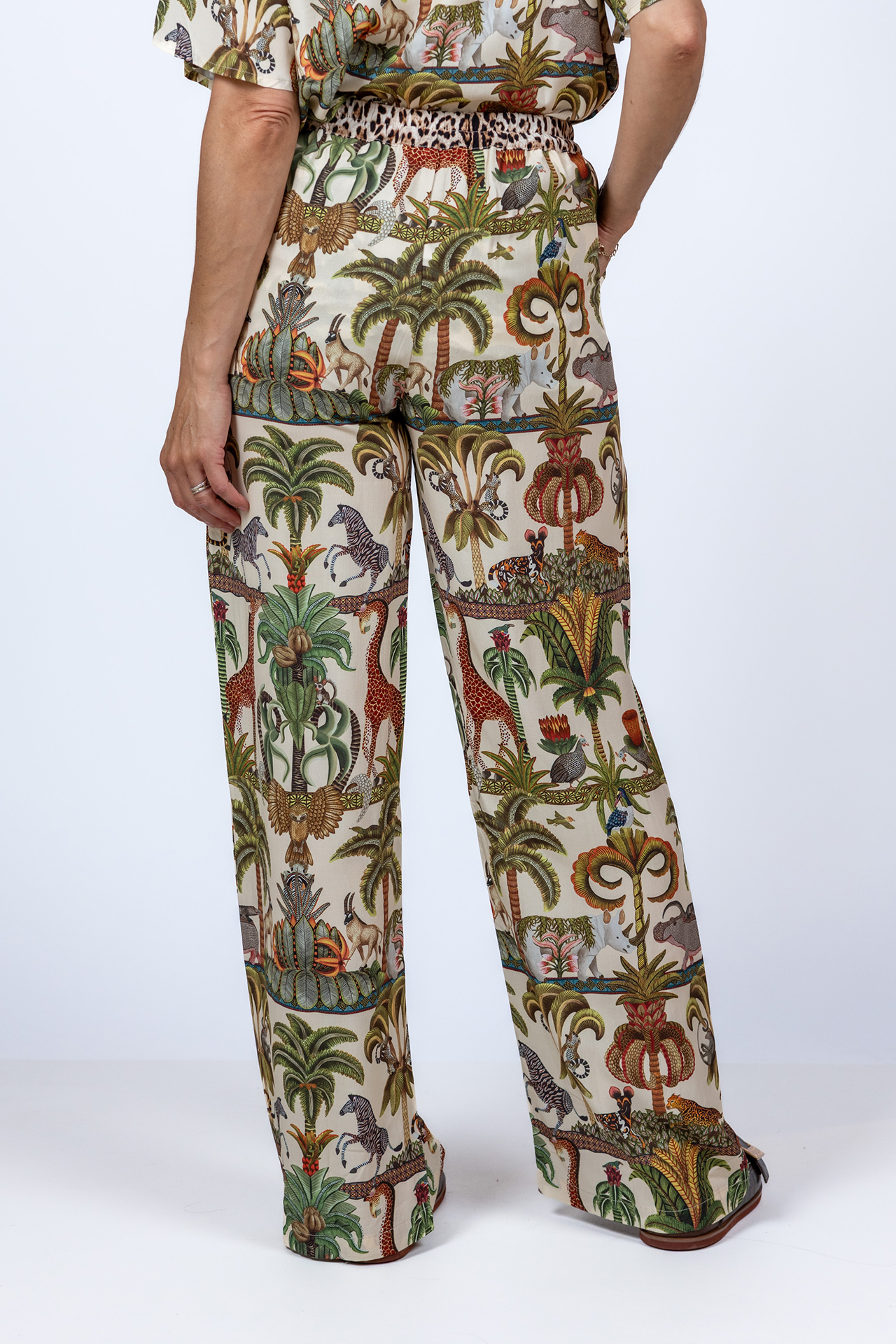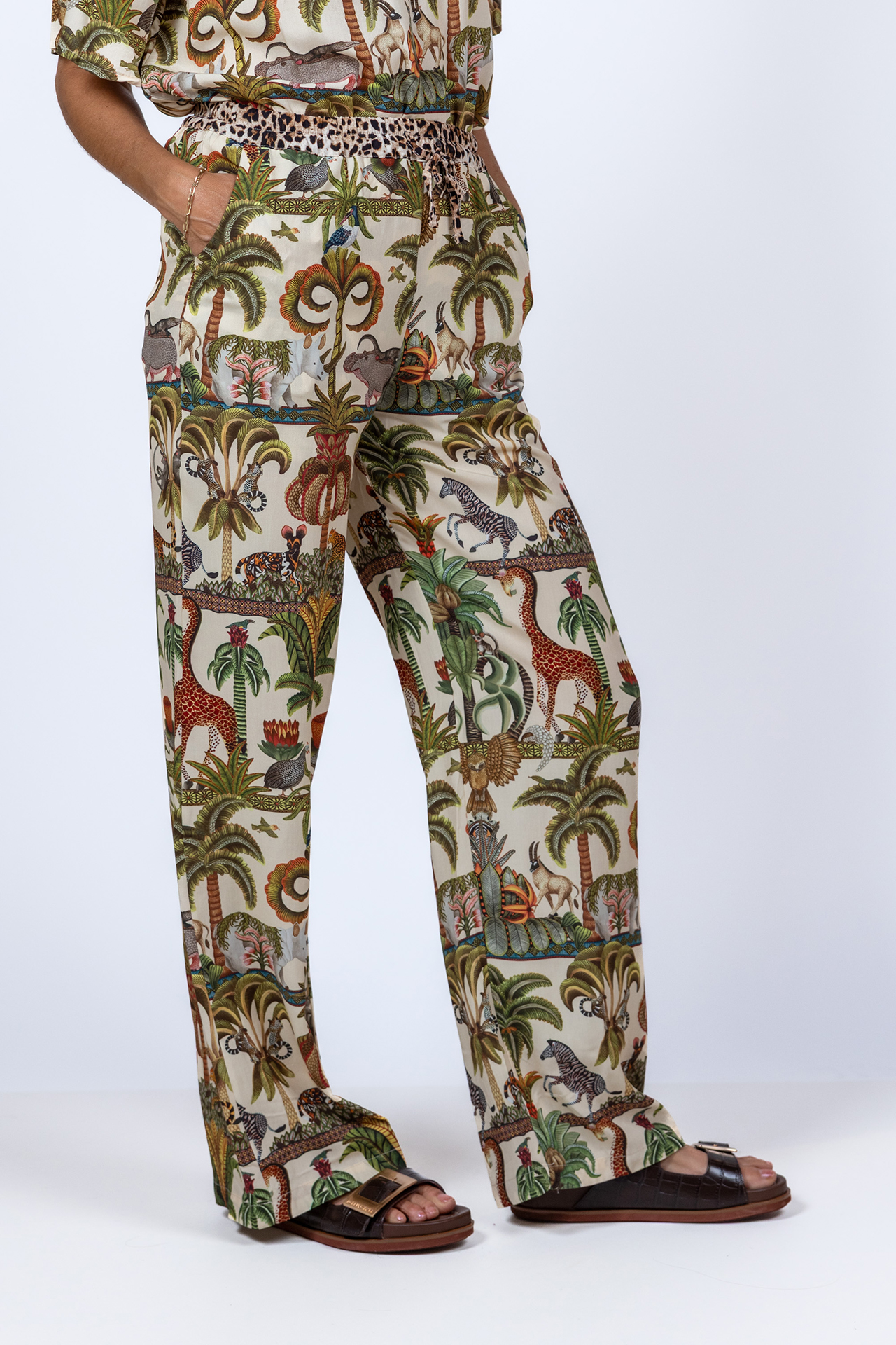 Soepel vallende viscose broek met een elastische band met koordje in de taille, steekzakken aan de voorkant en hij heeft een all-over jungle print