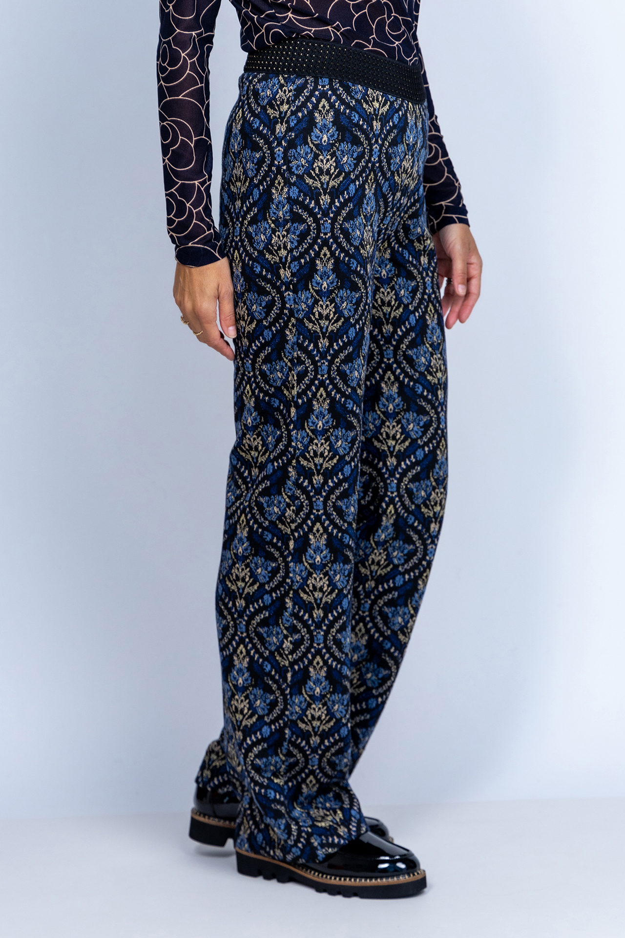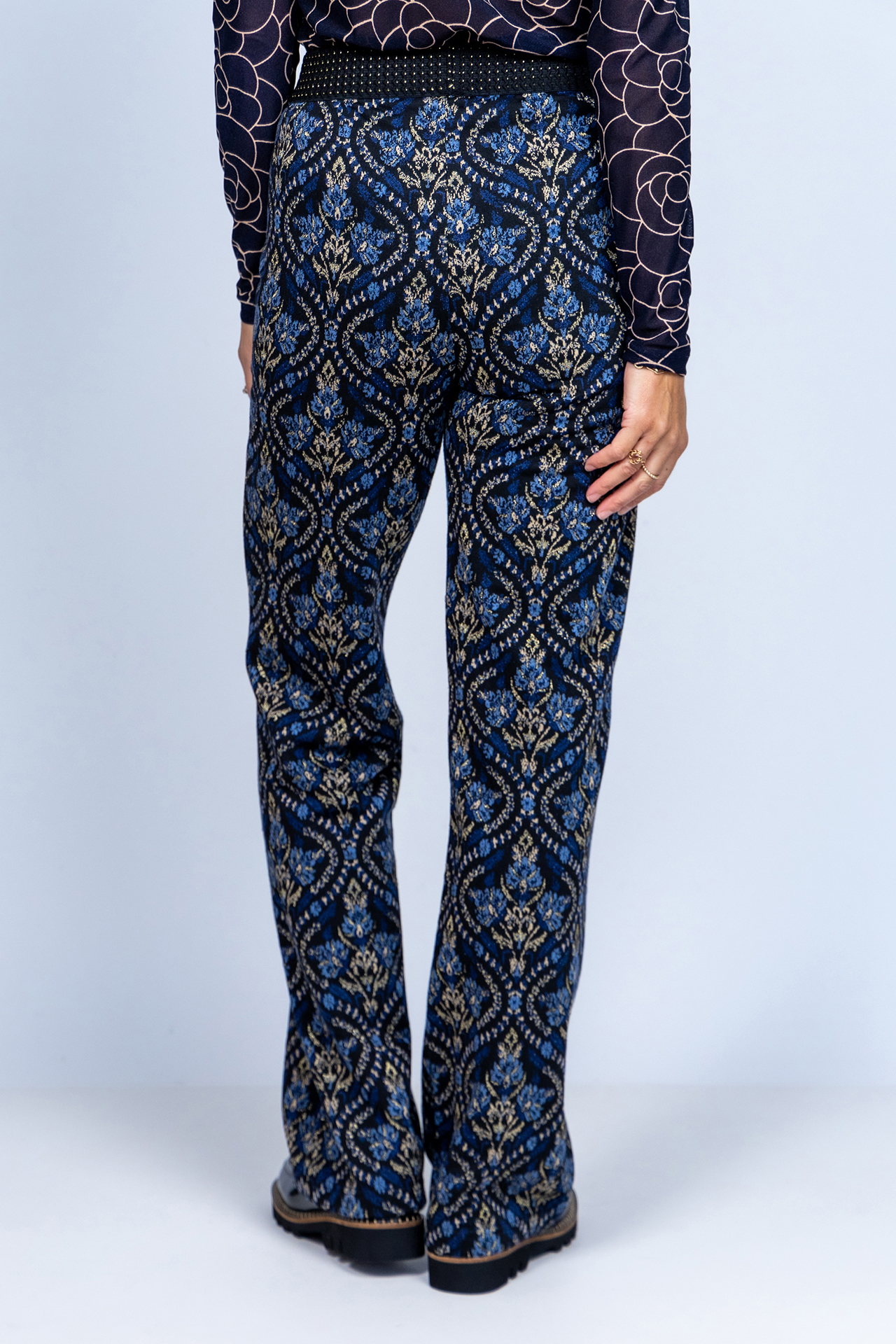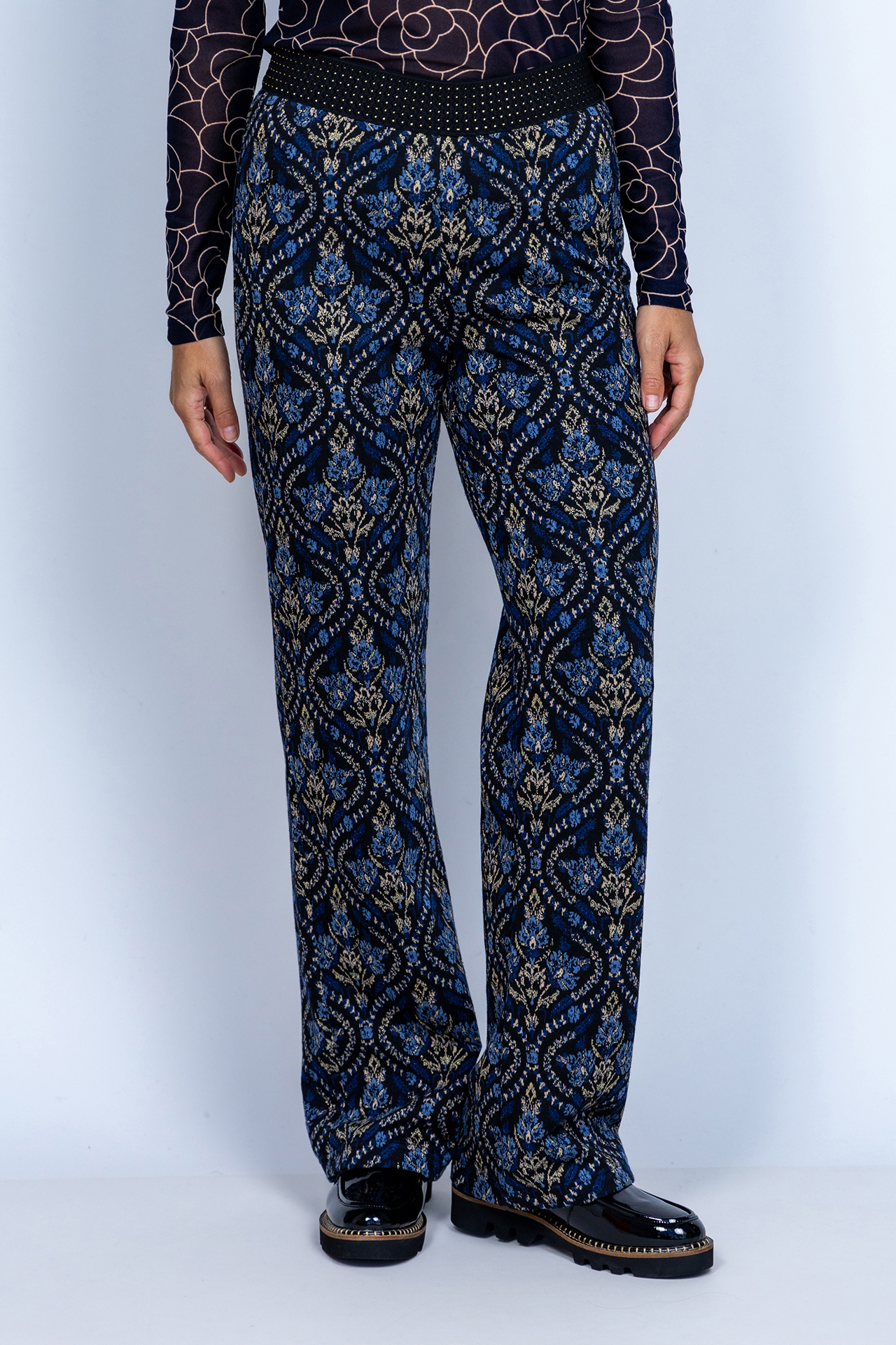 Broek met een elastische band in de taille, een bloemdessin met glitters en stretch in de stof waardoor hij heerlijk draagt