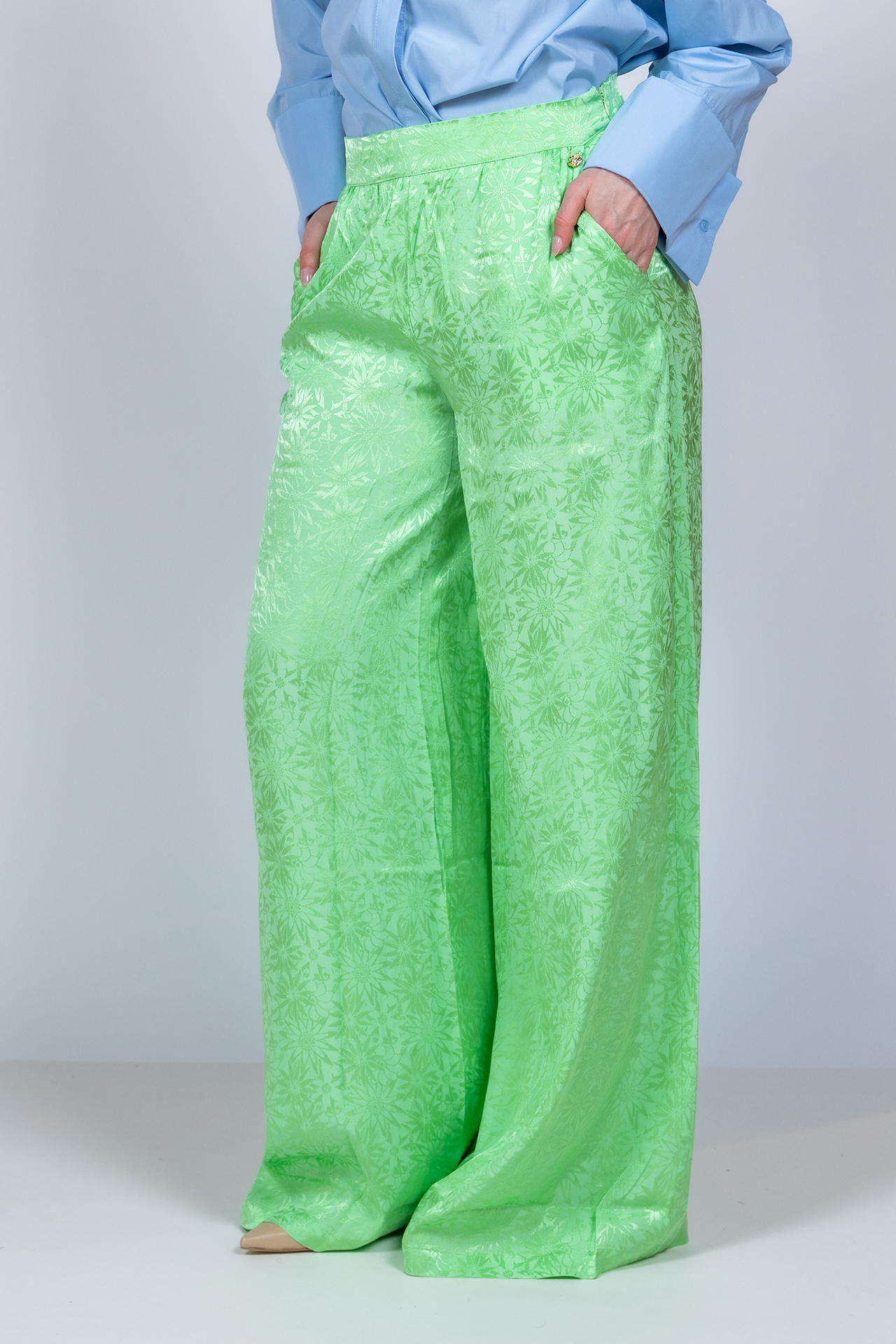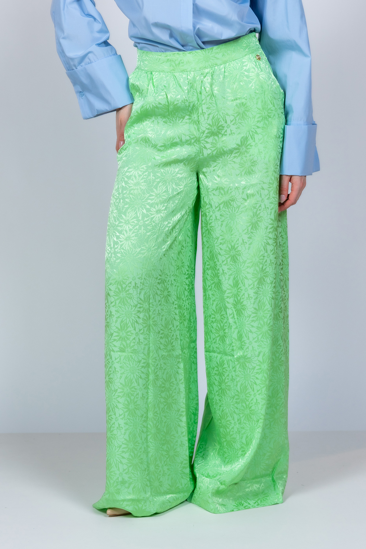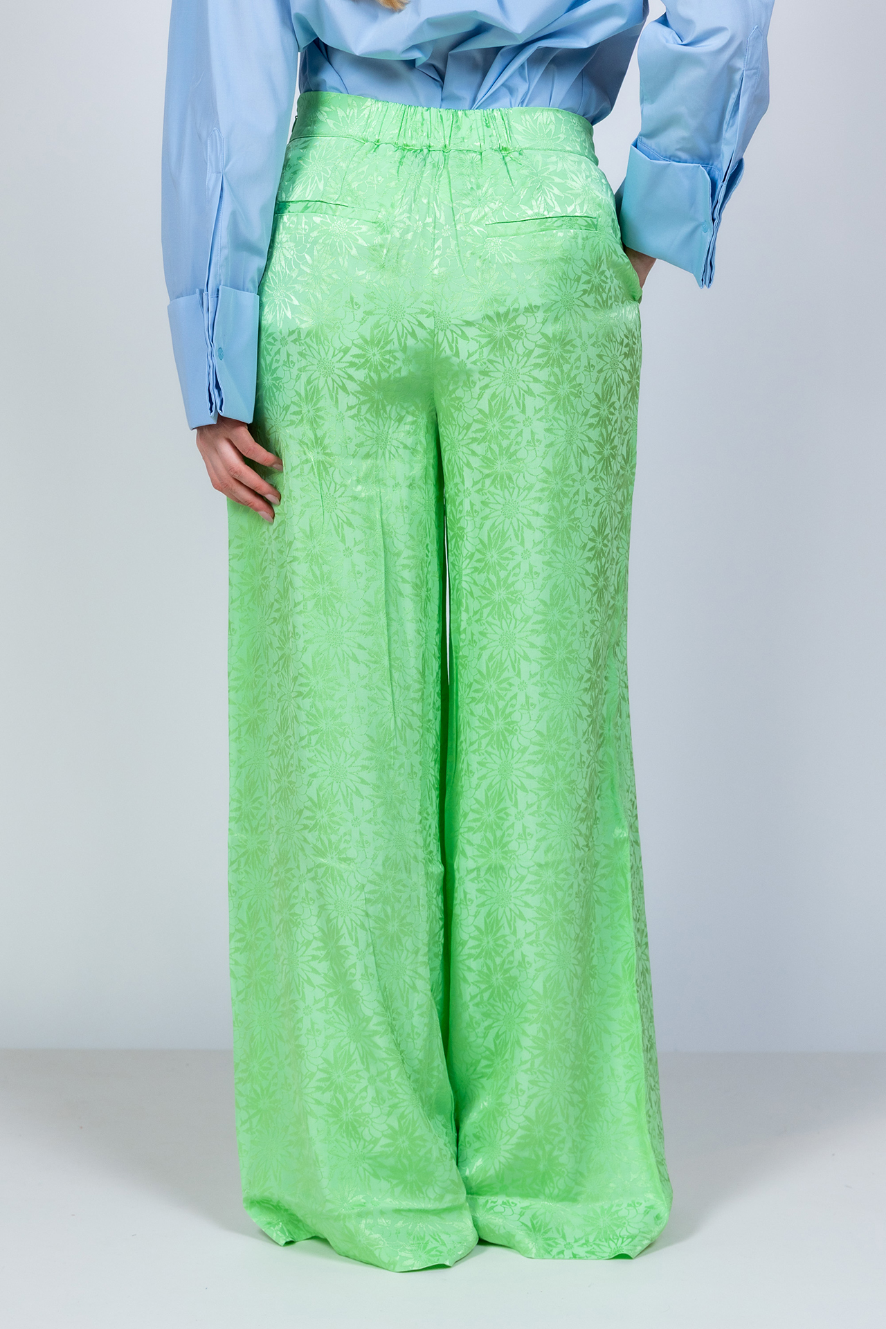 Wijde broek met een all-over ton sur ton bloemdessin, steekzakken aan de voorkant en fake zakken aan de achterkant. Hij heeft een rits aan de zijkant en elastiek in de band