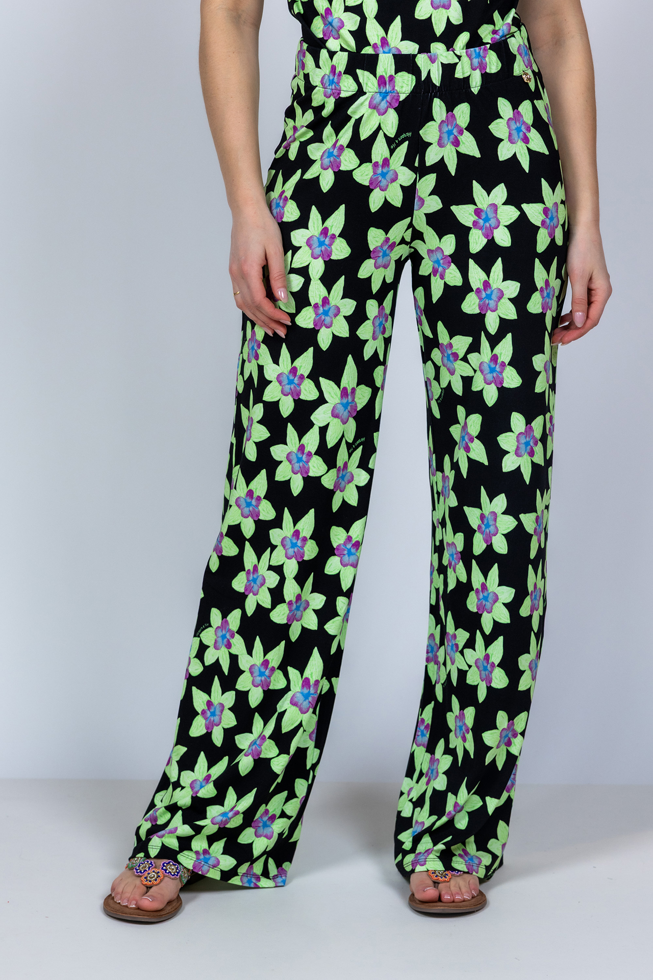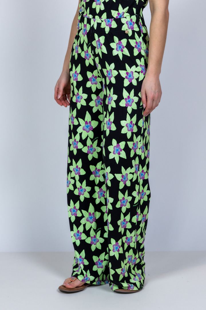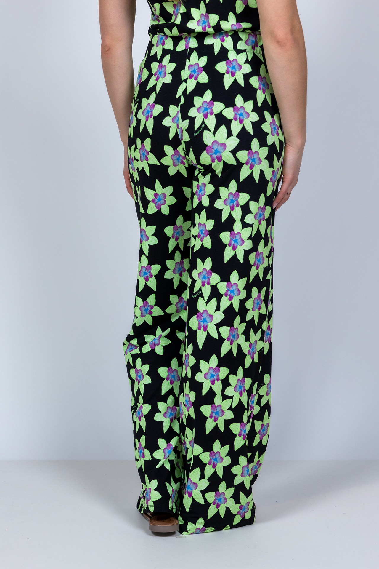 Soepel vallende broek met een elastische band in de taille, een all-over dessin met gekleurde bloemen en stretch in de stof waardoor hij comfortabel zit