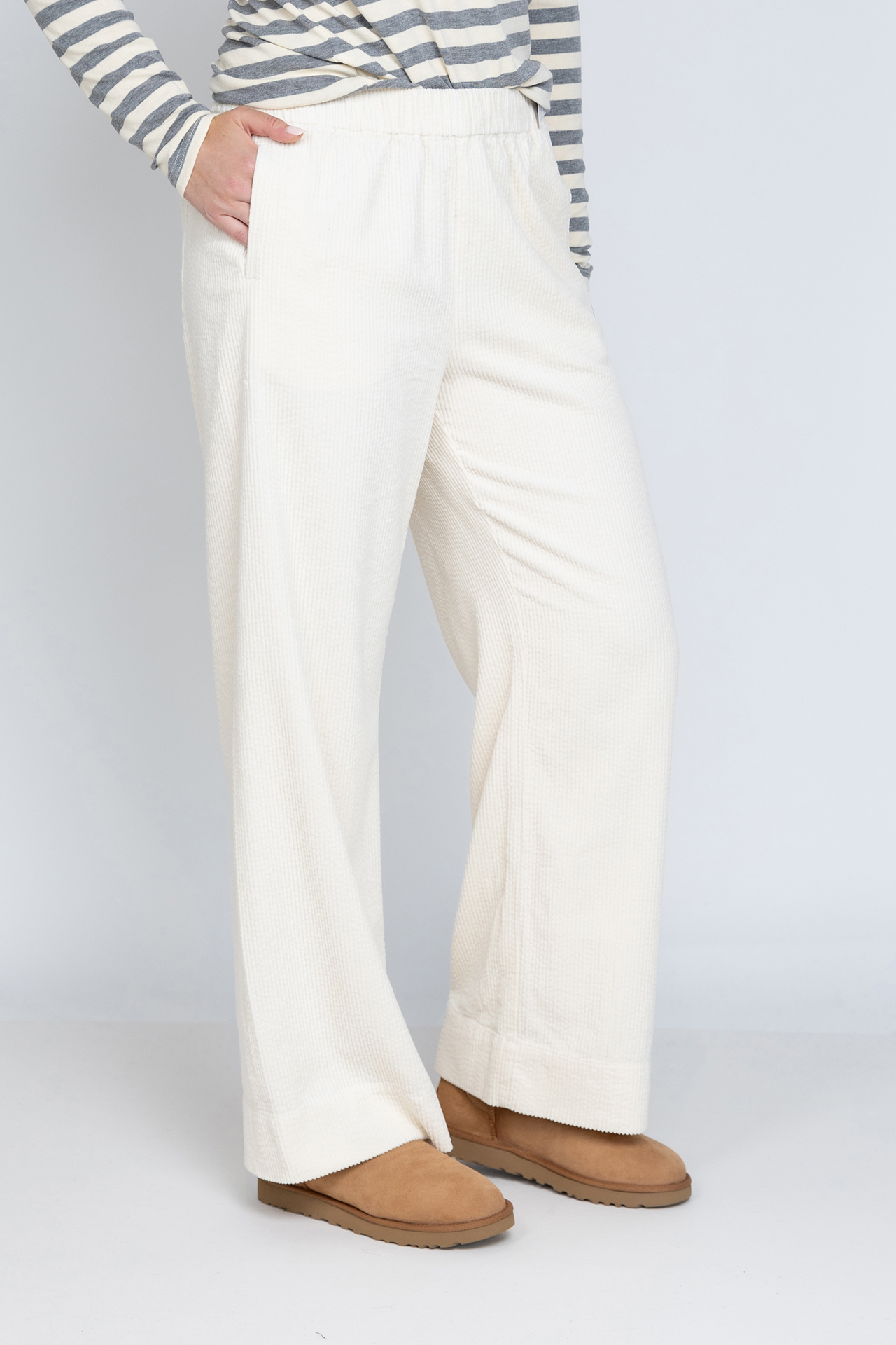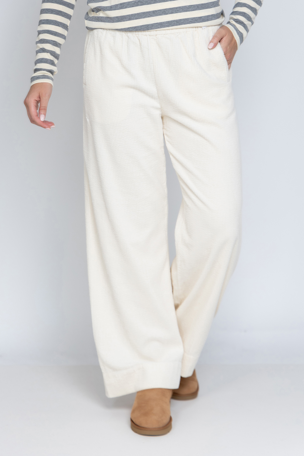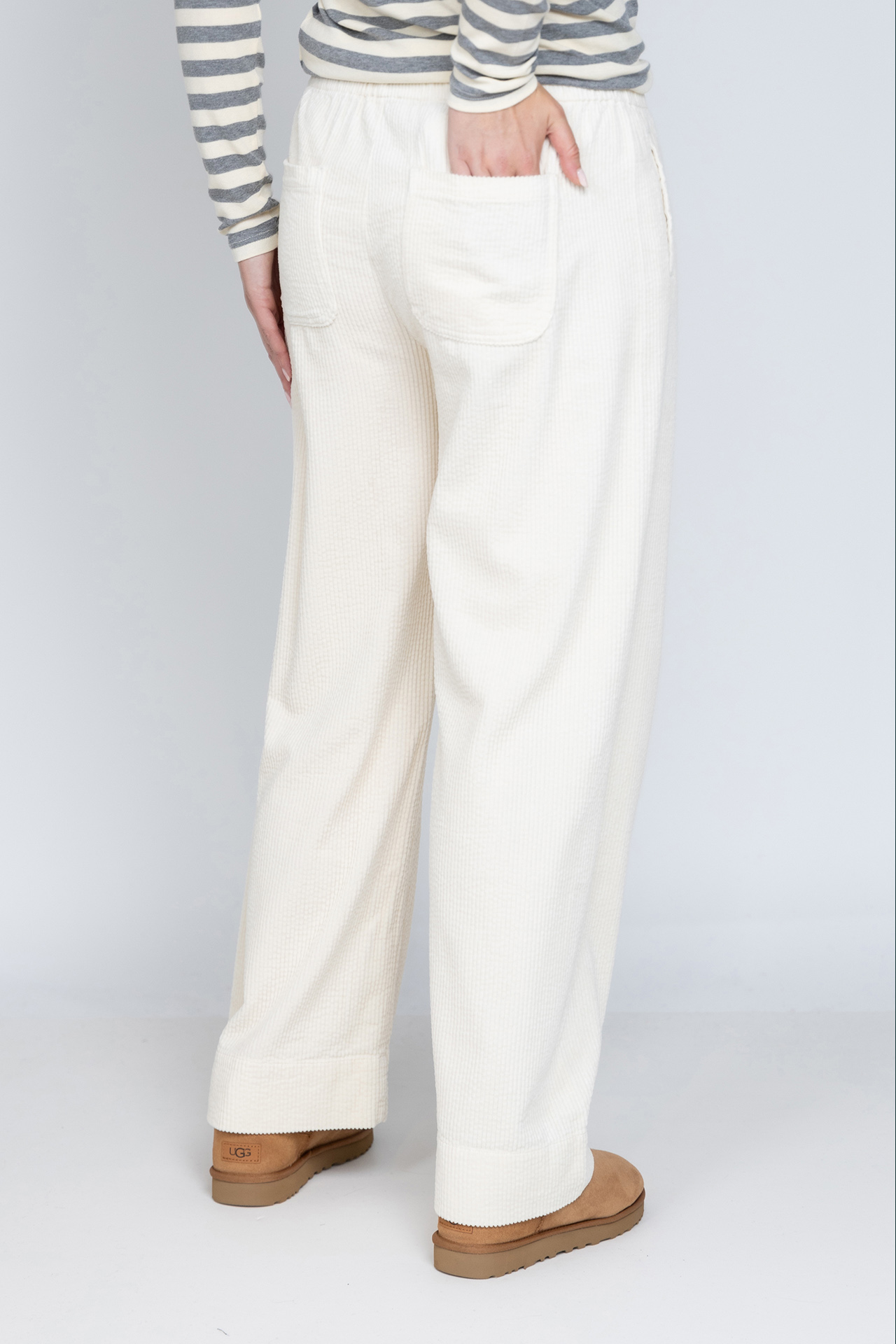 Rib broek met wijde pijpen, een elastische band in de taille, steekzakken aan de voorkant en opgestikte zakken aan de achterkant