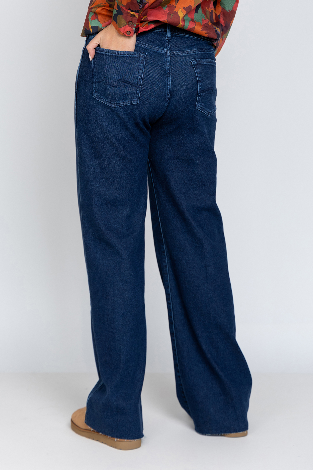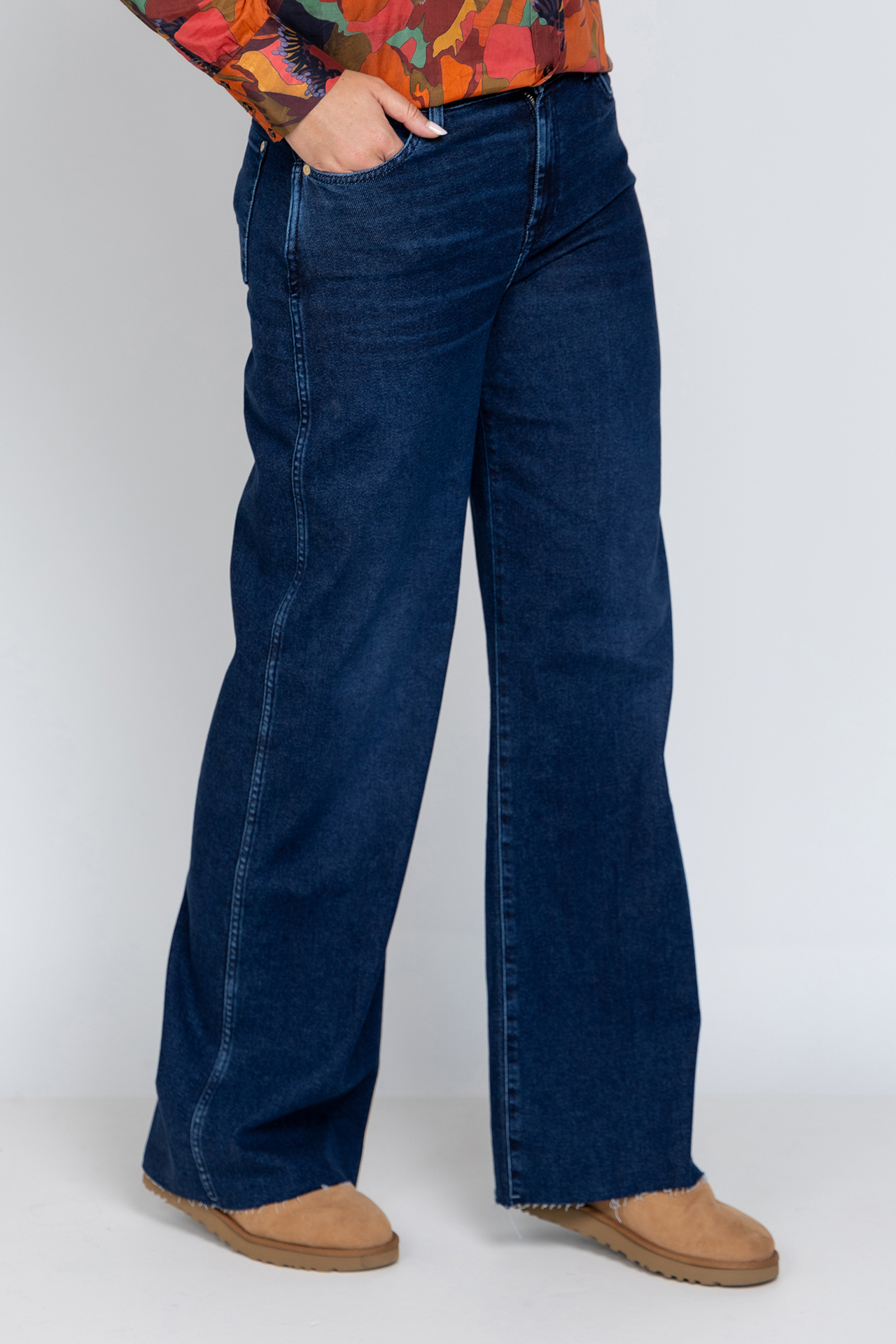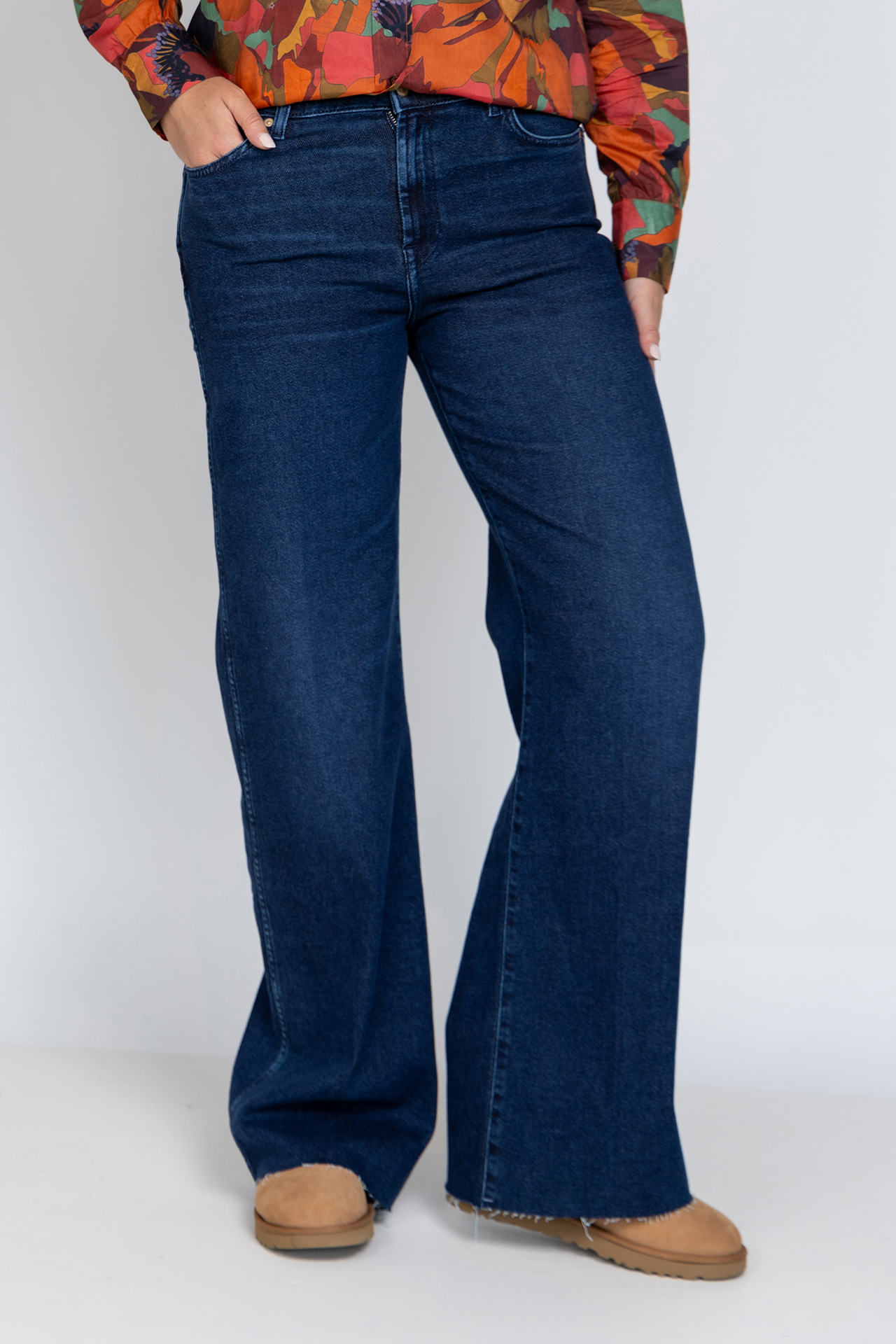 Jeans met wijde pijpen, een knoop- en ritssluiting, steekzakken aan de voorkant en opgestikte zakken aan de achterkant. Hij heeft rafels aan de onderkant en stretch in de stof waardoor hij heerlijk zit
