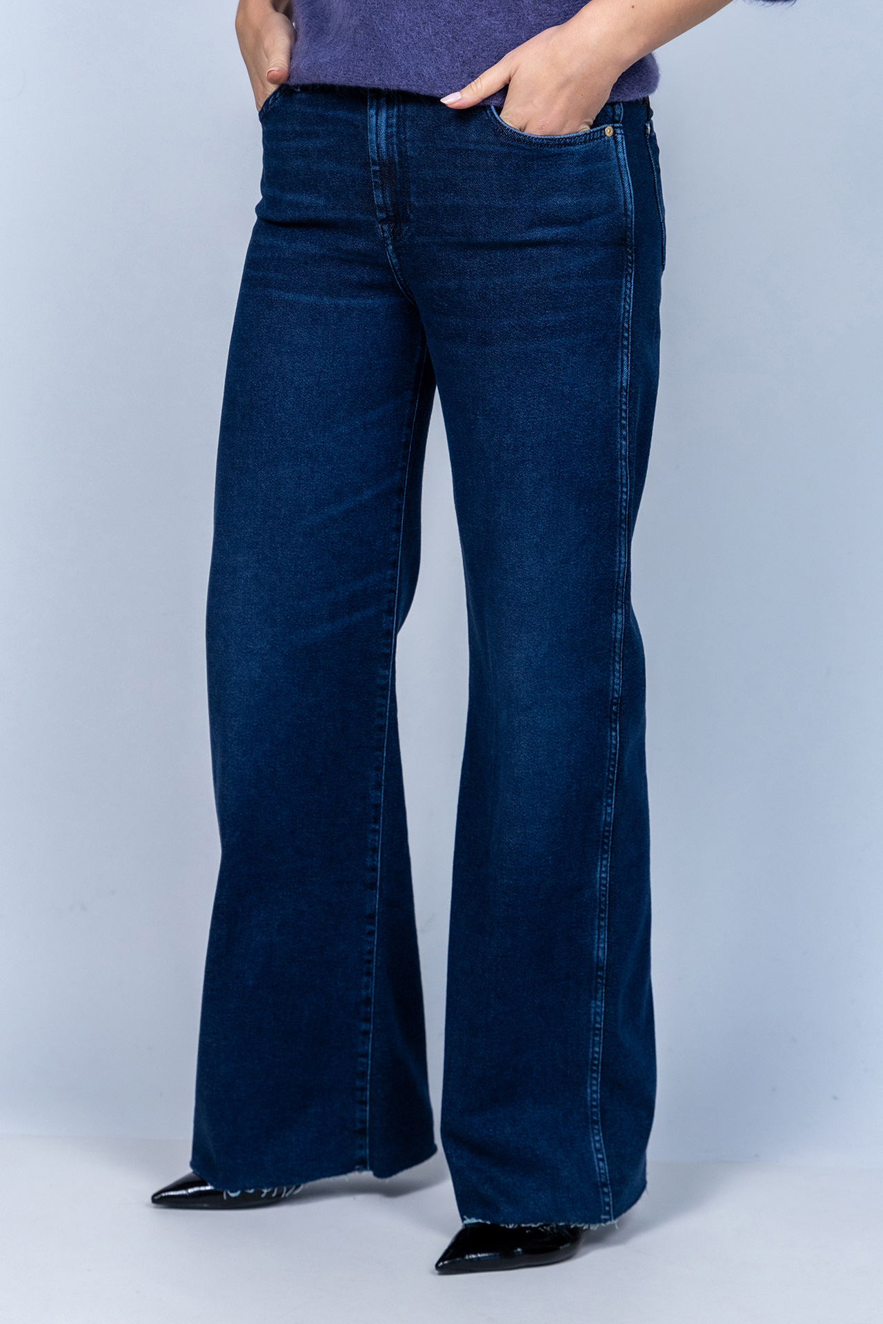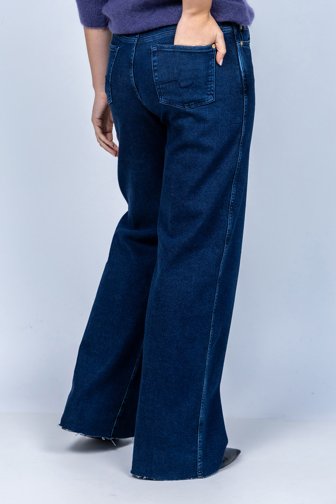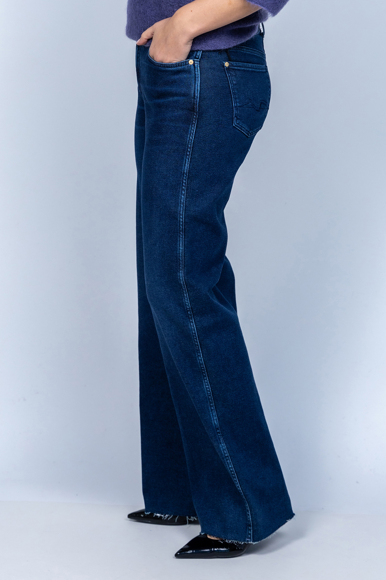 Jeans met wijde pijpen, een knoop- en ritssluiting, steekzakken aan de voorkant en opgestikte zakken aan de achterkant. Hij heeft rafels aan de onderkant en stretch in de stof waardoor hij heerlijk zit