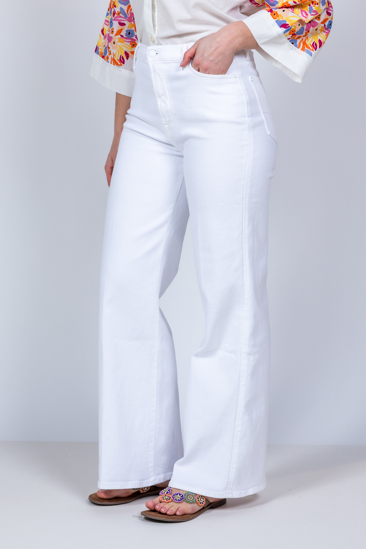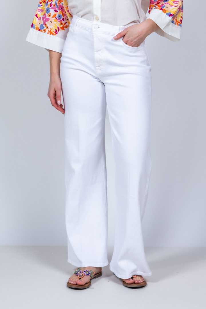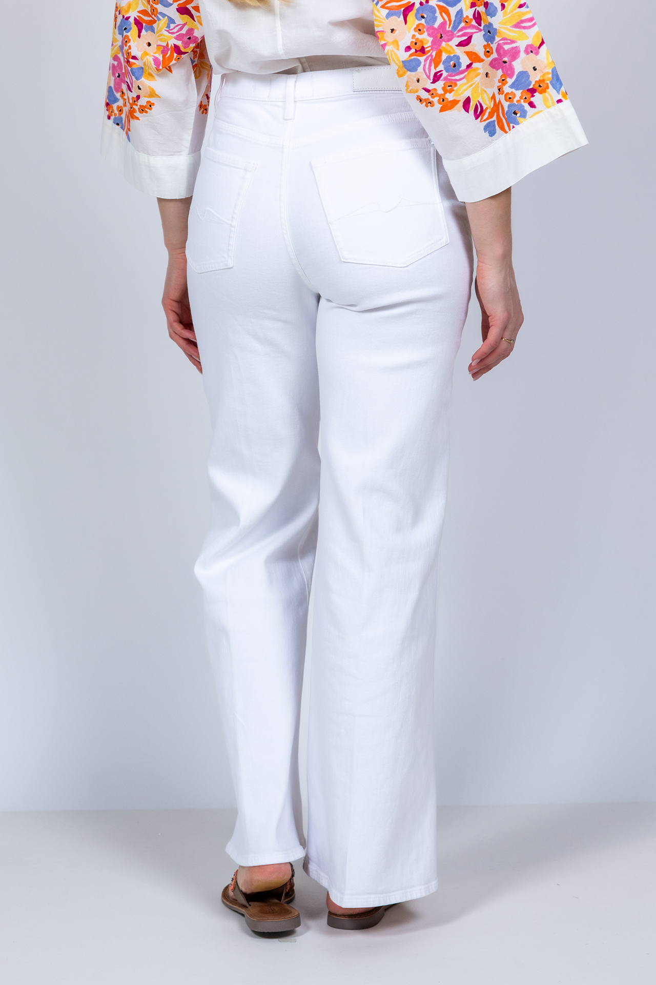 5-pocket jeans met een hoge taille, knoop- en ritssluiting en lusjes in de band voor een ceintuur. Hij heeft wijde pijpen en stretch in de stof waardoor hij comfortabel zit