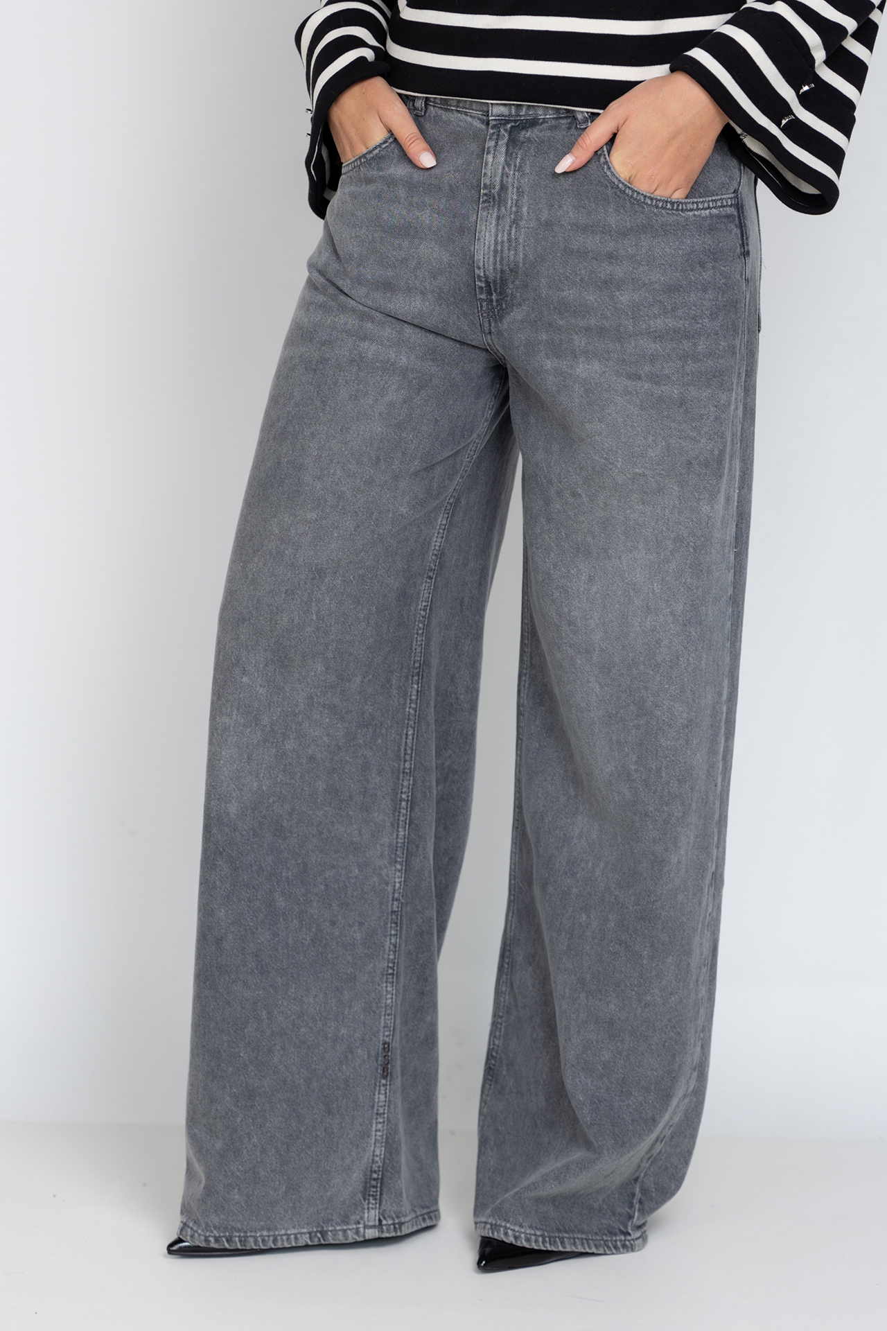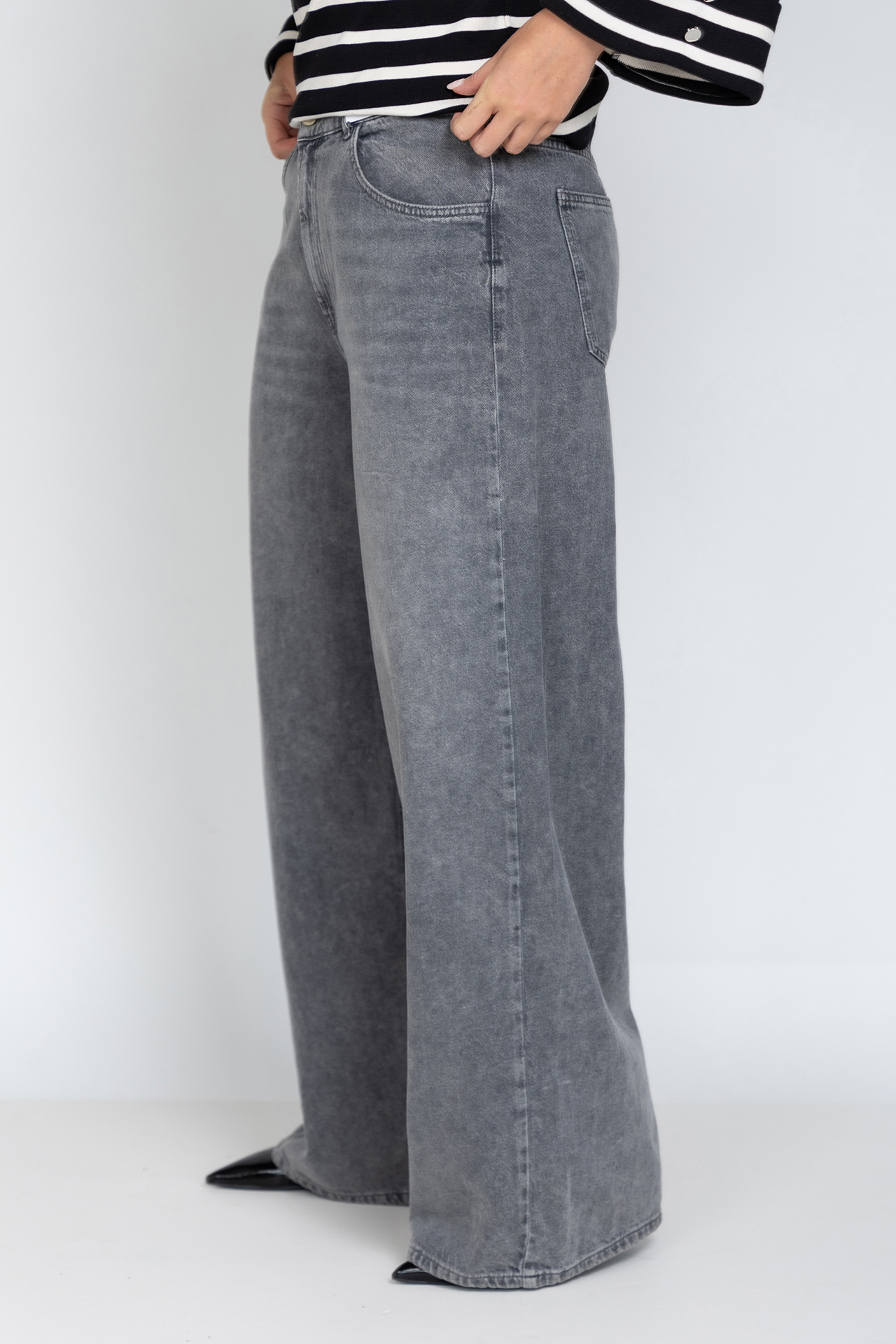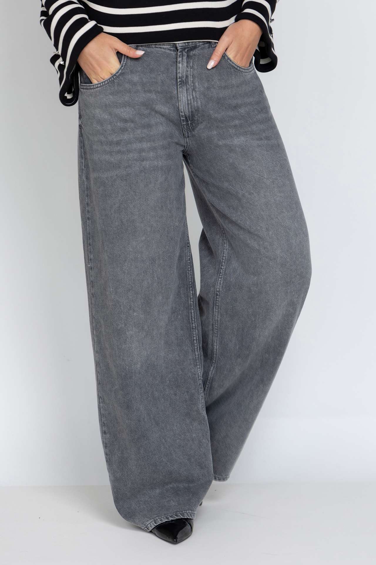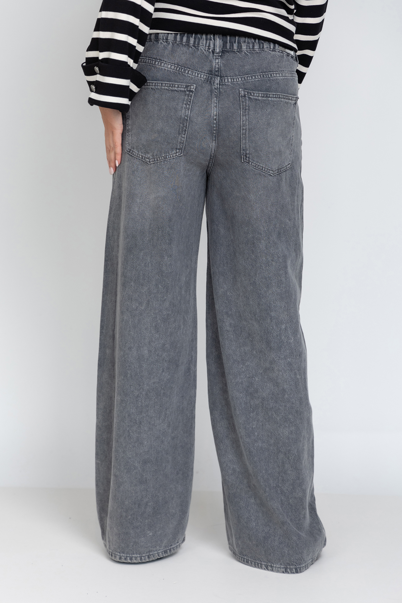 Wijde jeans met een vintage wassing, een knoop- en ritssluiting en lusjes in de band voor een ceintuur. Hij heeft steekzakken aan de voorkant en opgestikte zakken aan de achterkant. Er zit elastiek in de tailleband
