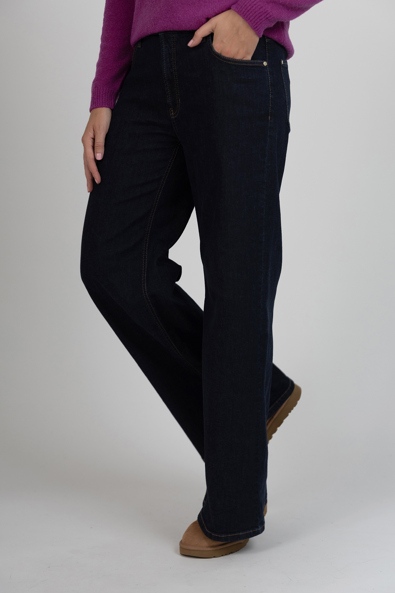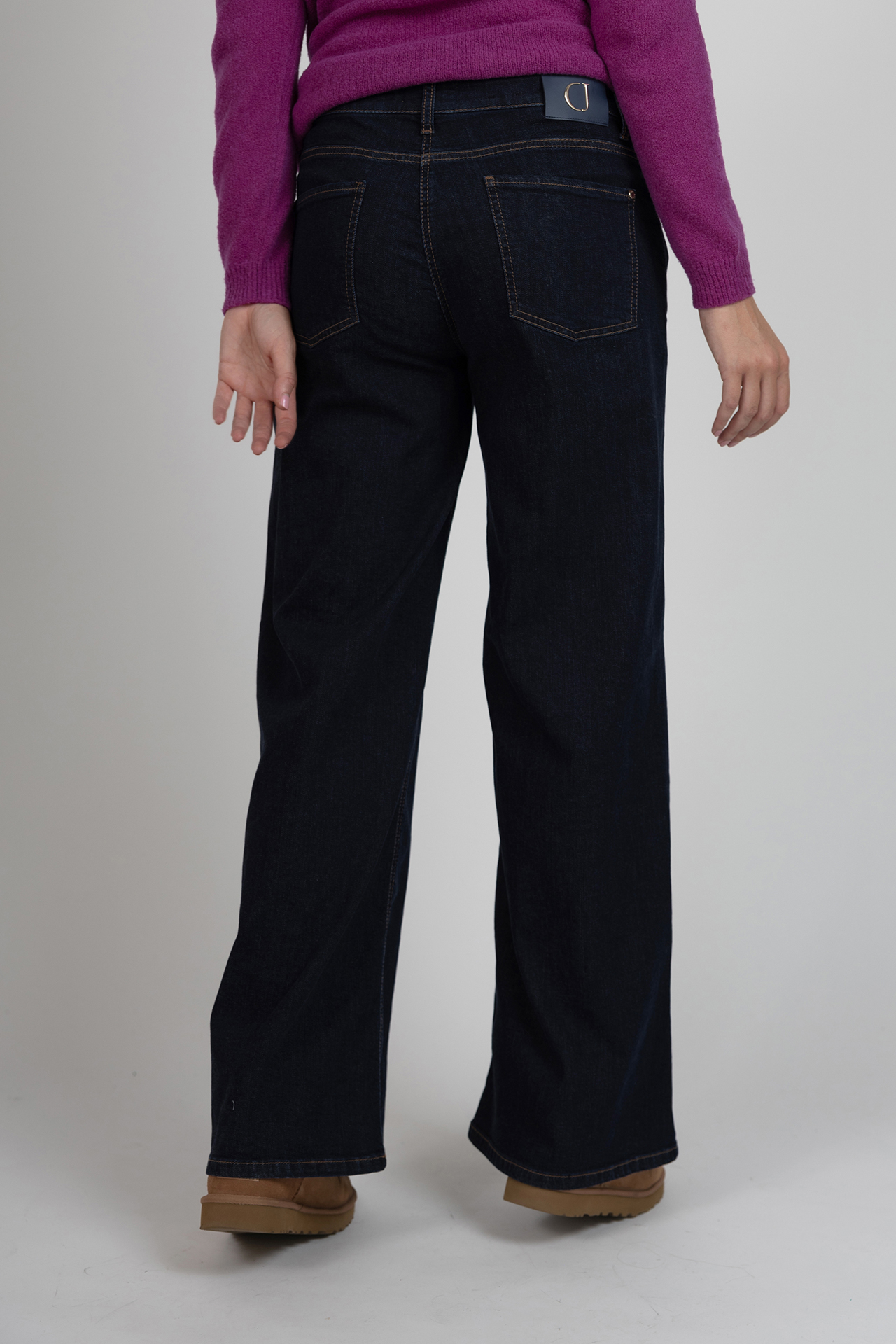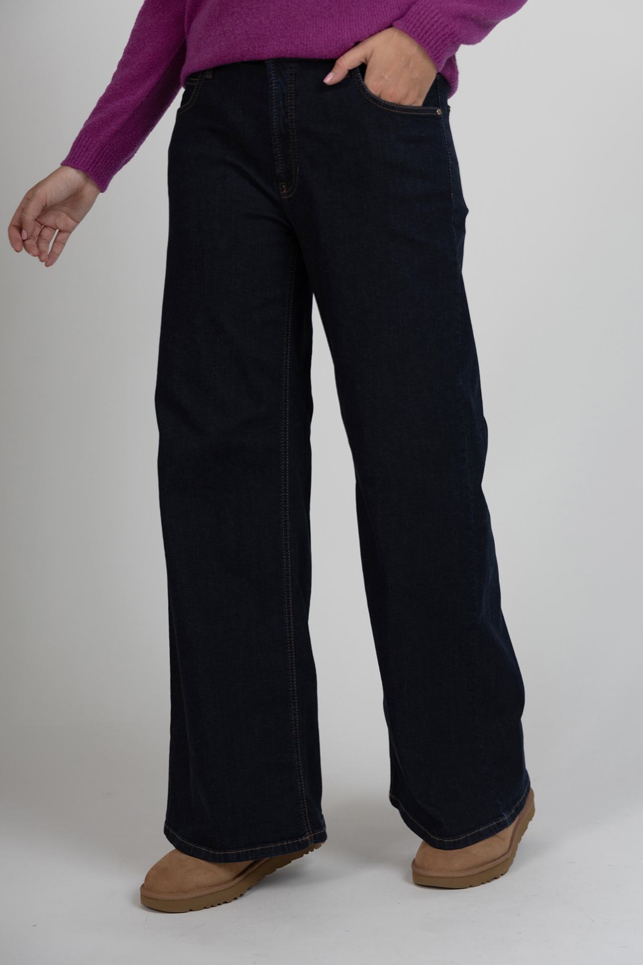 Jeans met wijde pijpen, een knoop- en ritssluiting, lusjes in de band voor een ceintuur en er zit een beetje stretch in waardoor hij lekker zit