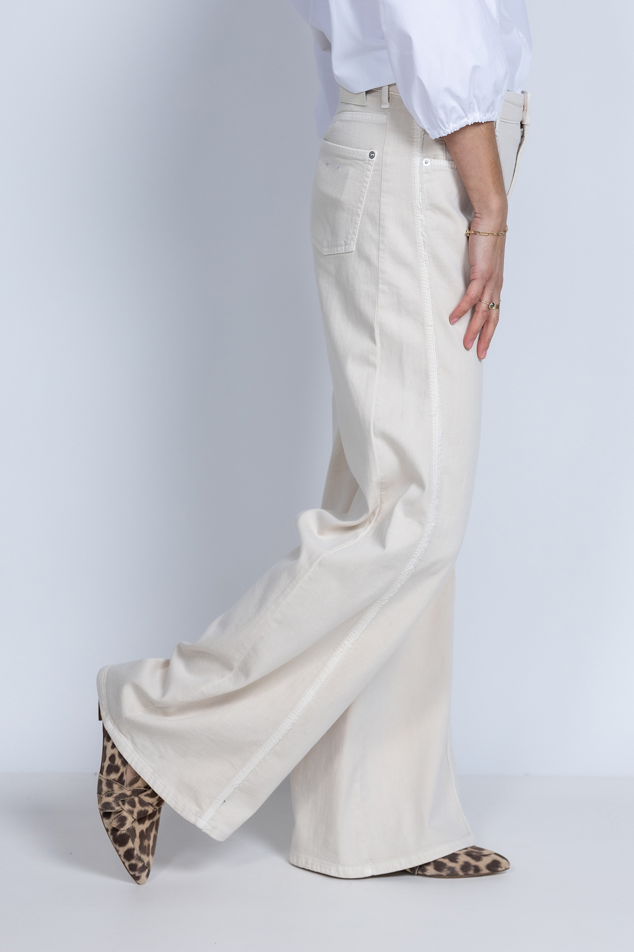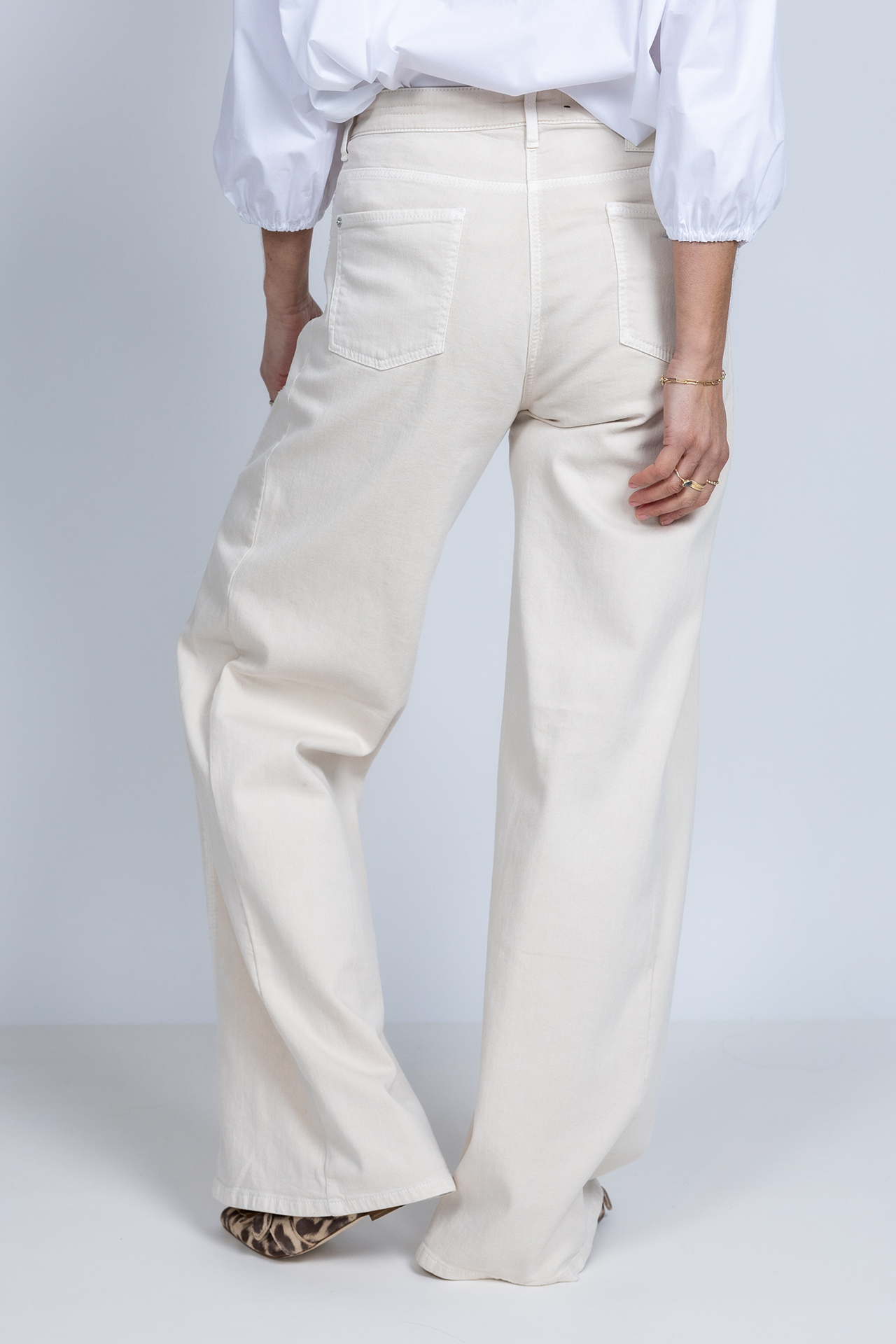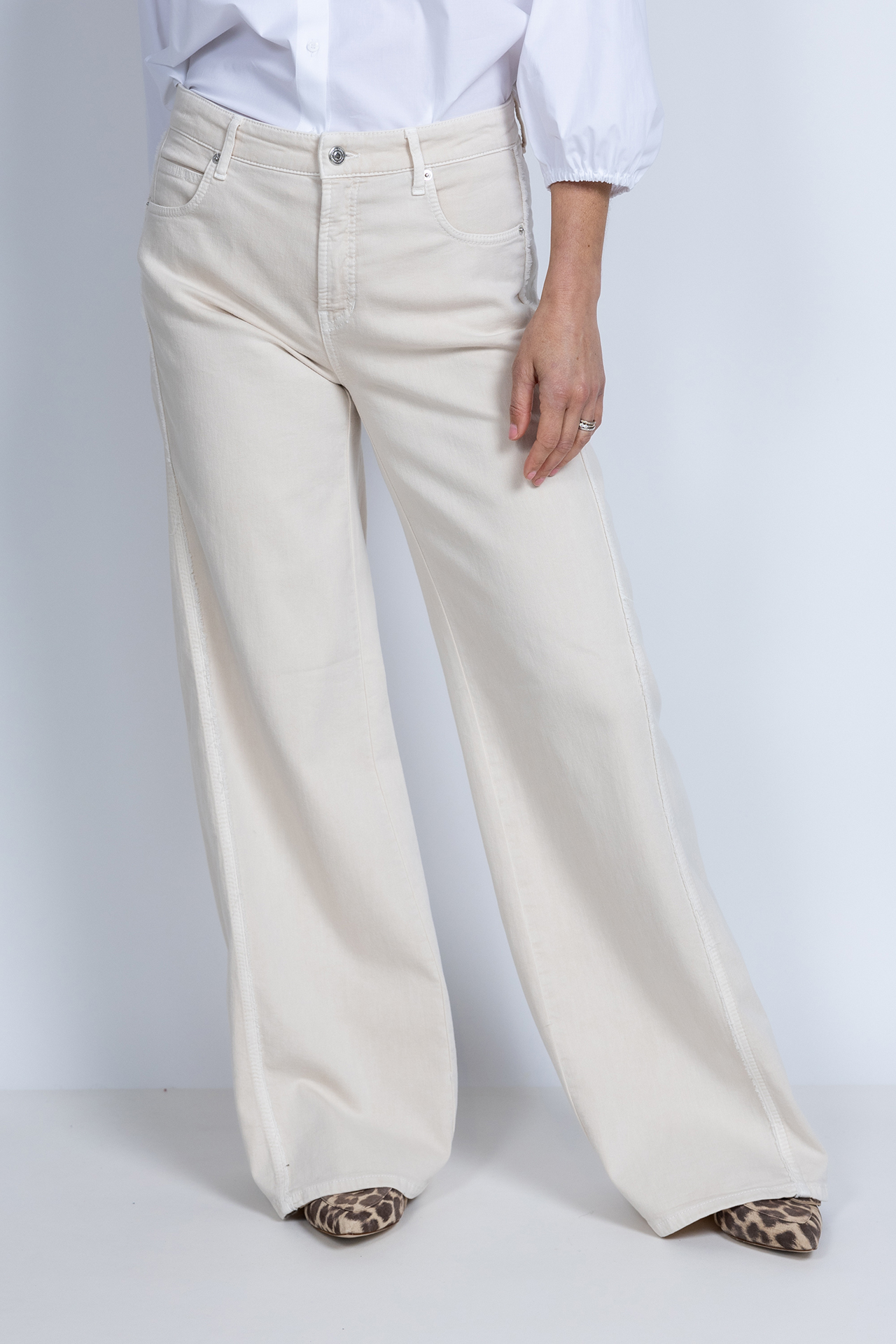 Wide leg jeans met een knoop- en ritssluiting en lusjes in de band voor een ceintuur. Steekzakken aan de voorkant, opgestikte zakken aan de achterkant en er zit stretch in de stof waardoor hij comfortabel zit en mooi valt