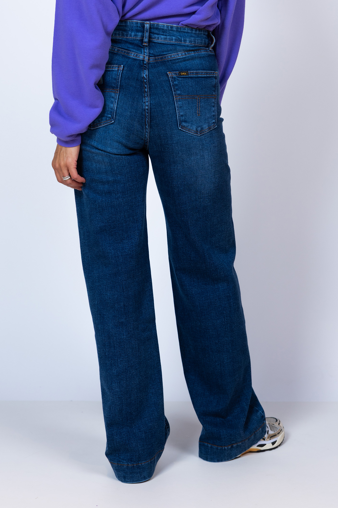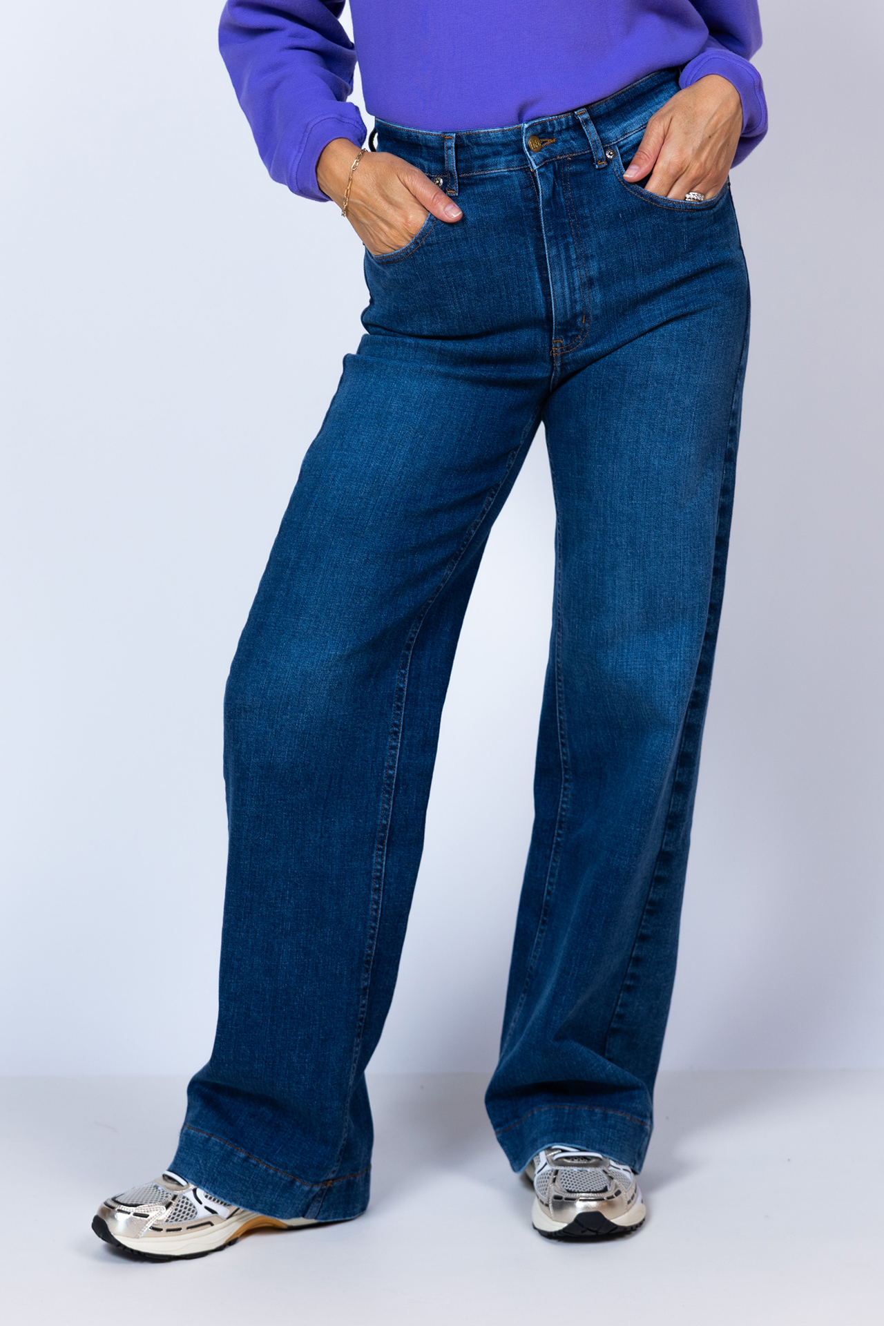 High rise wide leg jeans met een knoop- en ritssluiting. Hij heeft steekzakken aan de voorkant, opgestikte zakken aan de achterkant en een klein beetje stretch in de stof waardoor hij comfortabel draagt