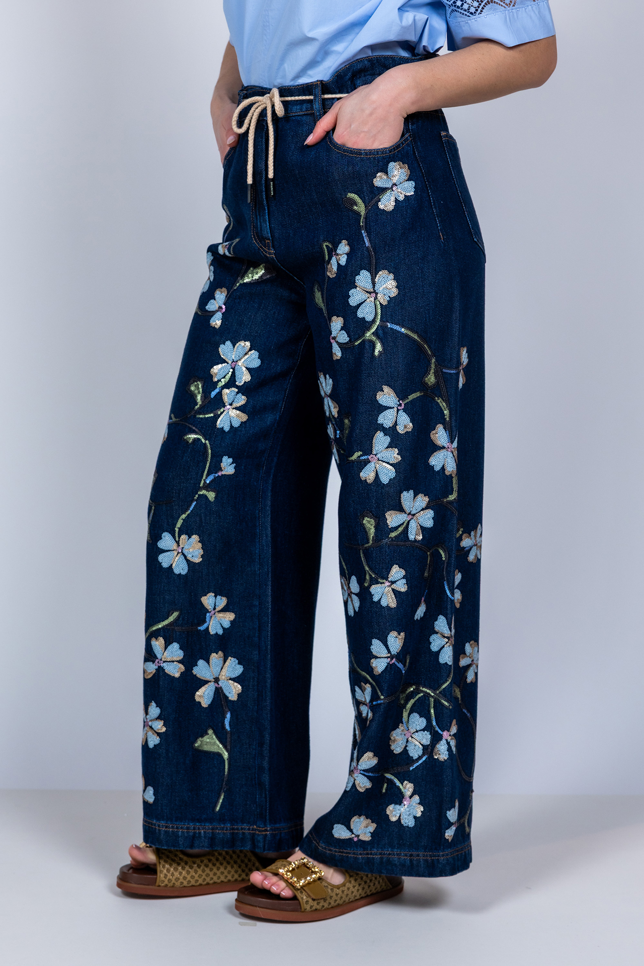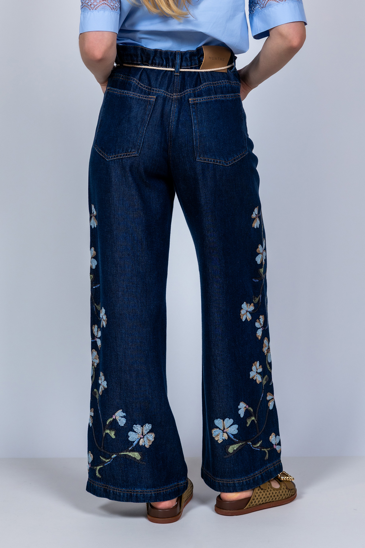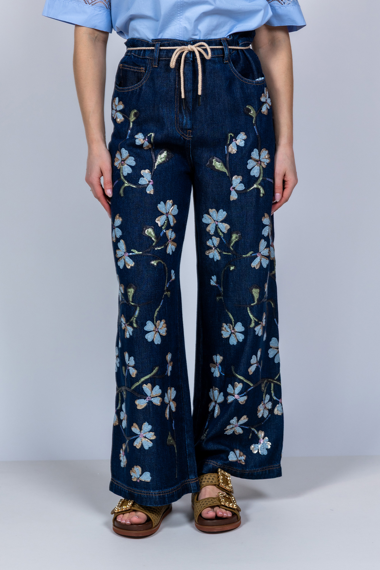 Zachte jeans met wijde pijpen, een knoop- en ritssluiting en strikkoordje in de band. Hij heeft steekzakken aan de voorkant, opgestikte zakken aan de achterkant en all-over pailletten in de vorm bloemen