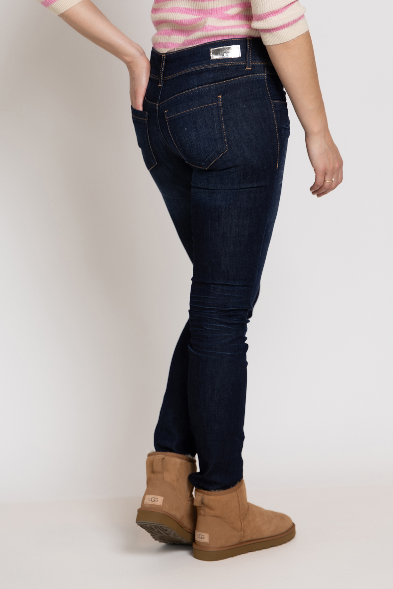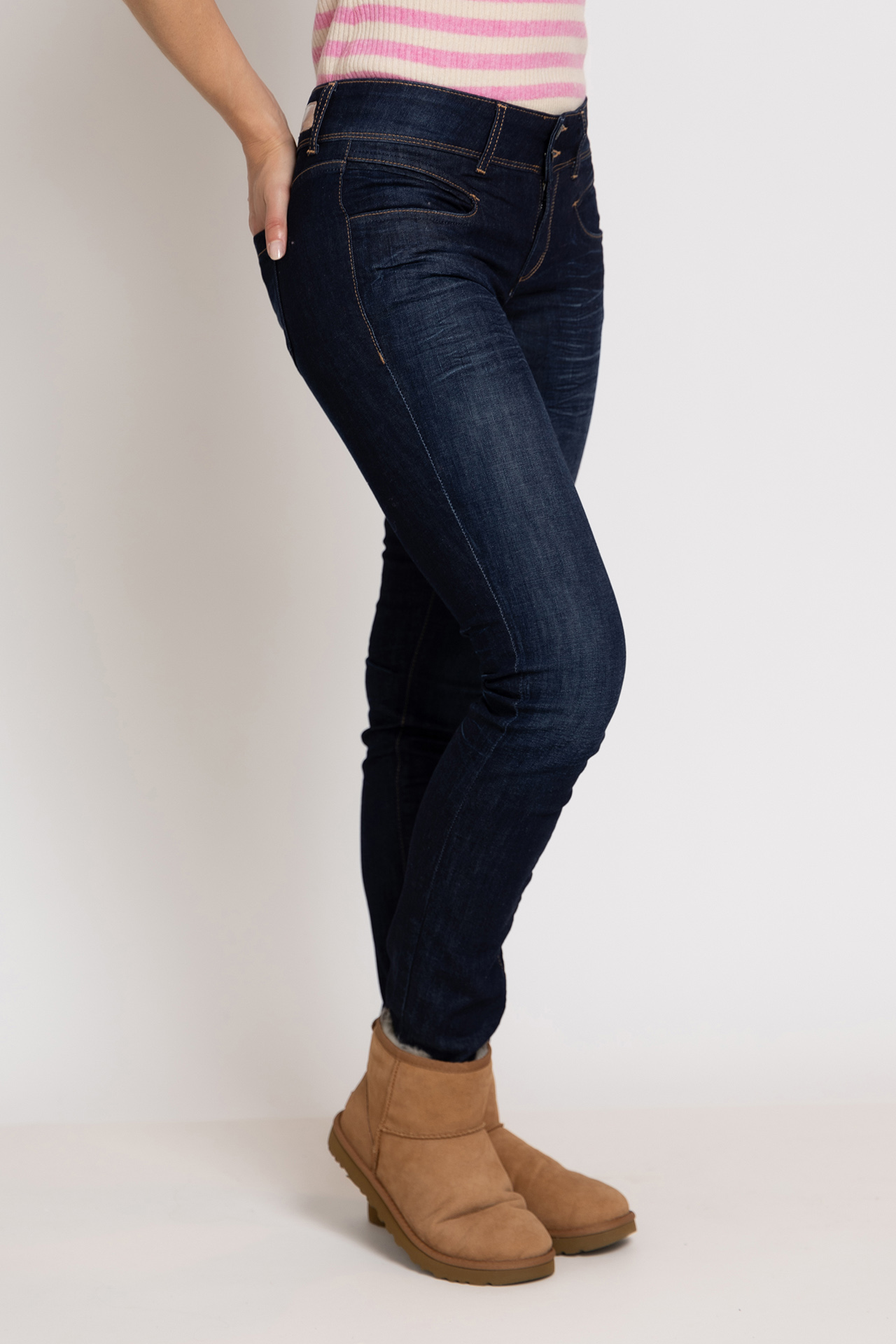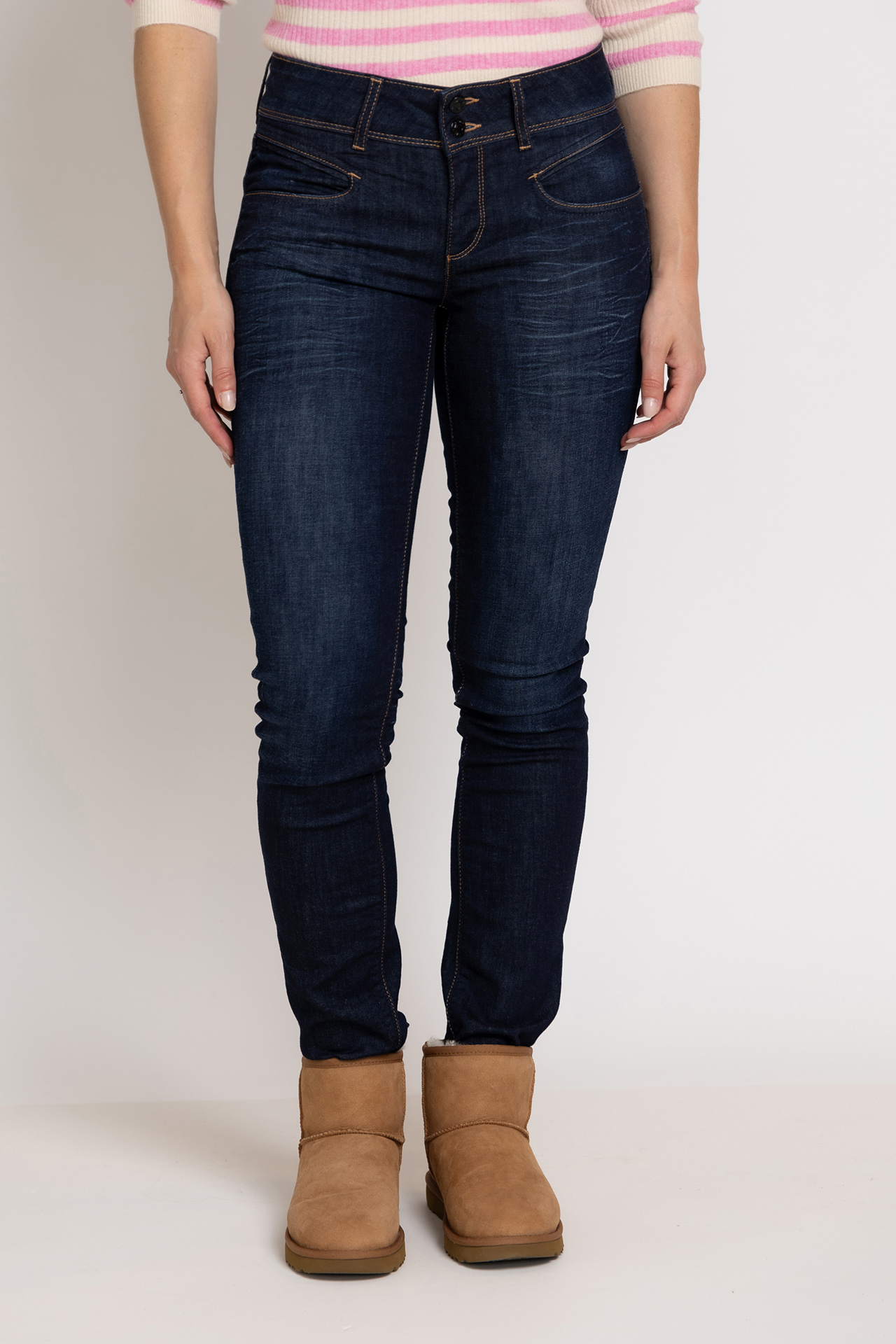 Donkere skinny jeans met 2 knopen in de taille en lusjes in de band voor een ceintuur. Hij heeft steekzakken aan de voorkant, opgestikte zakken aan de achterkant en bruine stiksels