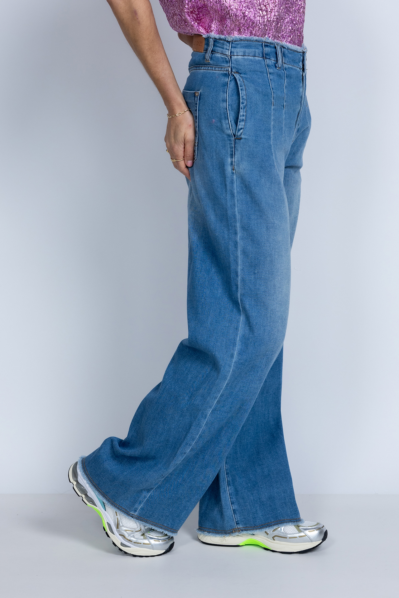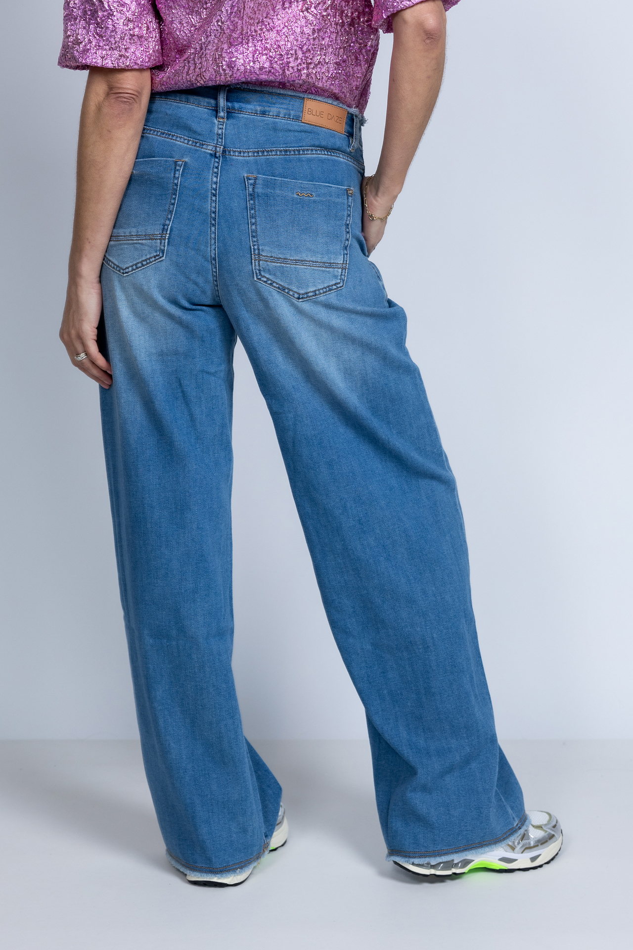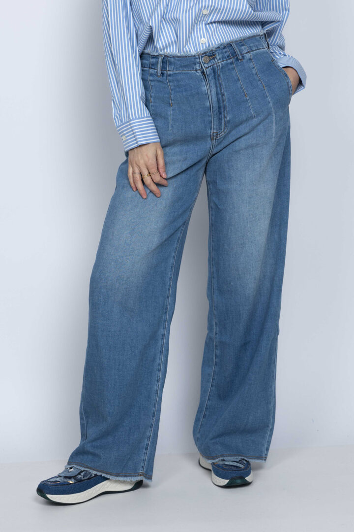 Soepel vallende jeans met wijde pijpen, een knoop- en ritssluiting en lusjes in de band voor een ceintuur. Hij heeft steekzakken aan de voorkant, opgestikte zakken aan de achterkant en een rafelrandje aan de onderkant