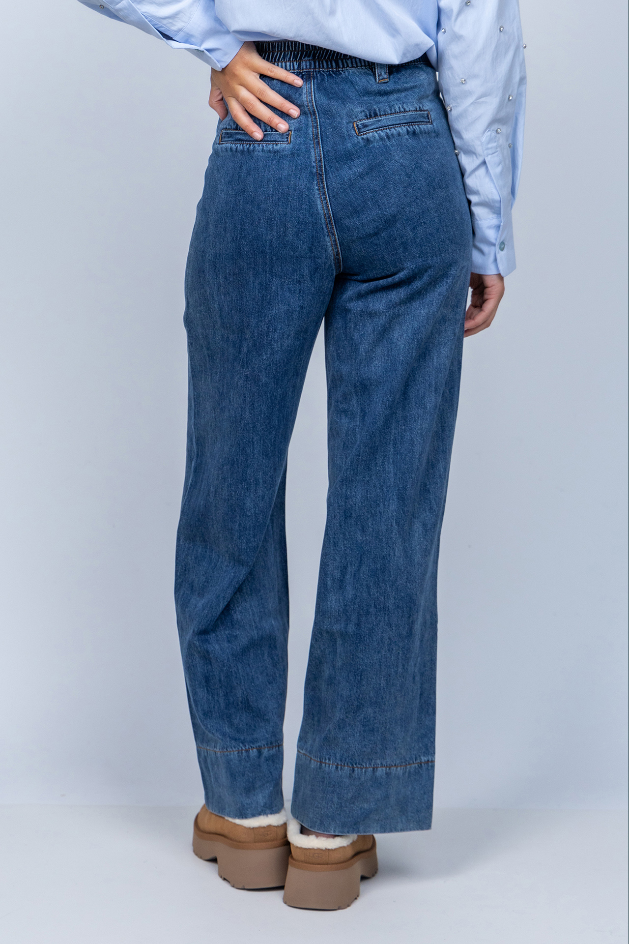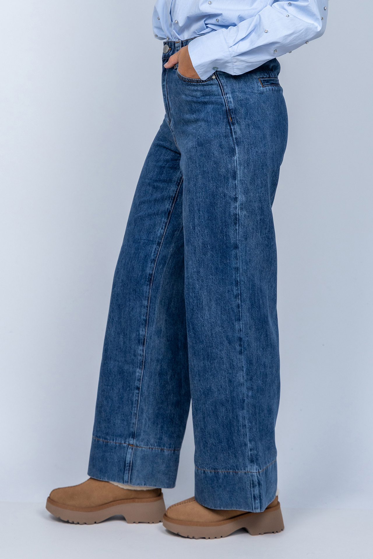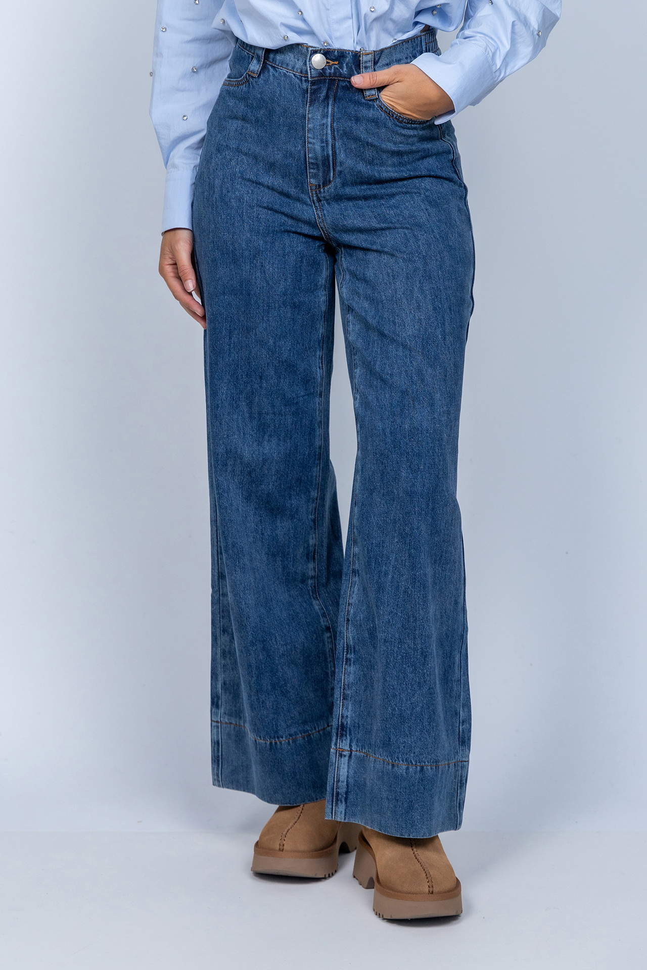Jeans met wijde pijpen, een knoop- en ritssluiting en lusjes in de band voor een ceintuur. Hij heeft steekzakken aan de voorkant, fake zakken aan de achterkant en een grote zoom aan de onderkant