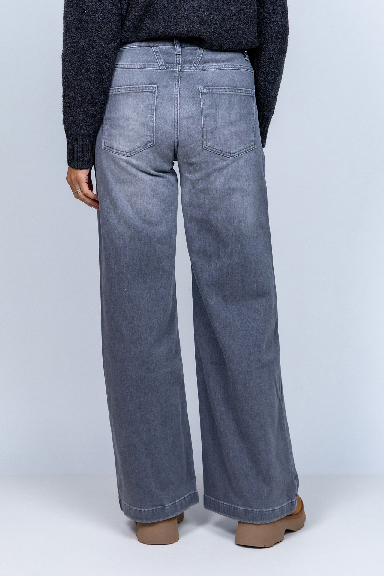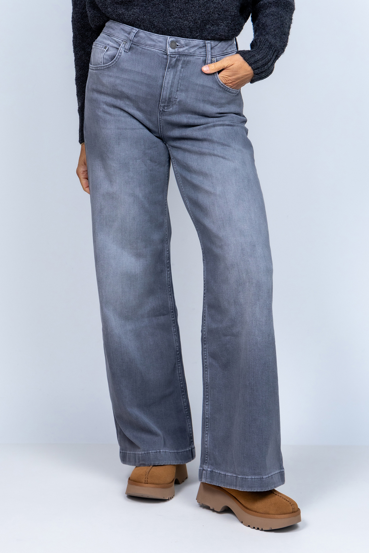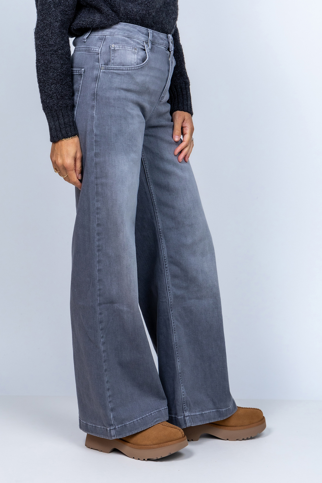 Grijze jeans met wijde pijpen, een knoop- en ritssluiting en lusjes in de band voor een ceintuur. Hij heeft steekzakken aan de voorkant, opgestikte zakken aan de achterkant en er zit stretch in de stof waardoor hij heerlijk zit