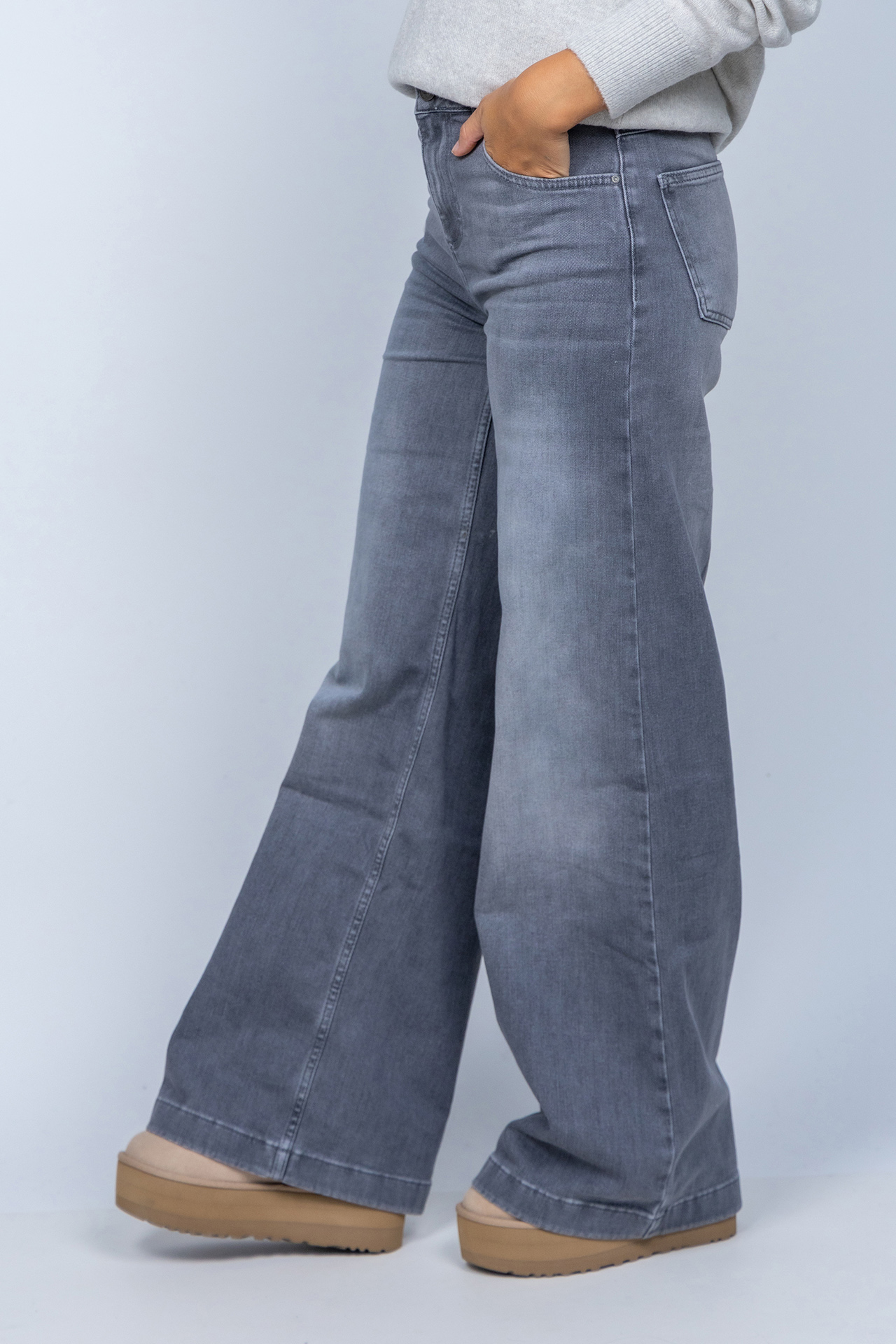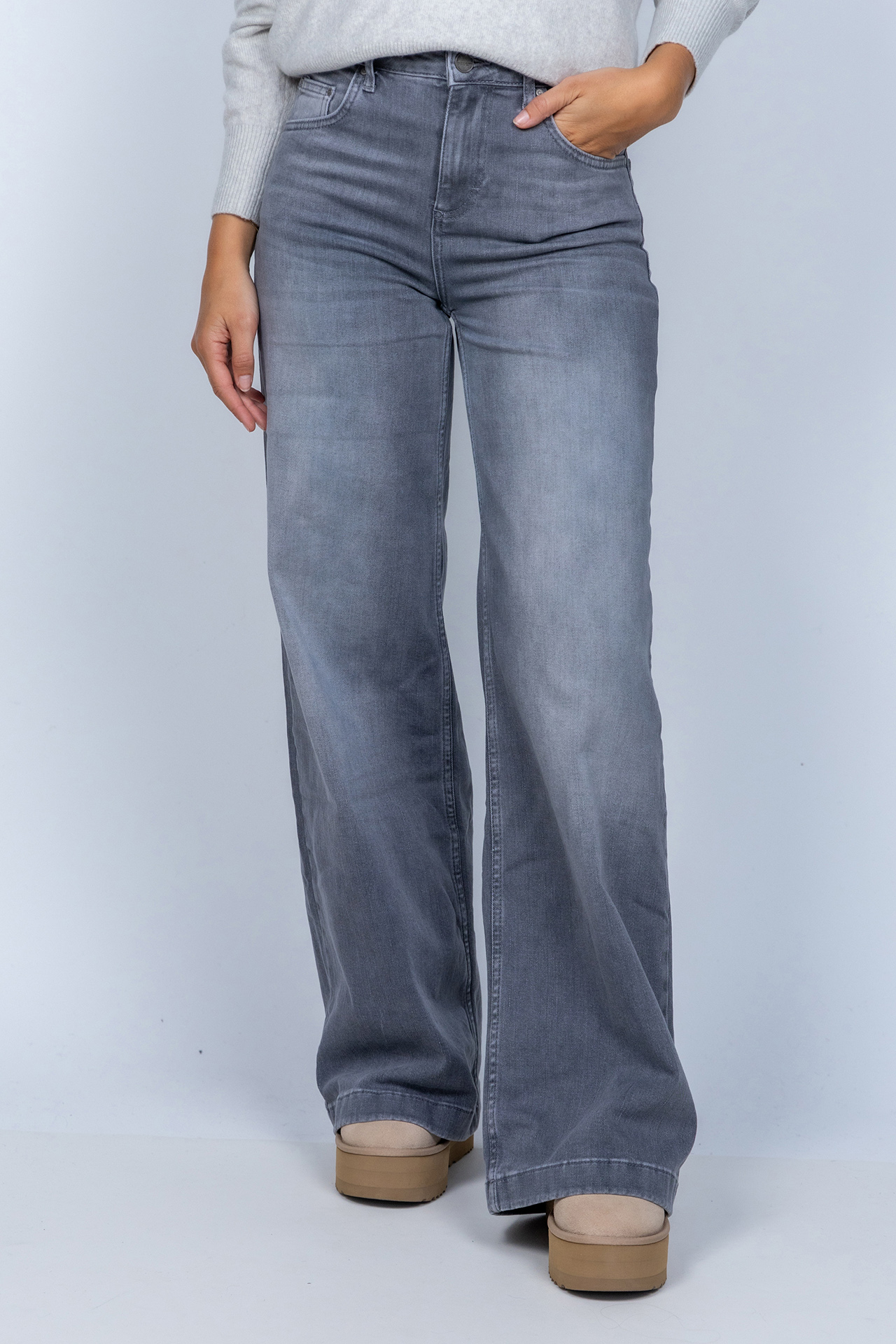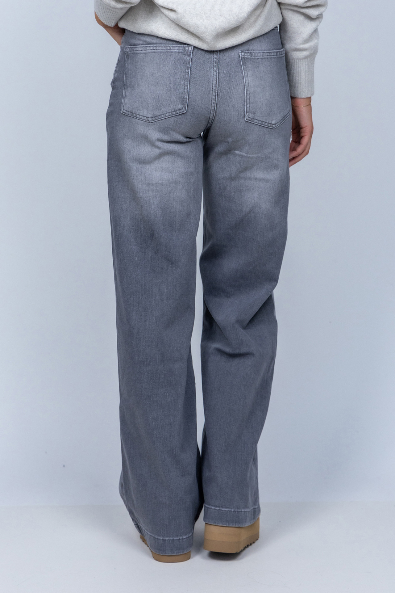 Grijze jeans met wijde pijpen, een knoop- en ritssluiting en lusjes in de band voor een ceintuur. Hij heeft steekzakken aan de voorkant, opgestikte zakken aan de achterkant en er zit stretch in de stof waardoor hij heerlijk zit