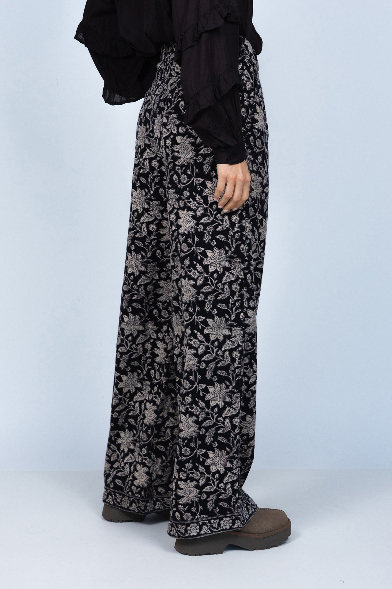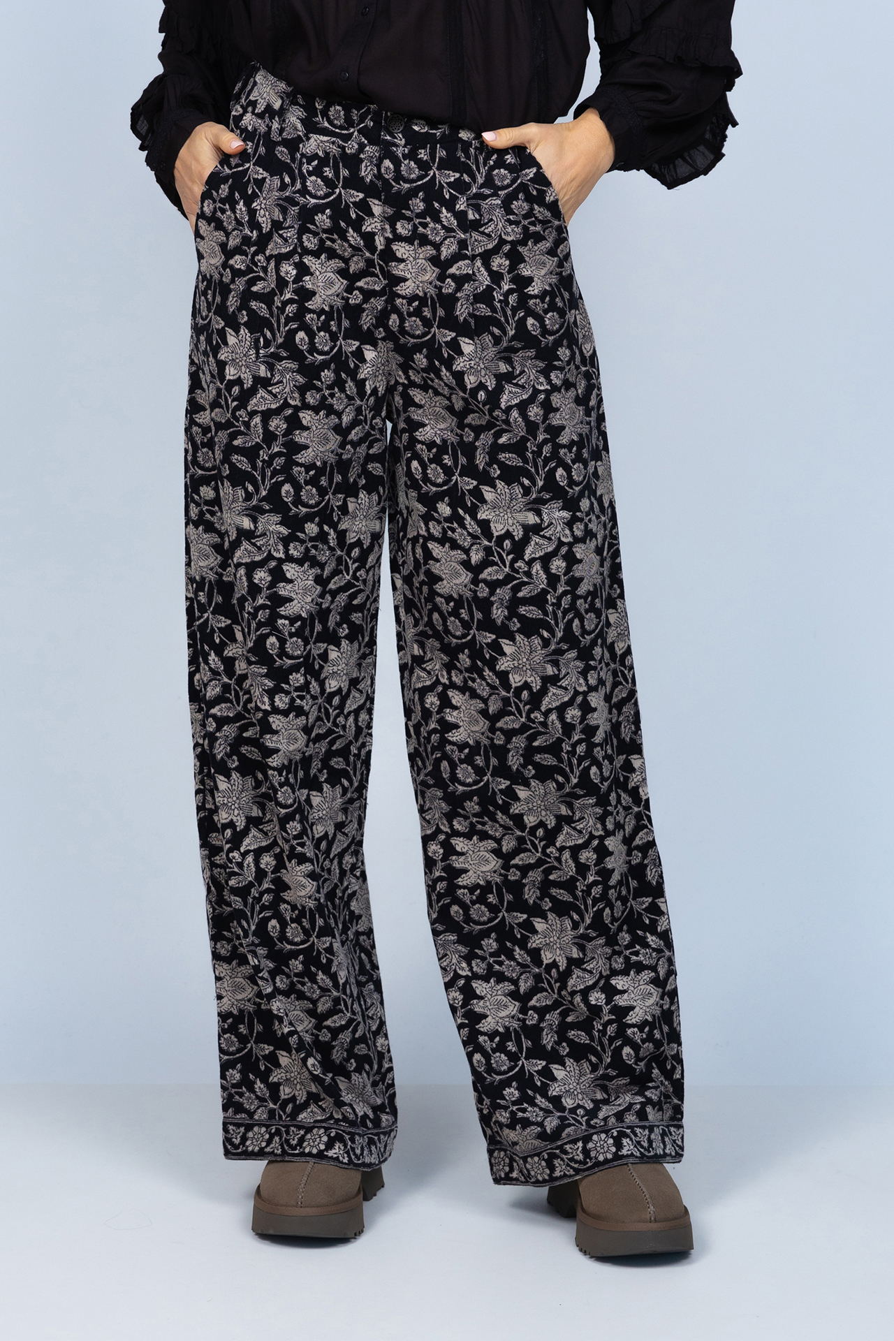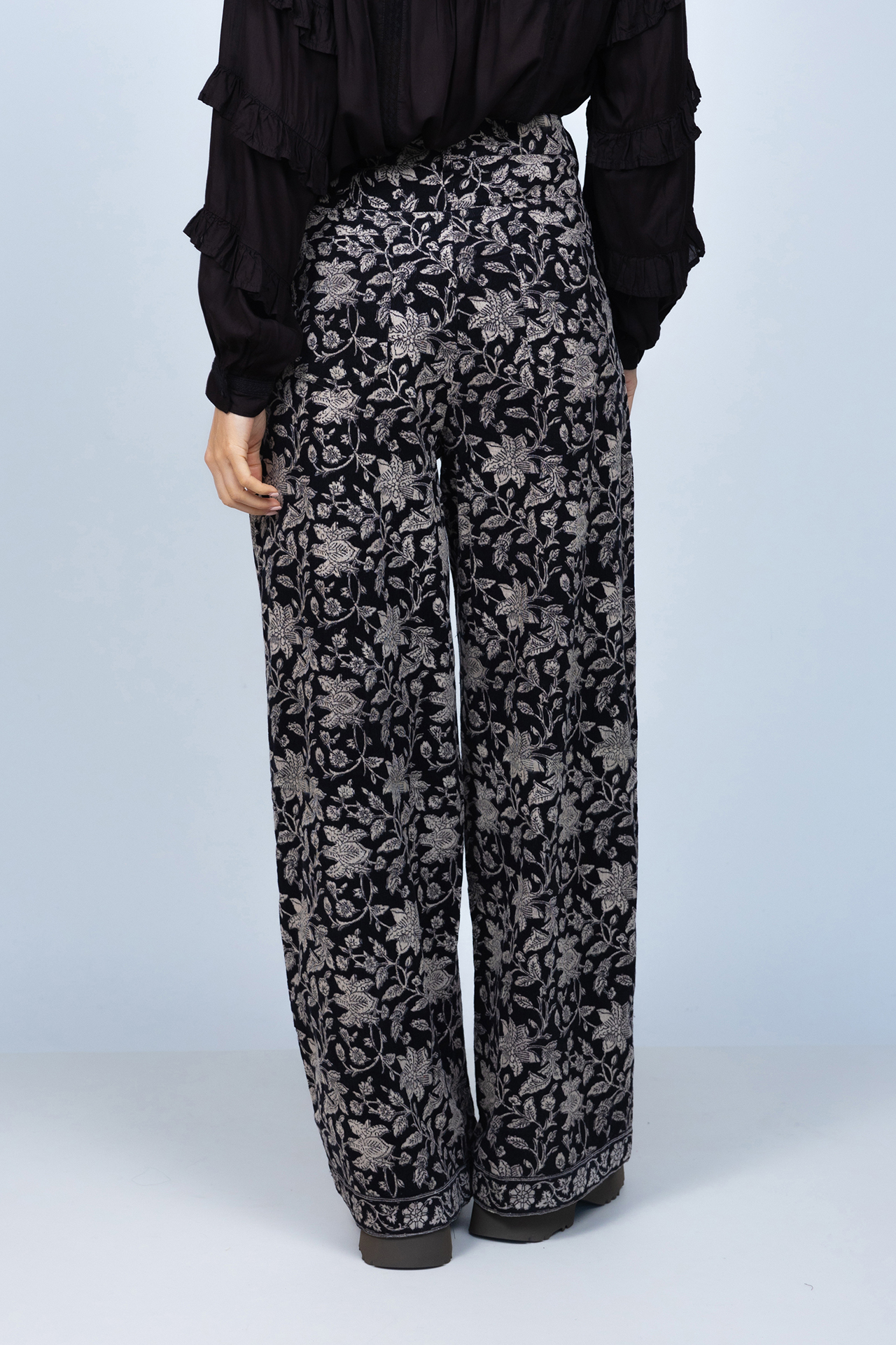 Broek met wijde pijpen, een knoop- en ritssluiting en steekzakken aan de voorkant. Hij heeft een bloemetjes dessin en is gemaakt van een fijne ribstof