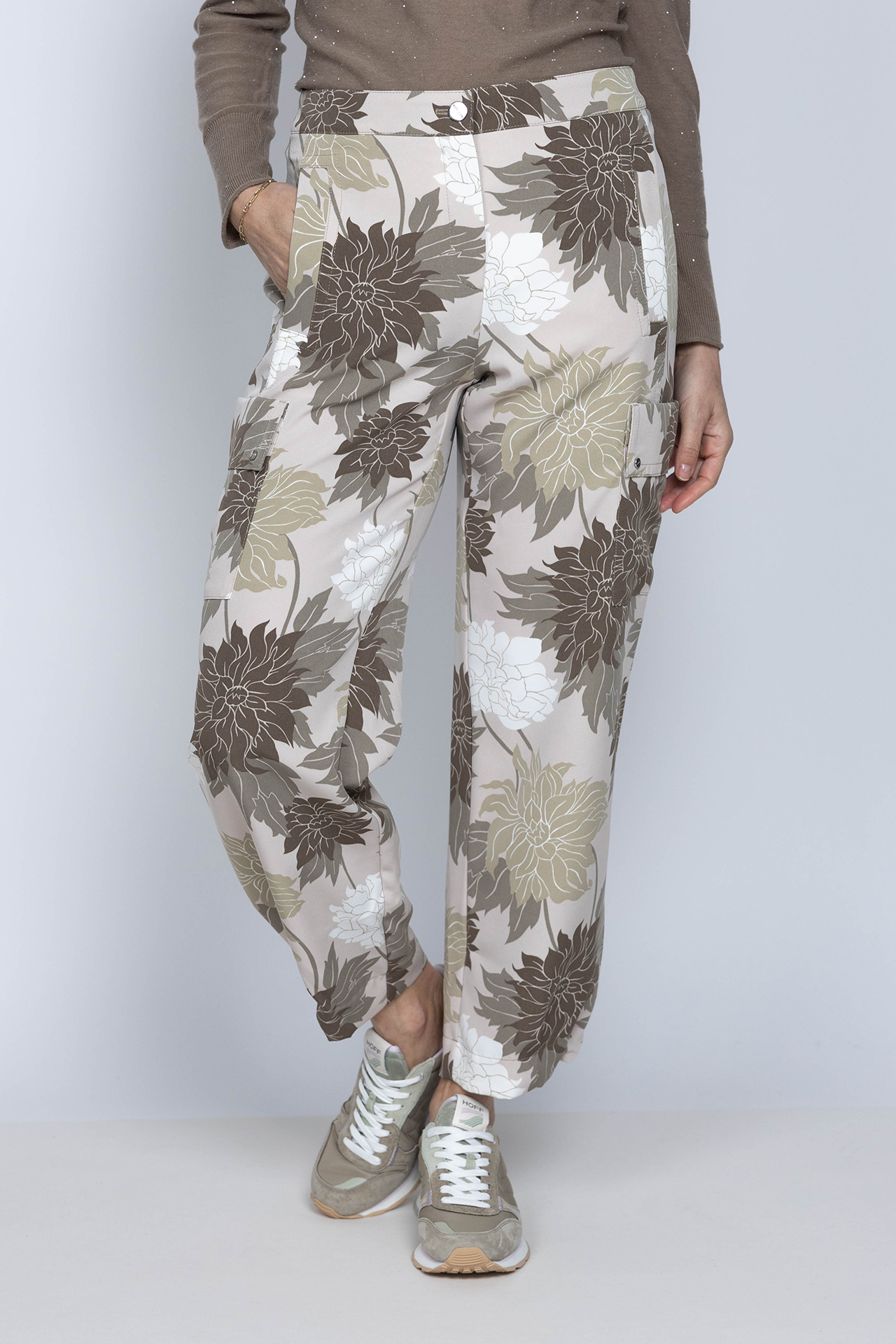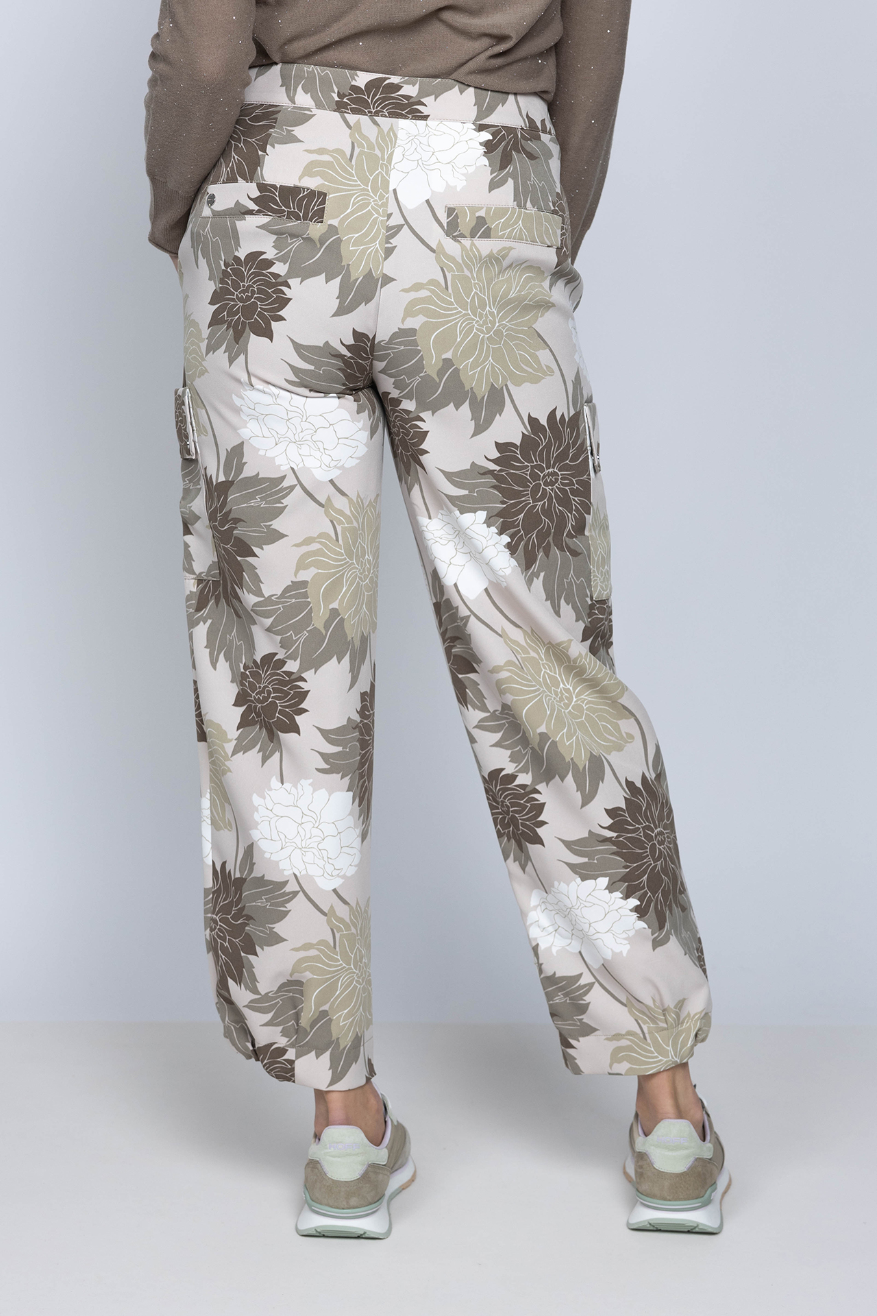 Workerbroek met een all-over bloemenprint en een knoop- en ritssluiting. Hij heeft steekzakken aan de voorkant, fake zakken aan de achterkant en klepzakken aan de zijkant. Ook zit er stretch in de stof waardoor hij comfortabel zit