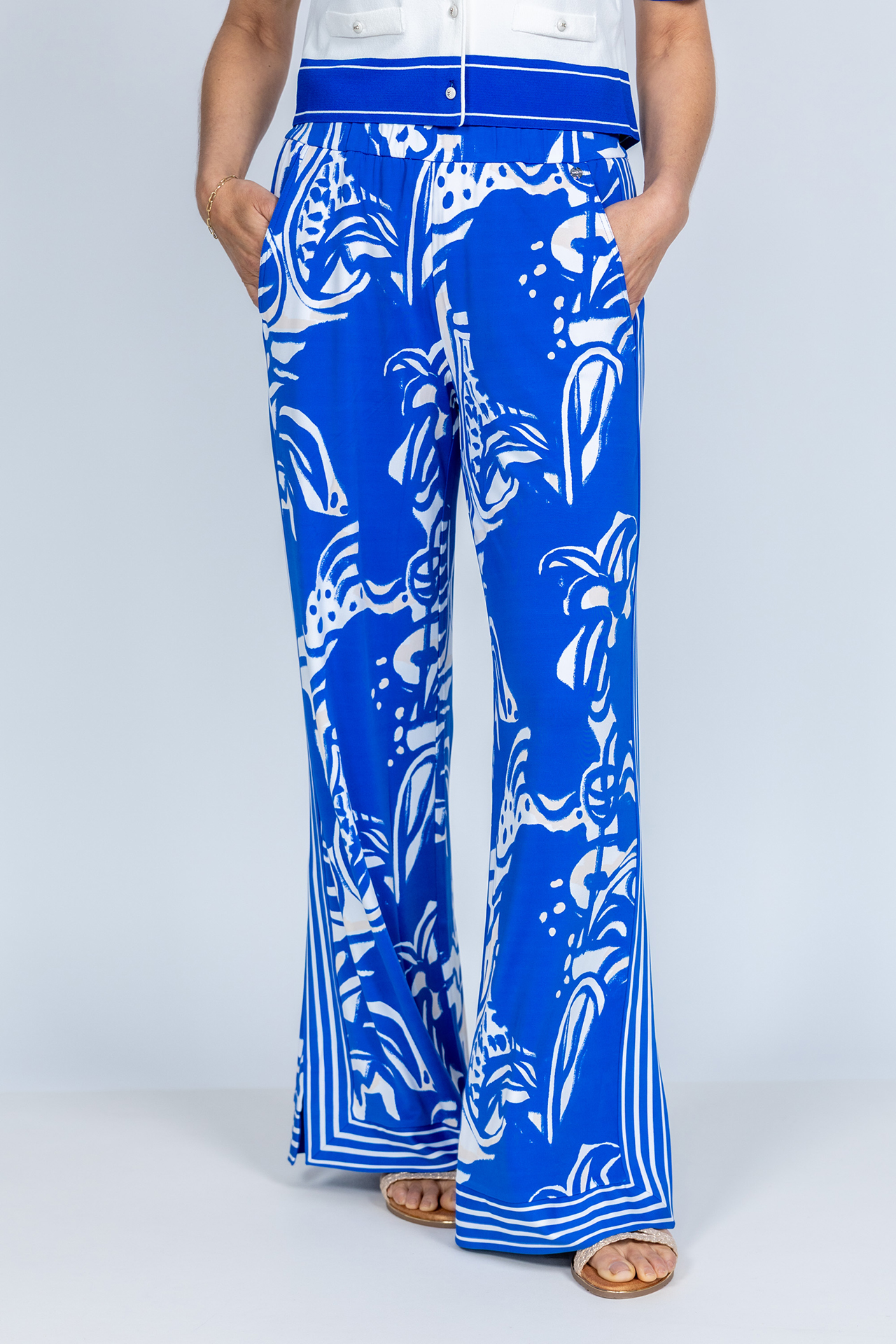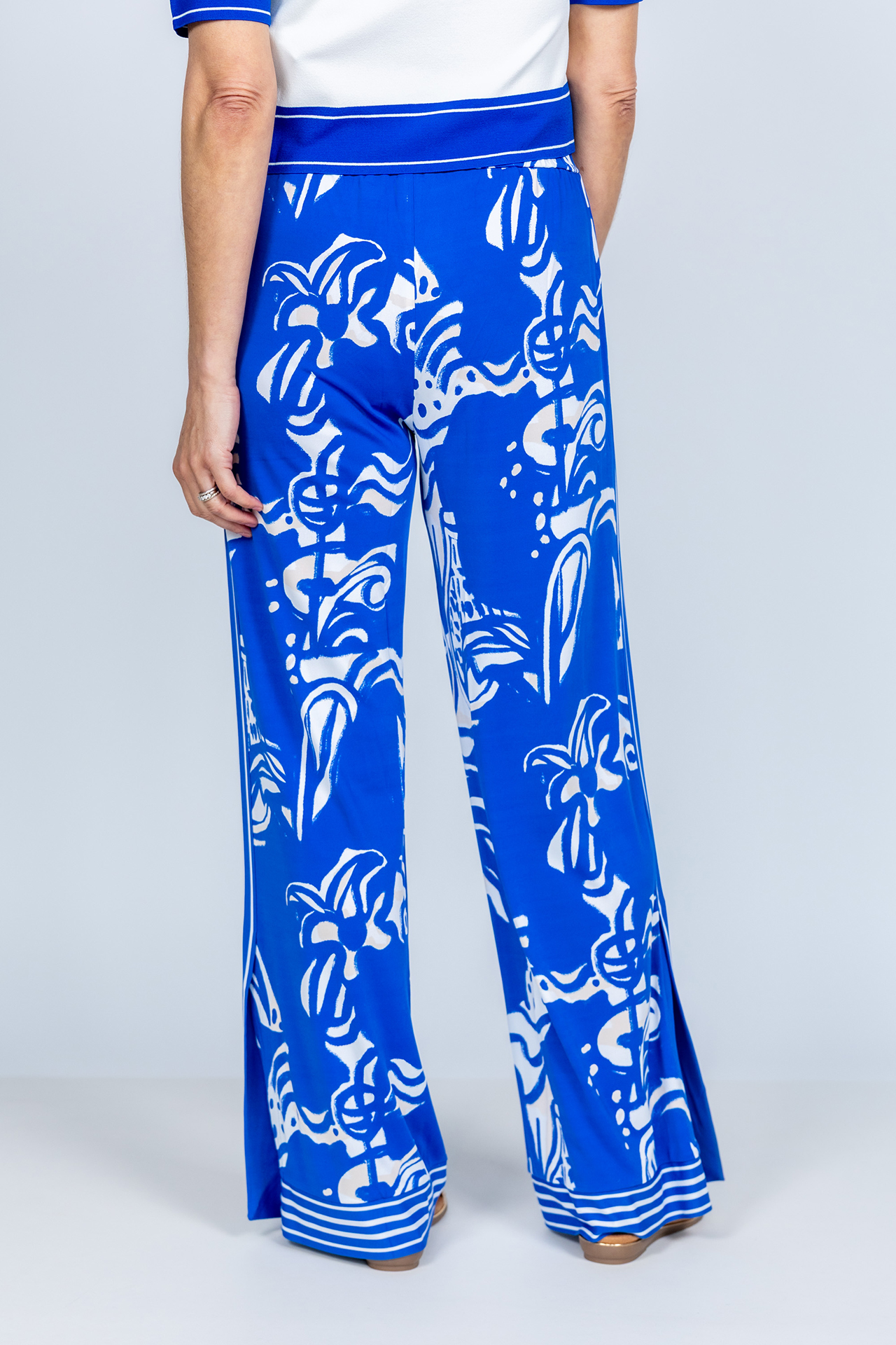 Soepel vallende pantalon met een all-over dessin en elastische band in de taille. Hij heeft steekzakken aan de voorkant, hoge splitten aan de zijkant en stretch in de stof waardoor hij comfortabel draagt