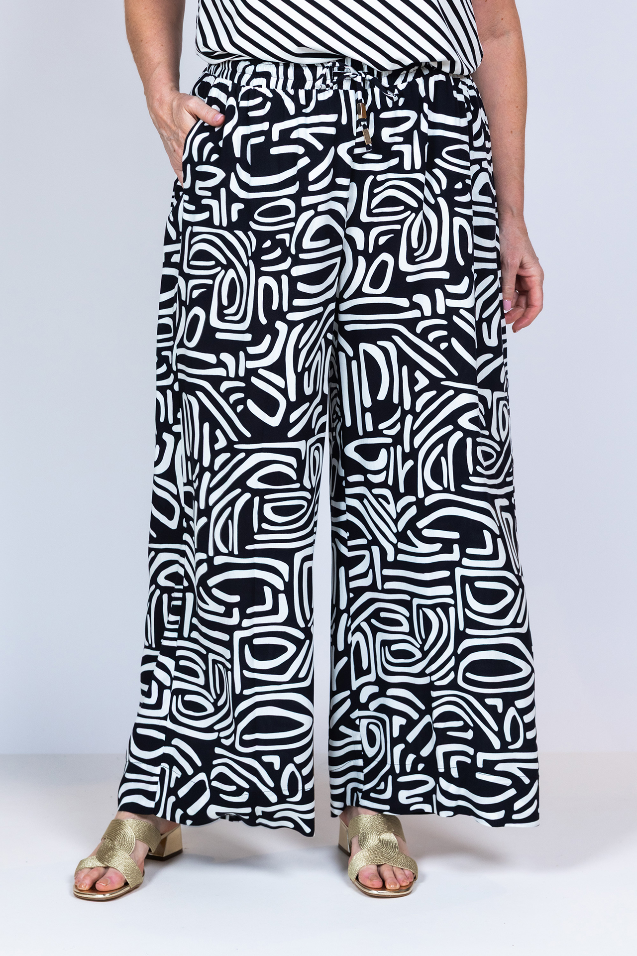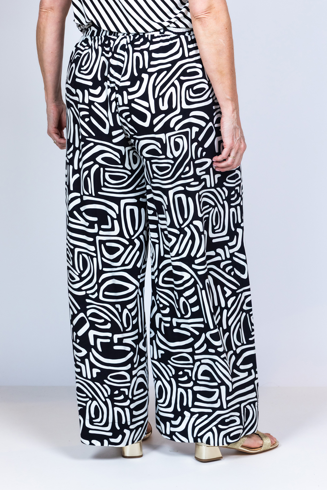 Viscose broek met een elastische band met koordje in de taille, een zwart/witte all-over print en steekzakken aan de voorkant