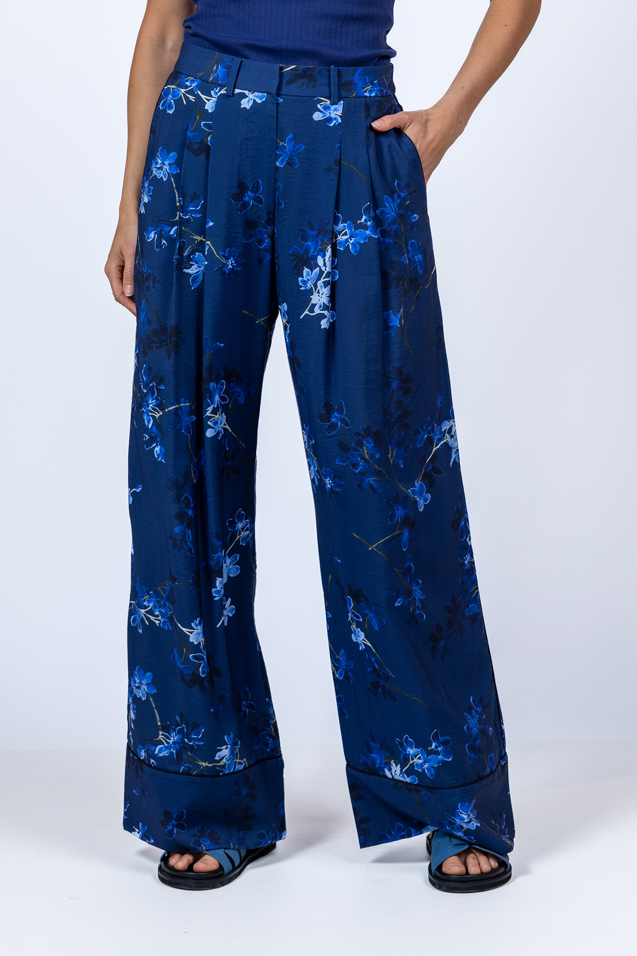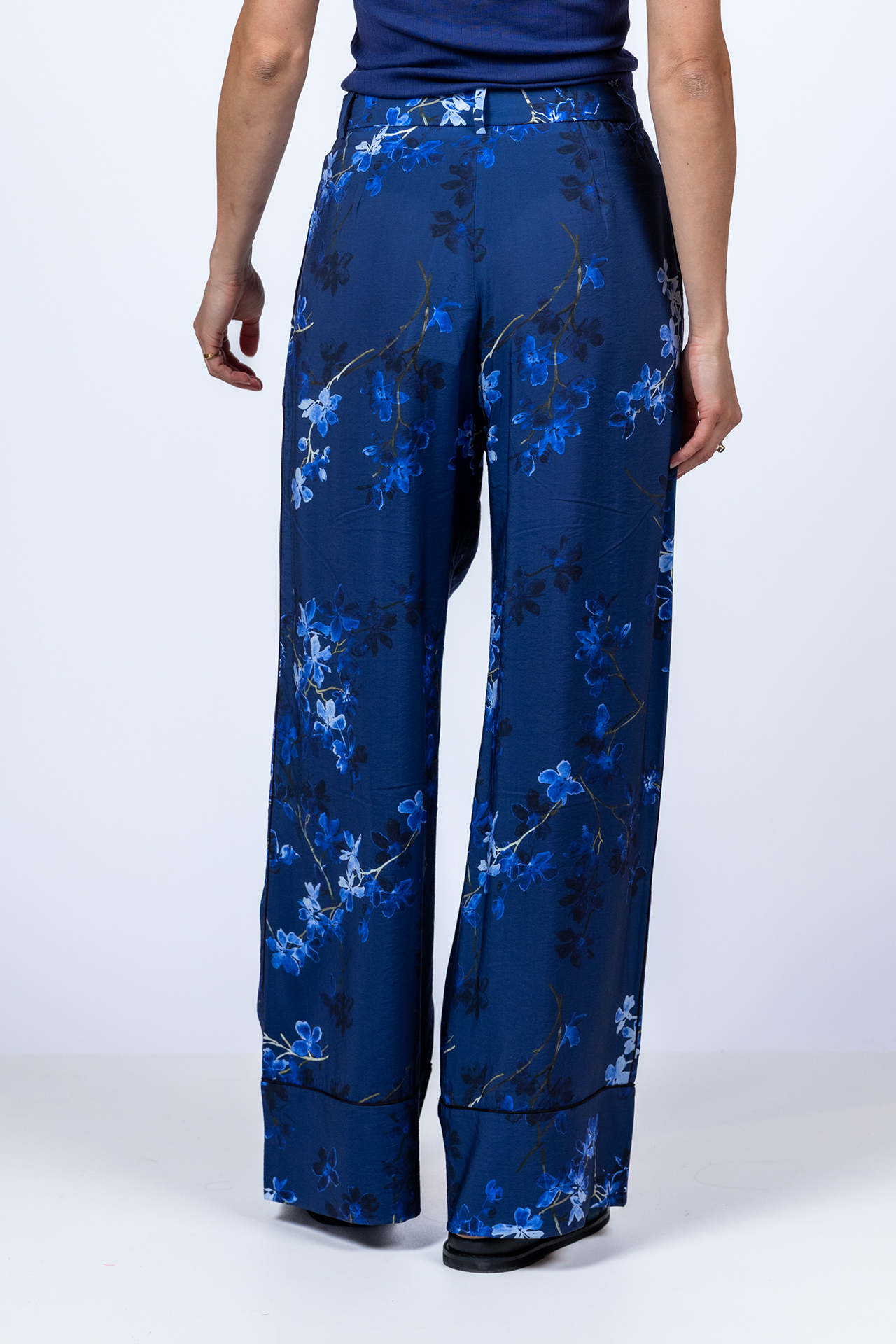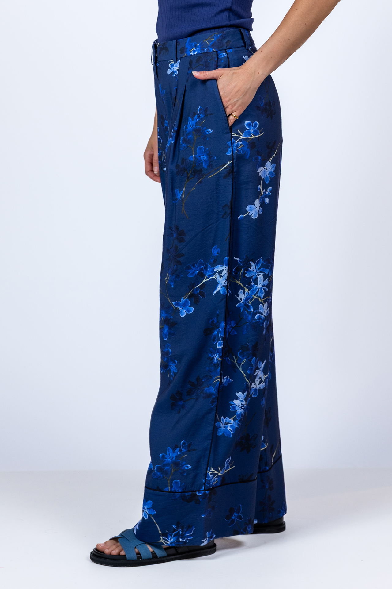 Broek met een haak- en ritssluiting en bandplooi. Hij heeft steekzakken aan de voorkant, een uniek bloemdessin in verschillende blauwtinten en een hoge zoom aan de onderkant
