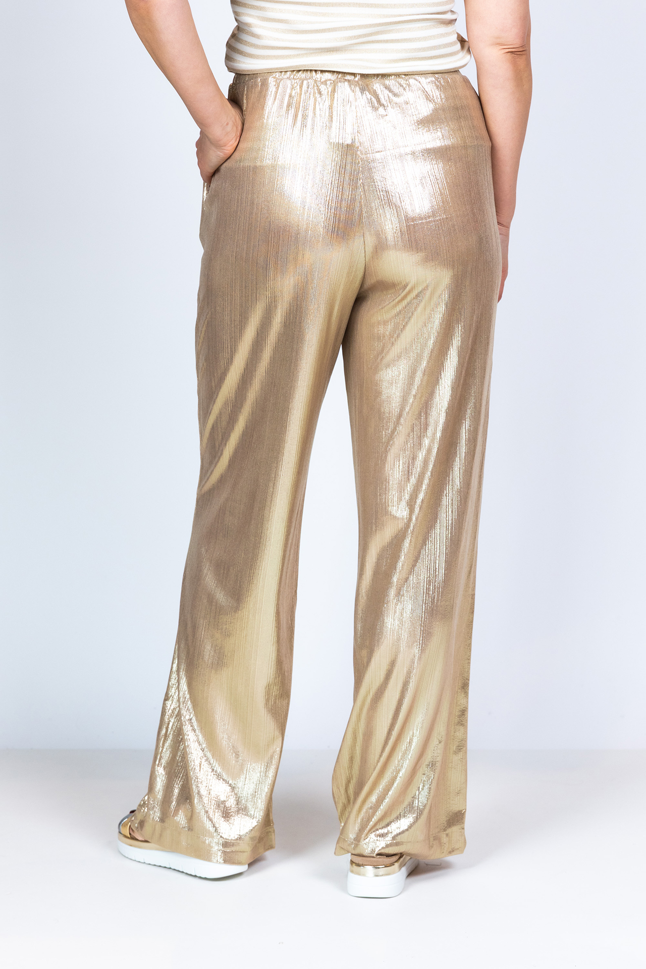 Gouden broek met wijde pijpen, een elastische band met koordje in de taille en steekzakken aan de voorkant