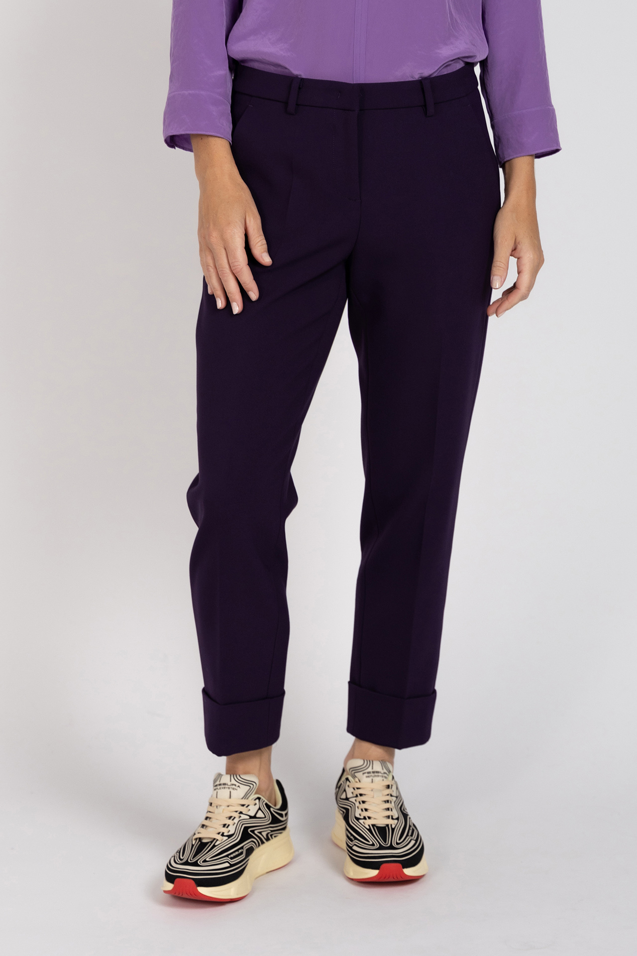 7/8 pantalon met een haak- en ritssluiting, lusjes in de band voor een ceintuur, steekzakken aan de voorkant en fake zakken aan de achterkant. Ook zit er stretch in de stof en heeft hij een omslag