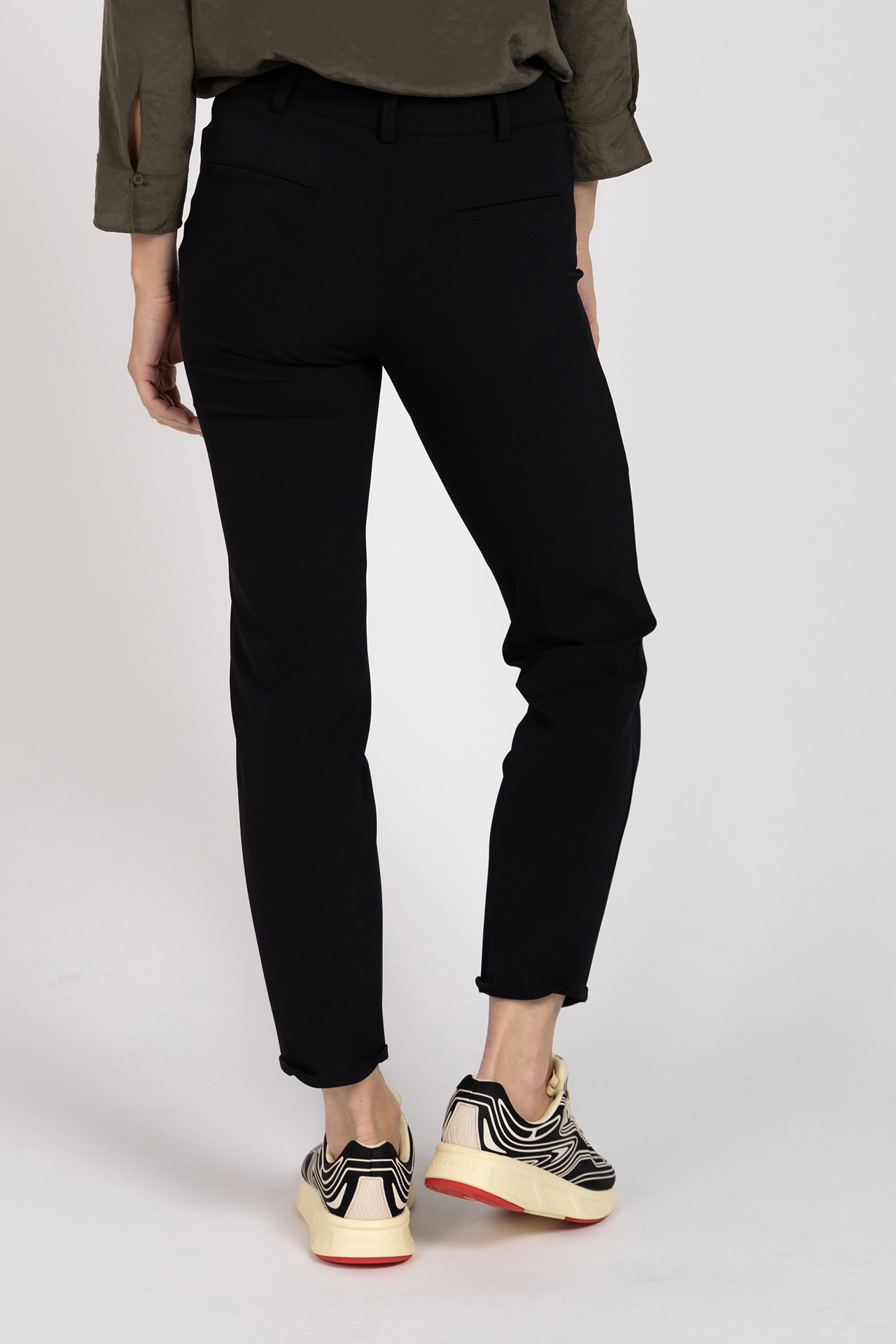 7/8 pantalon met een knoop- en ritssluiting, lusjes in de band voor een ceintuur, steekzakken aan de voorkant en fake zakken aan de achterkant. Ook zit er veel stretch in de stof en heeft hij een kleine omslag