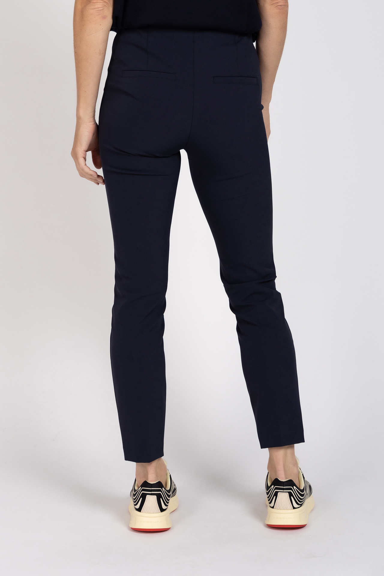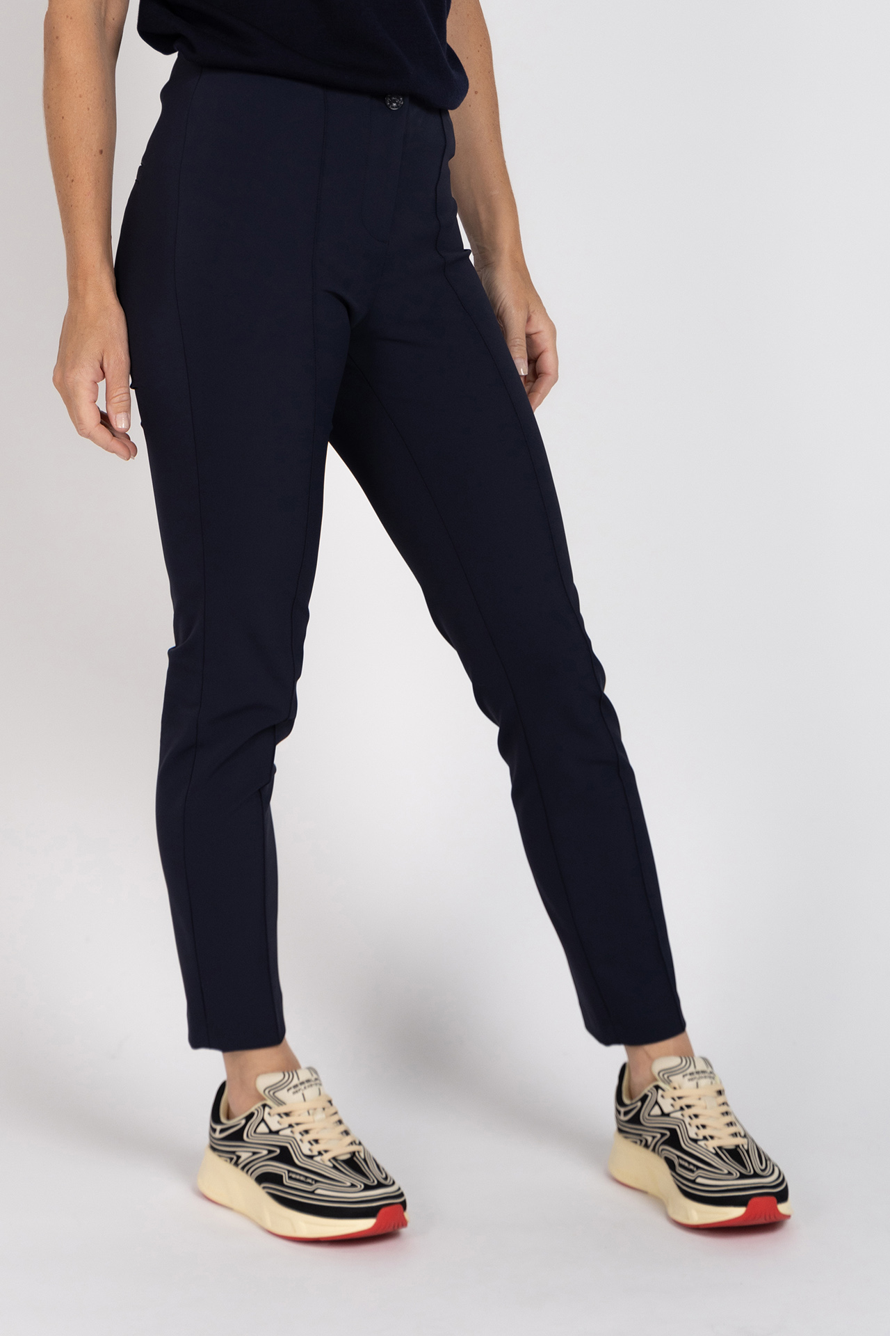 Donkerblauwe pantalon met een elastische band, knoop- en ritssluiting en hij heeft een stiknaad aan de voorkant