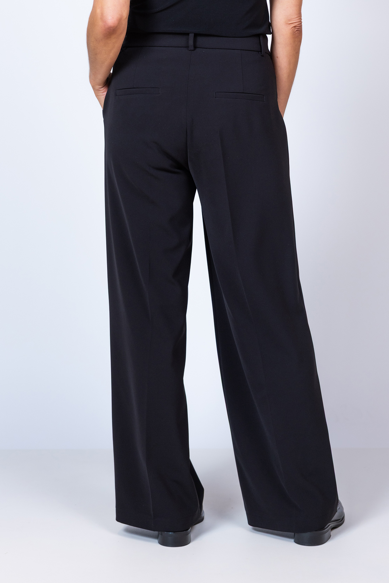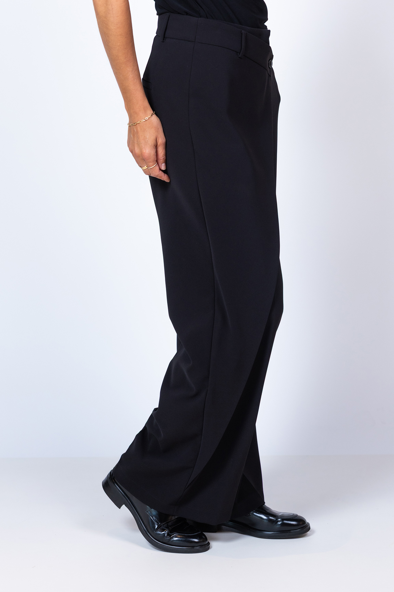 Pantalon met een haak- en ritssluiting en lusjes in de band voor een ceintuur. Hij heeft een overslag met knoop aan de voorkant, aan 1 kant een zak en fake zakken aan de achterkant