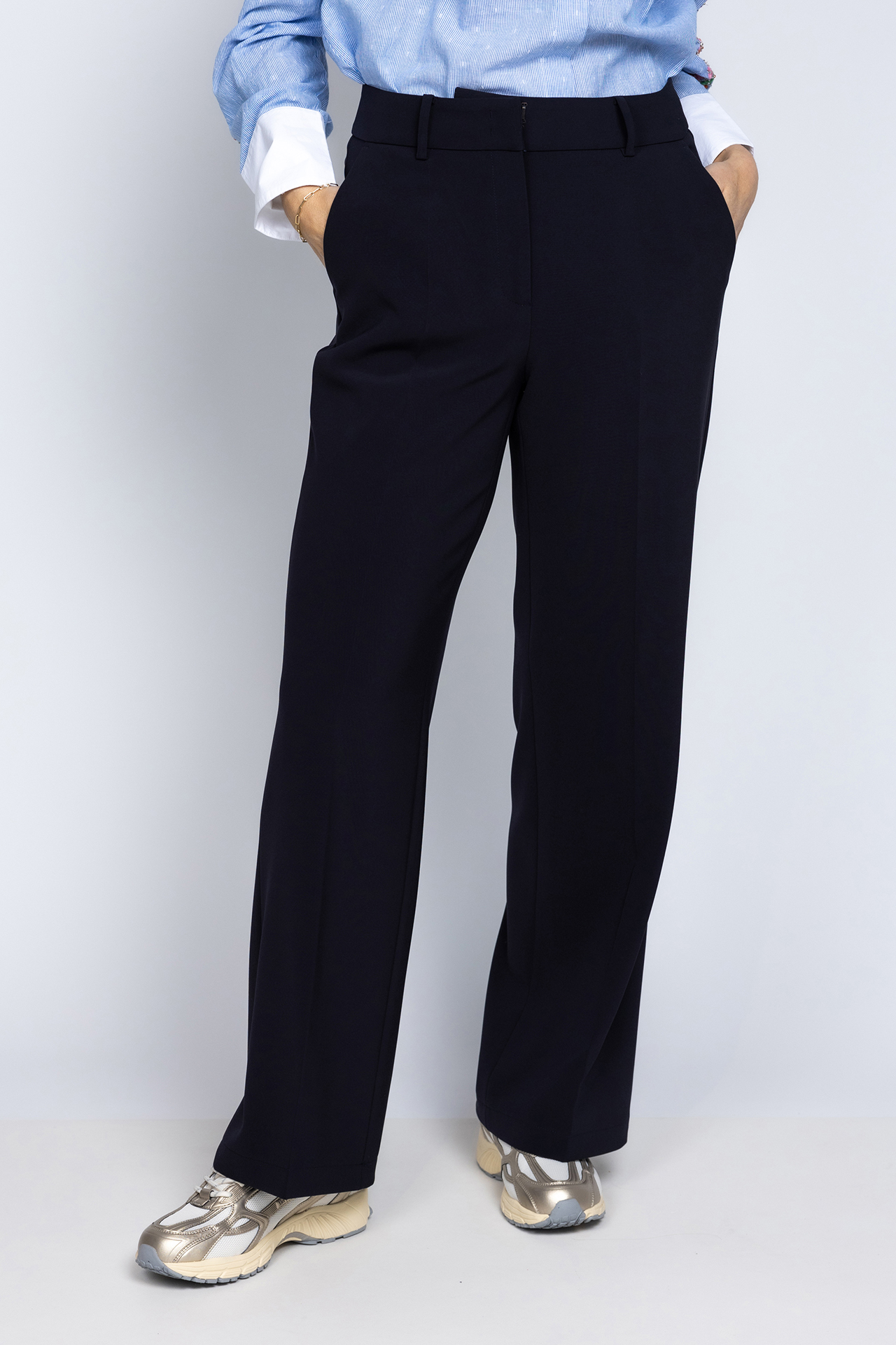 Soepel vallende pantalon met een haak- en ritssluiting en lusjes in de band voor een ceintuur. Hij heeft steekzakken aan de voorkant, fake zakken aan de achterkant en stretch in de stof waardoor hij mooi valt en comfortabel draagt