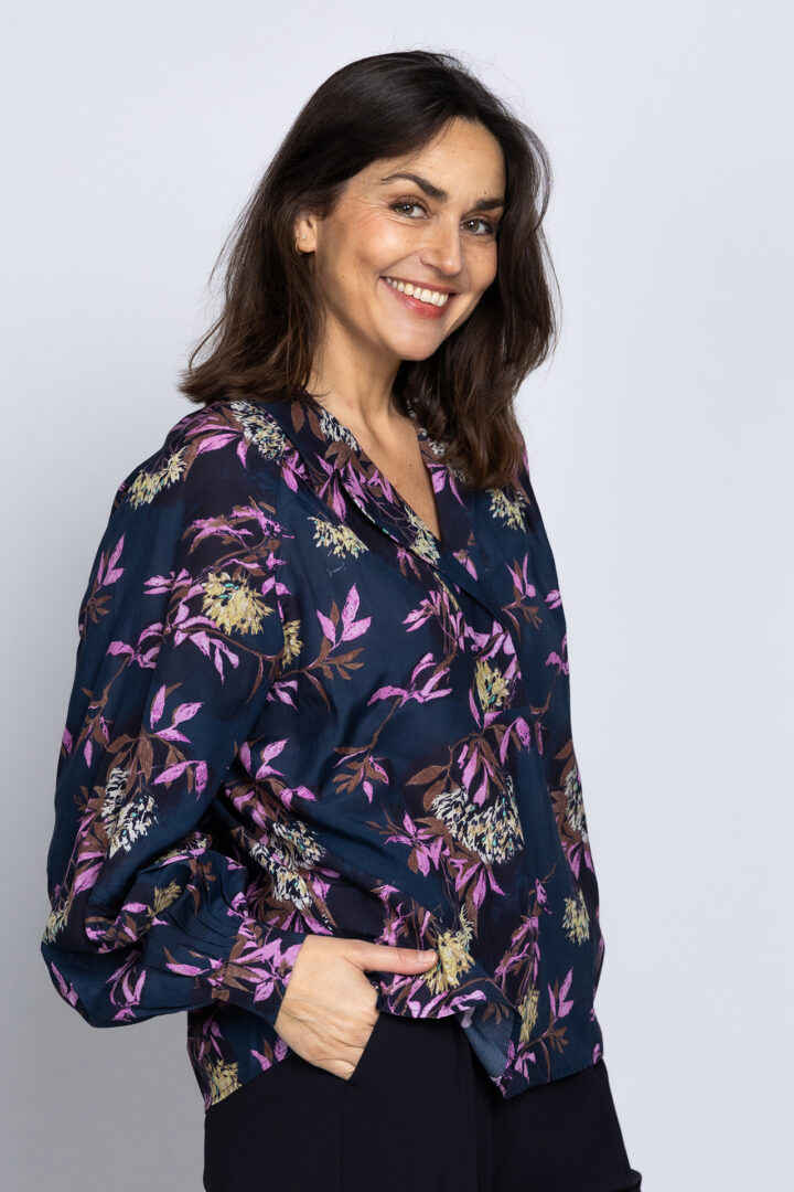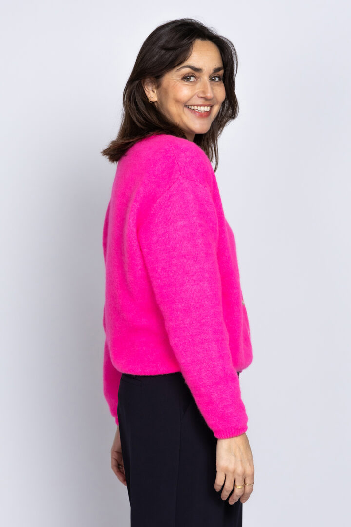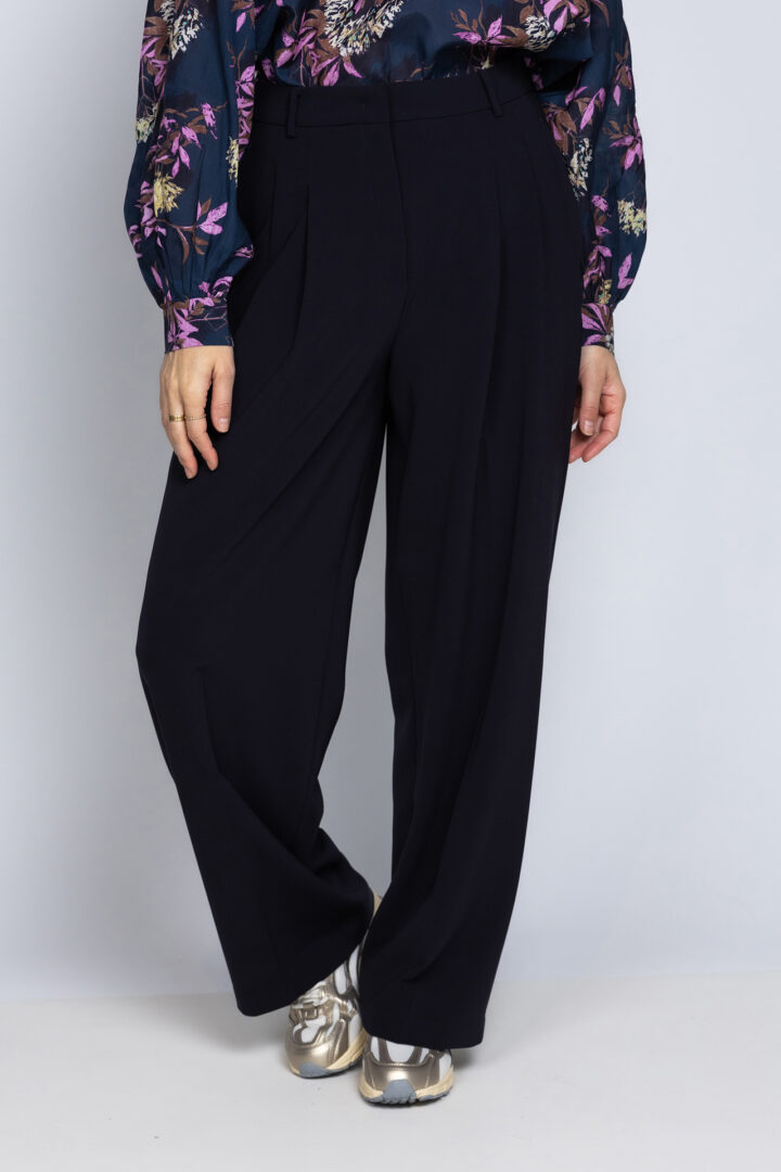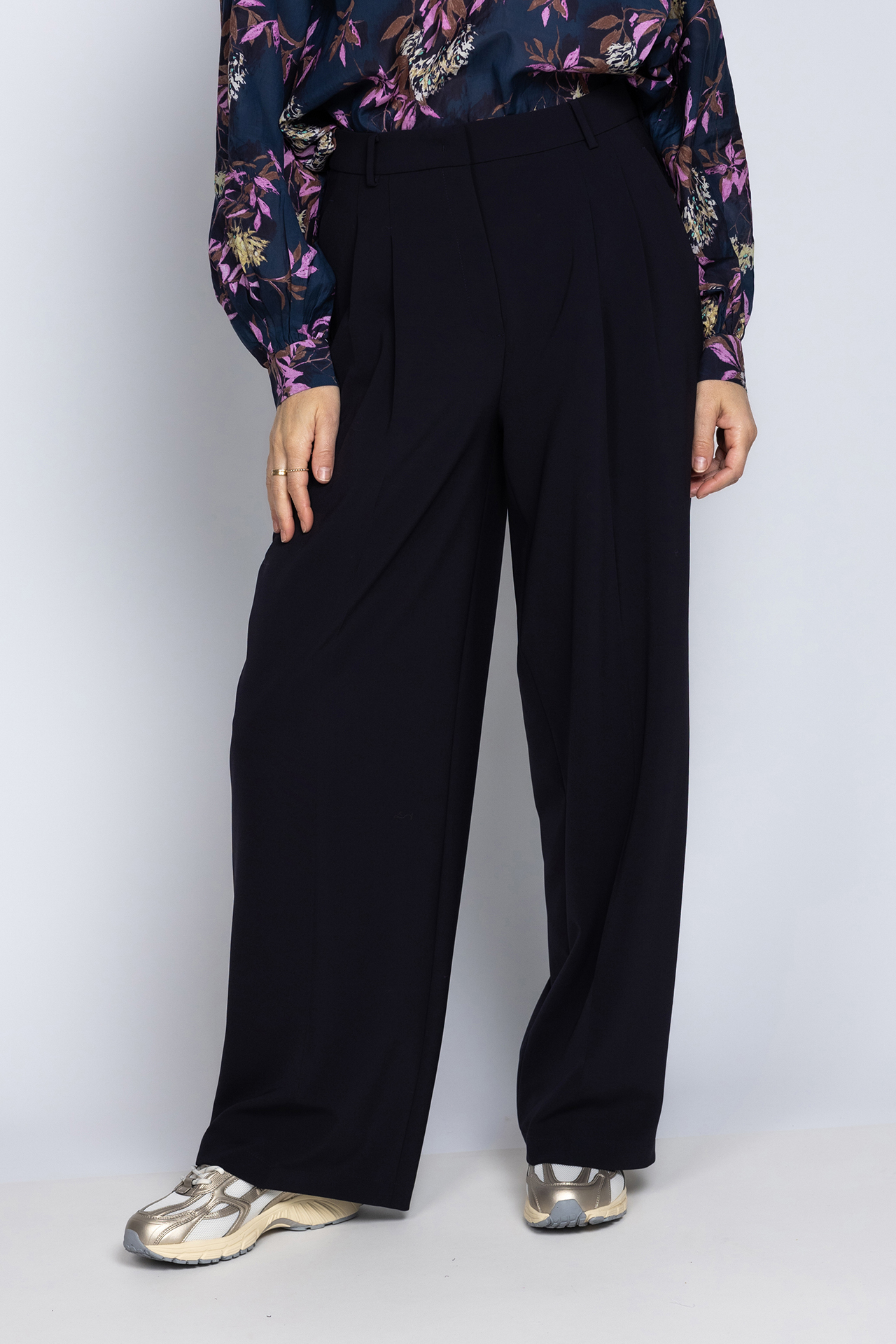 Wijde pantalon met een haak- en ritssluiting, lusjes in de band voor een ceintuur en bandplooi. Hij heeft steekzakken aan de voorkant, fake zakken aan de achterkant en stretch in de stof waardoor hij mooi valt en comfortabel draagt